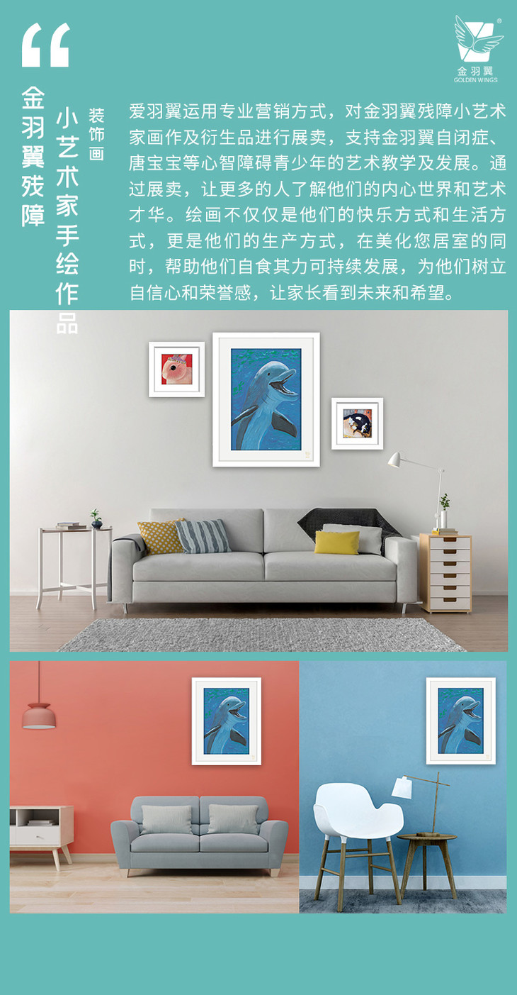 - 金羽翼将艺术与心理治疗相结合,用艺术教育的形式帮助残障青少年体现自身价值、提高生活质量、实现艺术梦想,并将绘画作品开发成衍生品销售,收入扣除成本后,20%返还给学员家庭,80%用于金羽翼艺术康复教学。