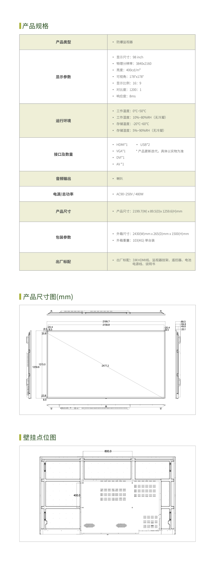98寸防爆液晶监视器 带OPS扩展卡 4K全视角16:9 内置音箱 L9H4KE