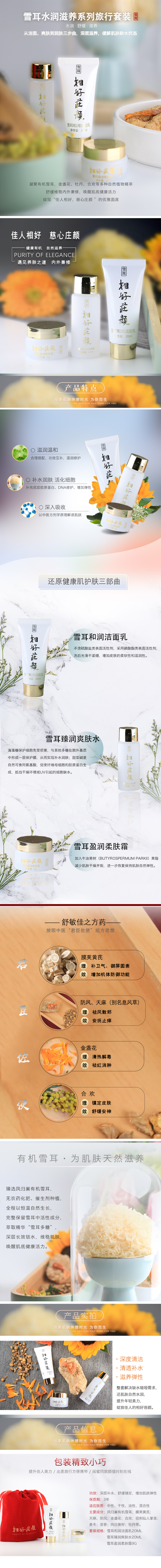 相好莊颜雪耳系列护肤品采用凤归巢有机雪耳作为主原材料,雪耳是“菌中明珠”,无农药化肥、无催生剂全程以恒温自然生长,完整保留雪耳中活性成分,从配方上保障肌肤的健康。萃取的雪耳多糖,拥有“植物透明质酸”美称,除锁水补水外,还能使肌肤柔软嫩滑,同时为肌肤补给充足的营养。