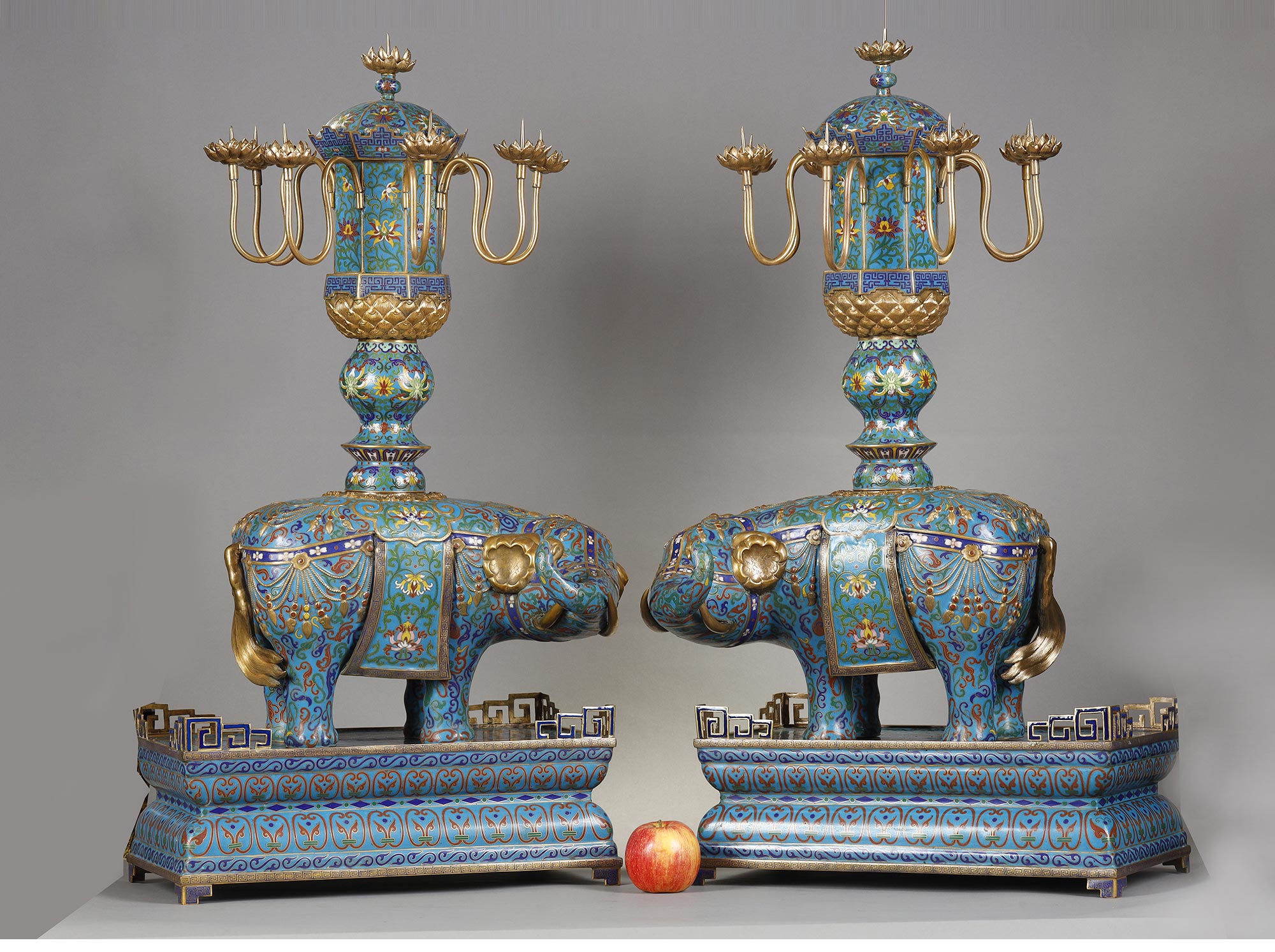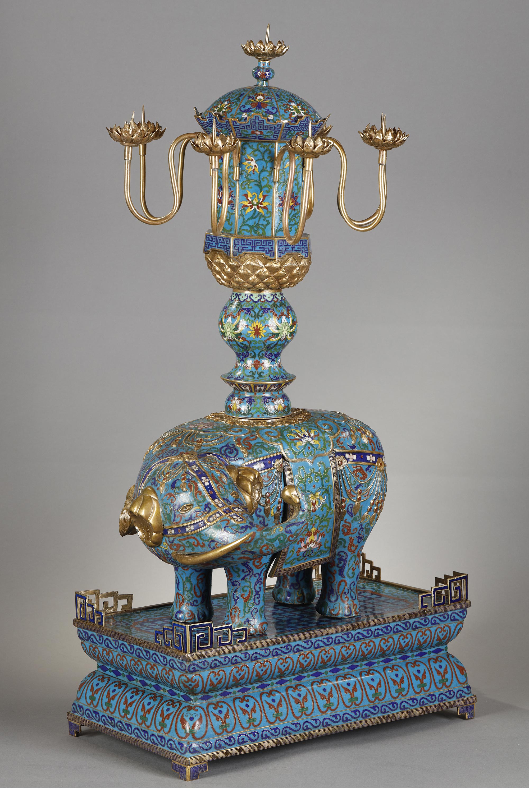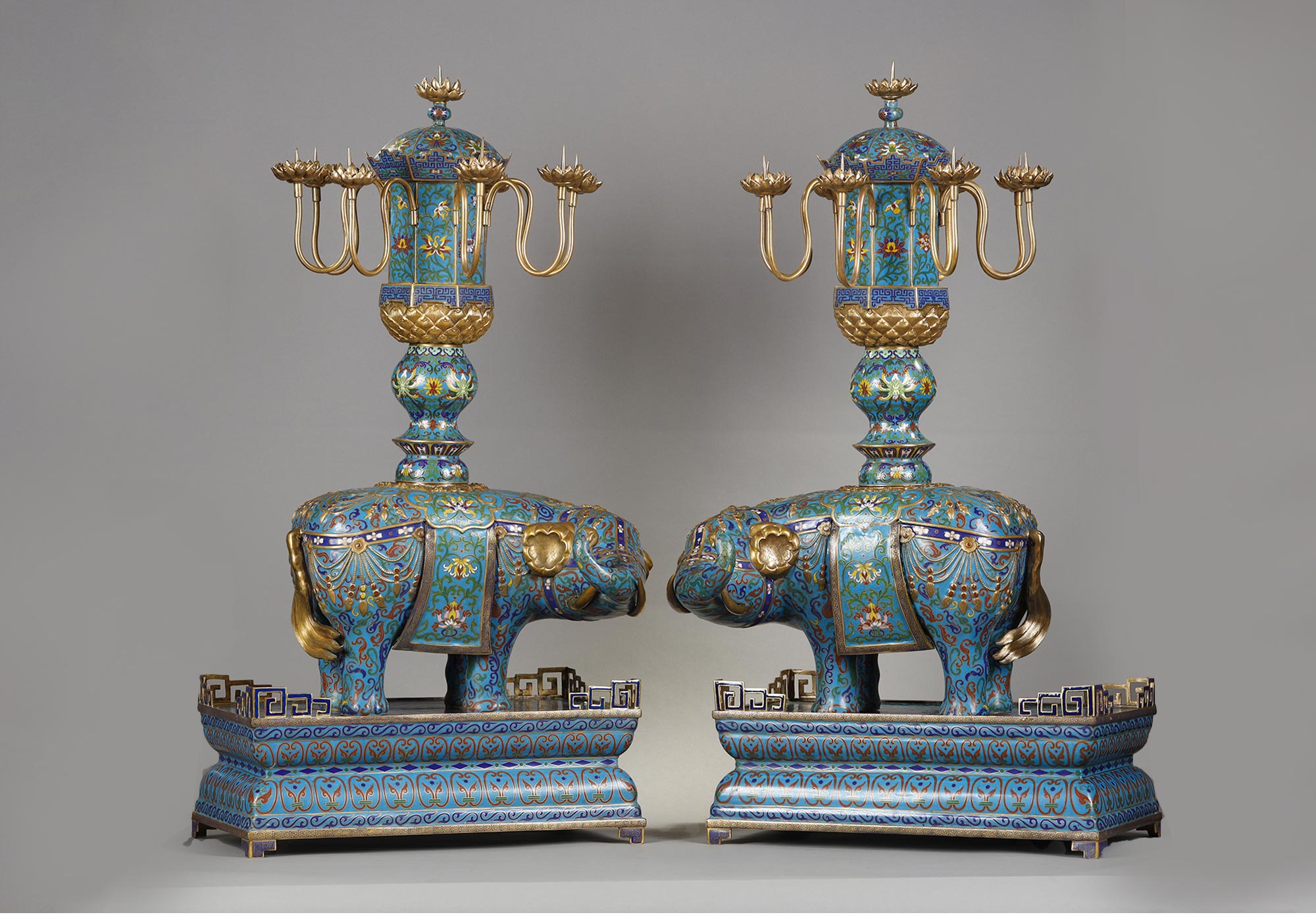 19世纪末中国晚清时期出品鎏金精雕装饰「太平有象」主题铜胎掐丝珐琅多枝头烛台一对