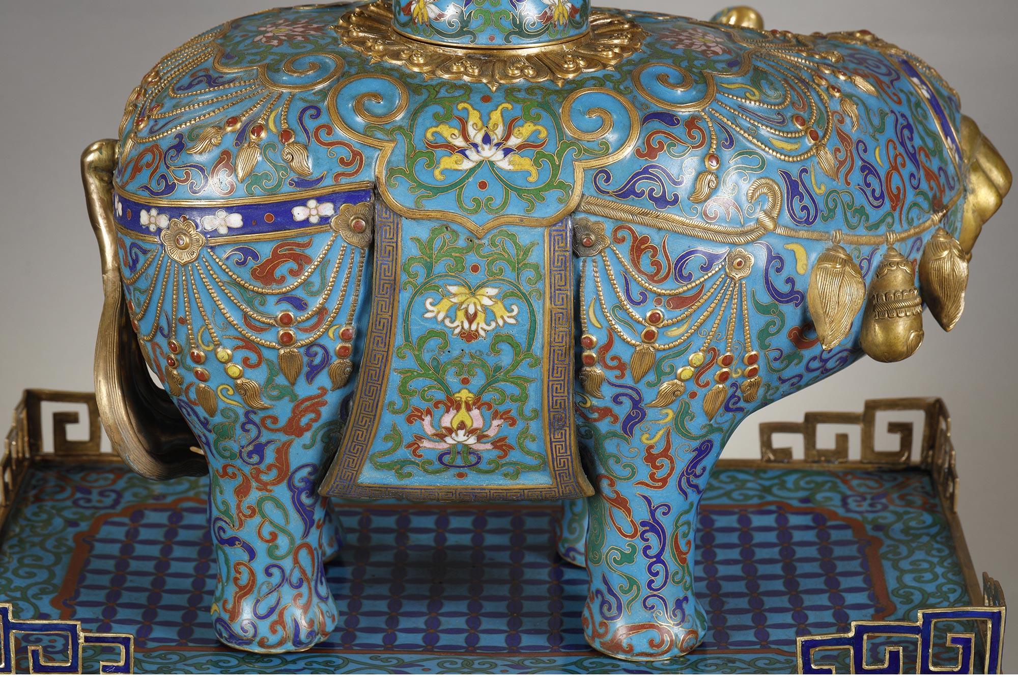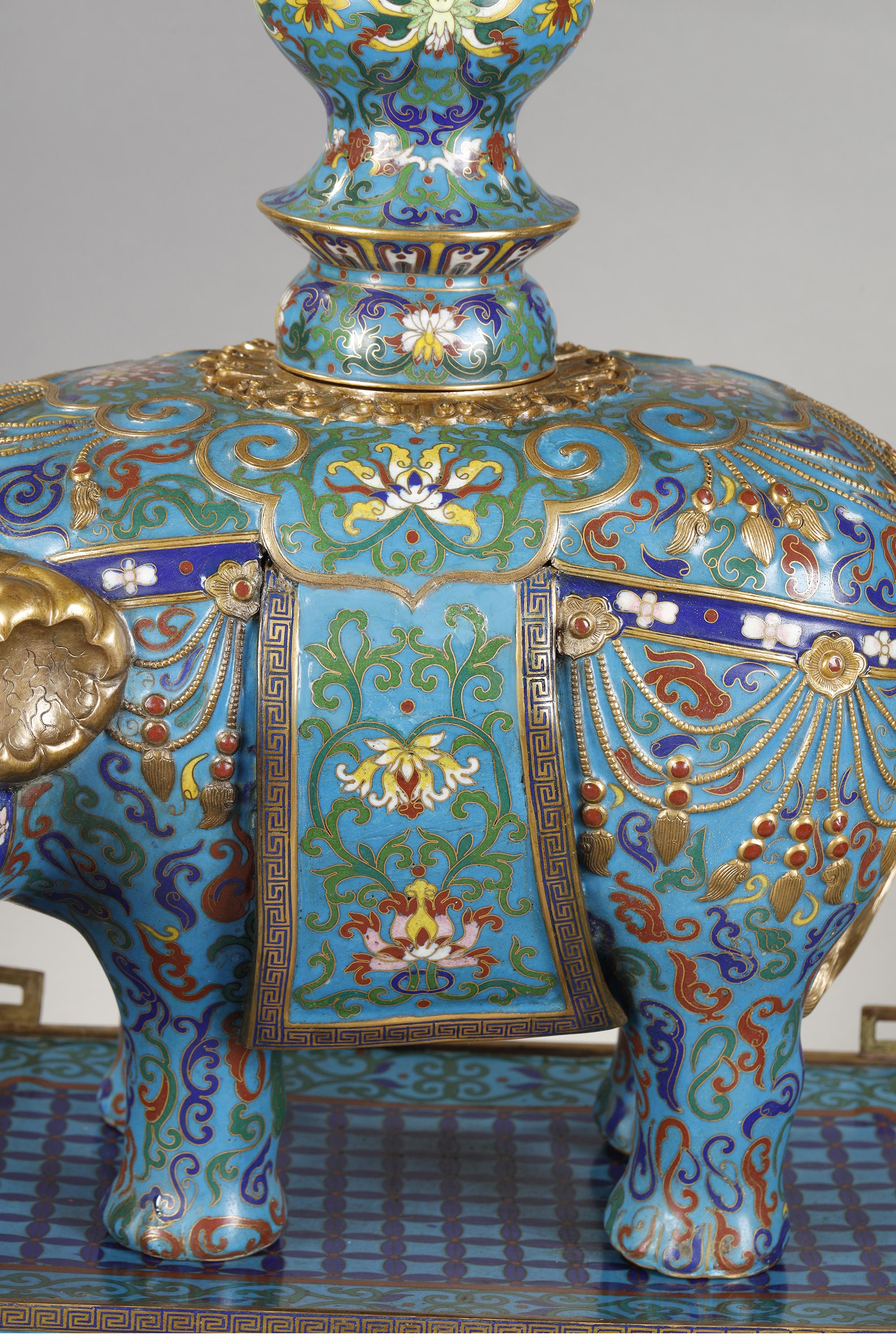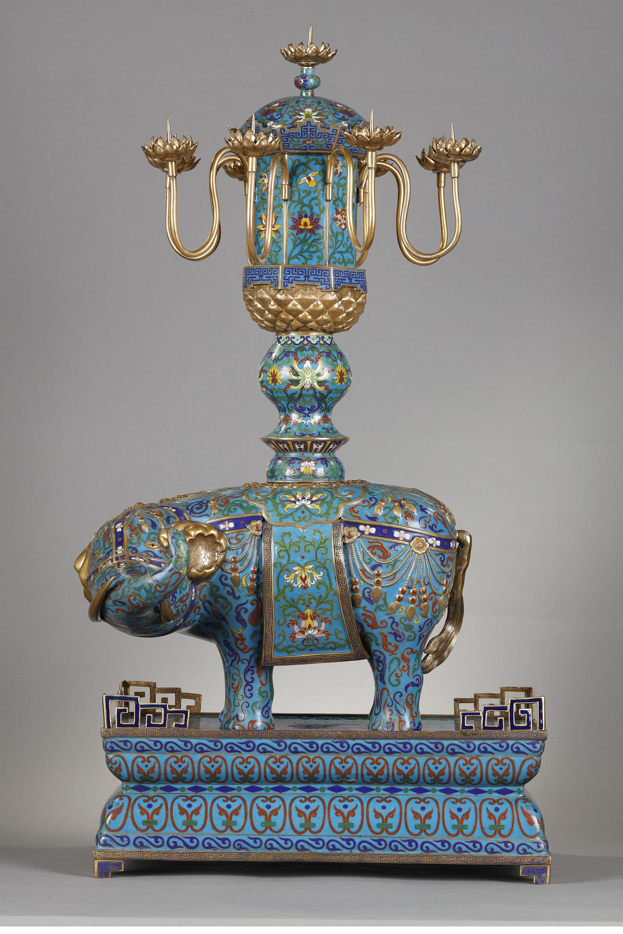 19世纪末中国晚清时期出品鎏金精雕装饰「太平有象」主题铜胎掐丝珐琅多枝头烛台一对