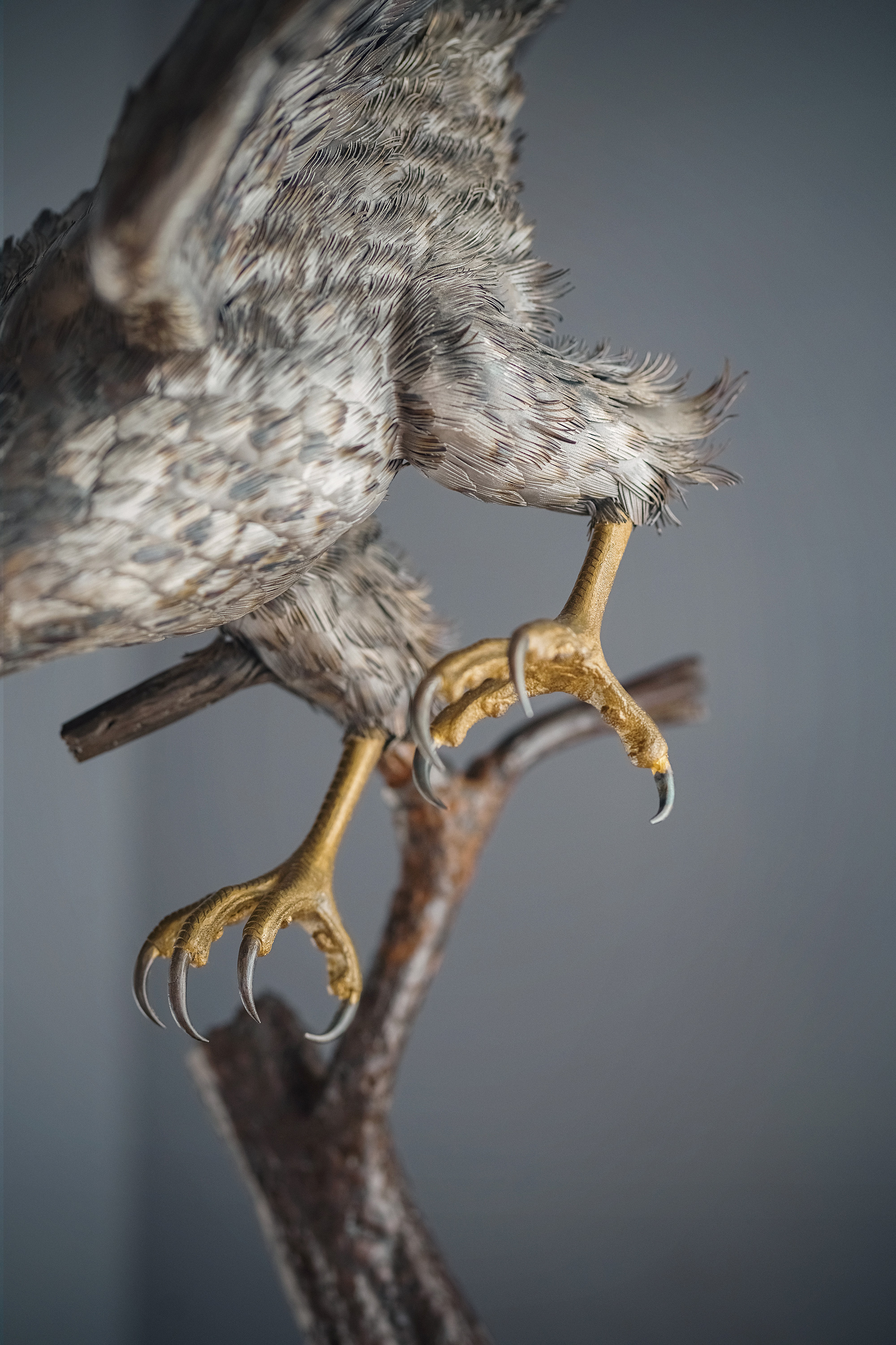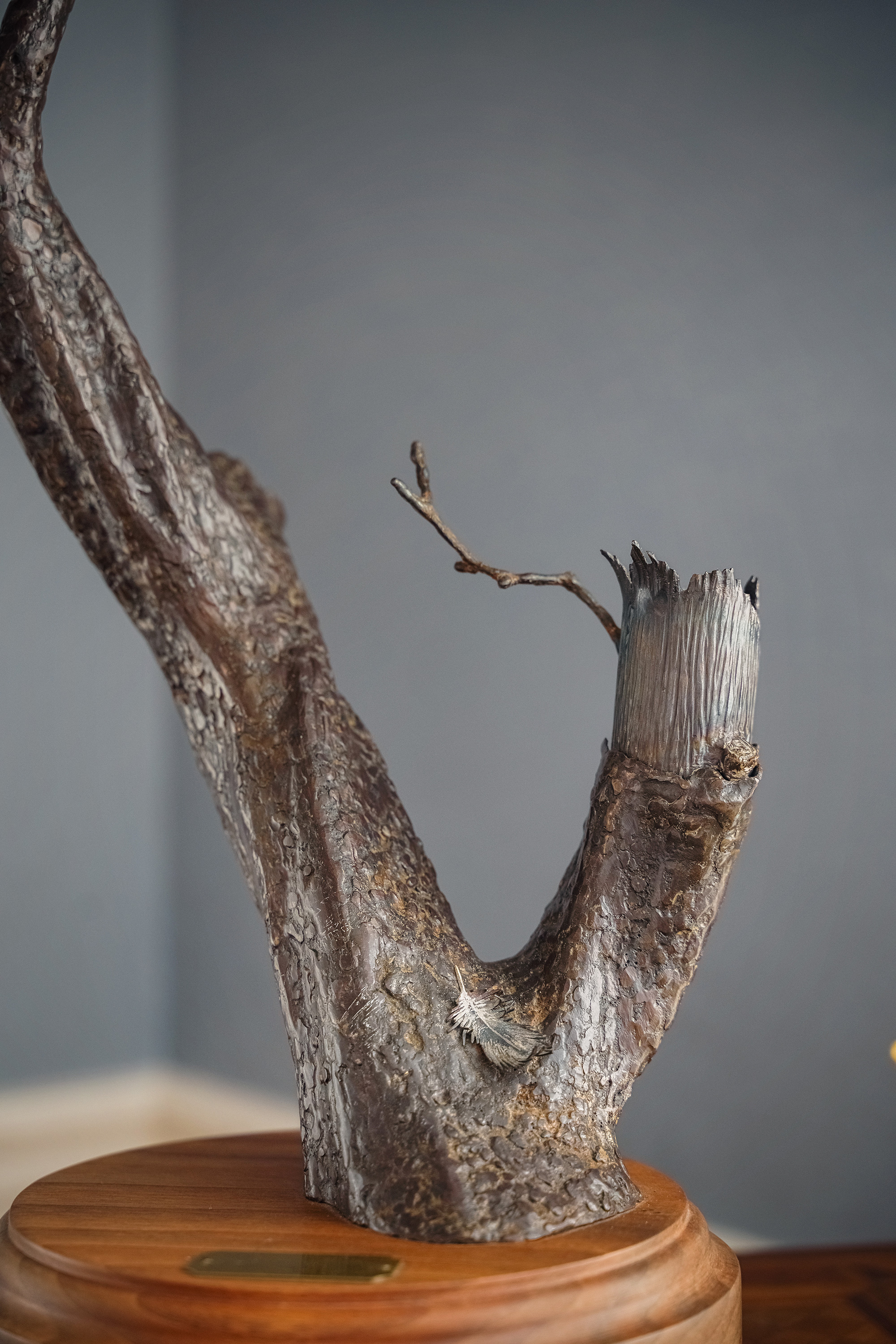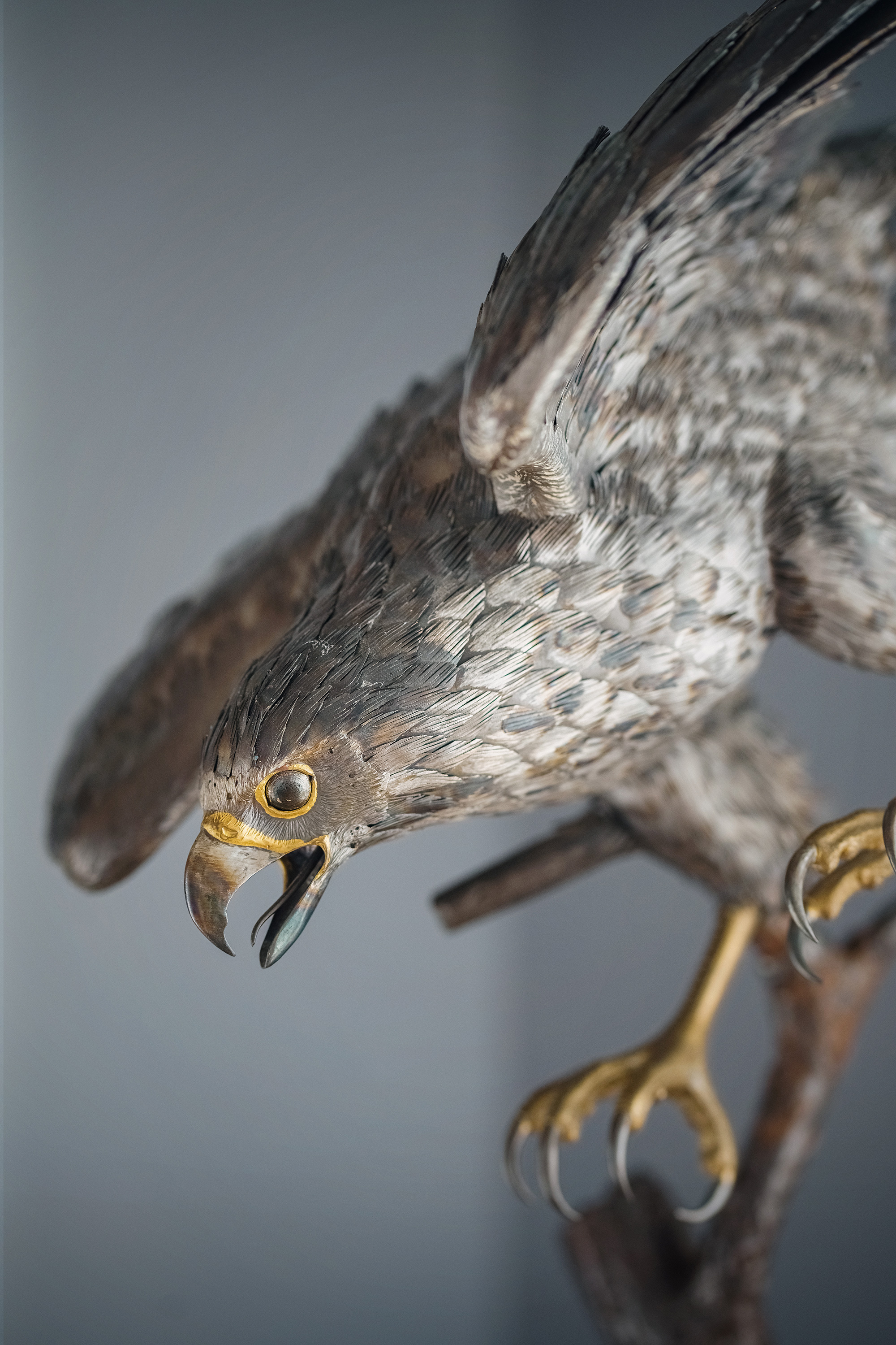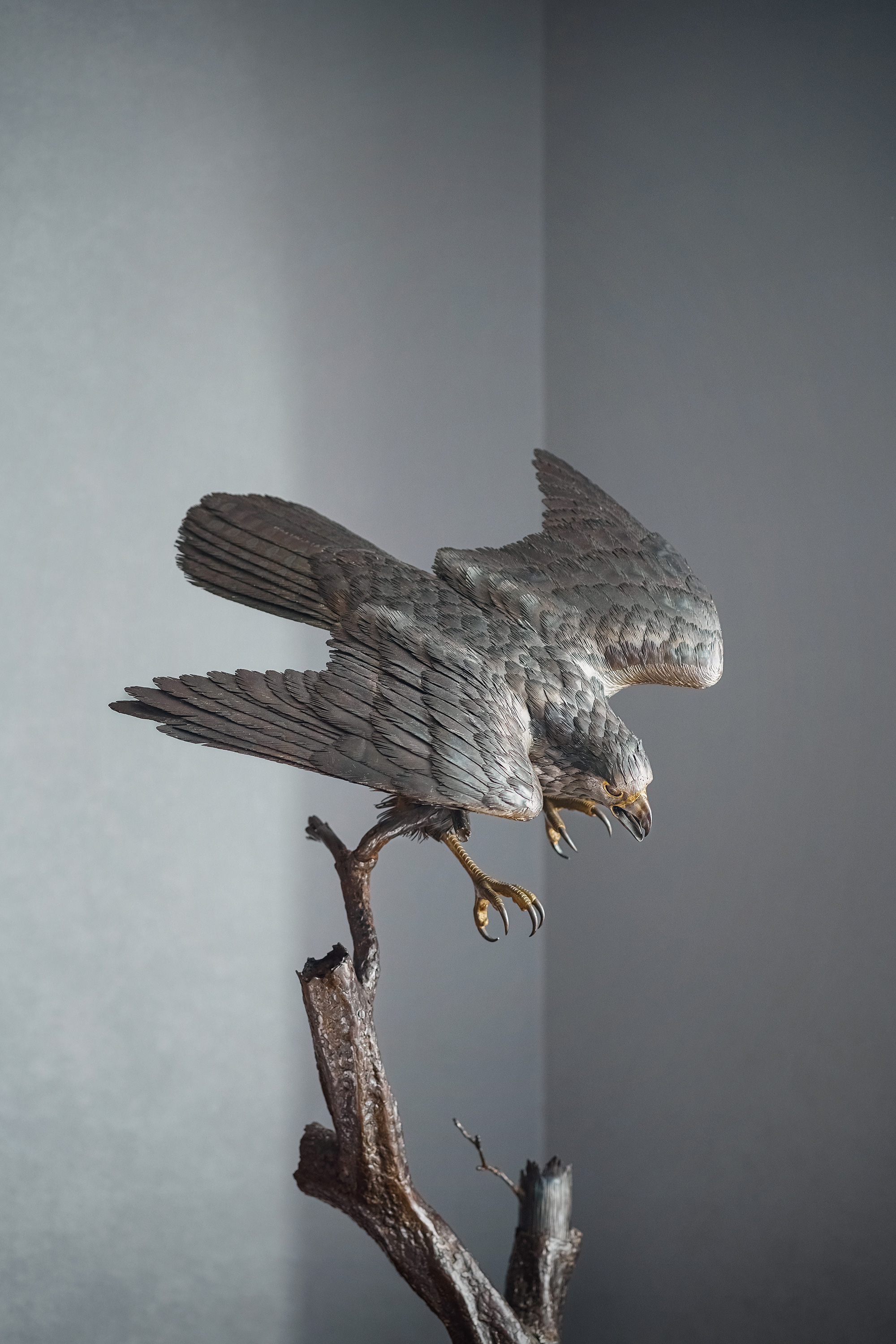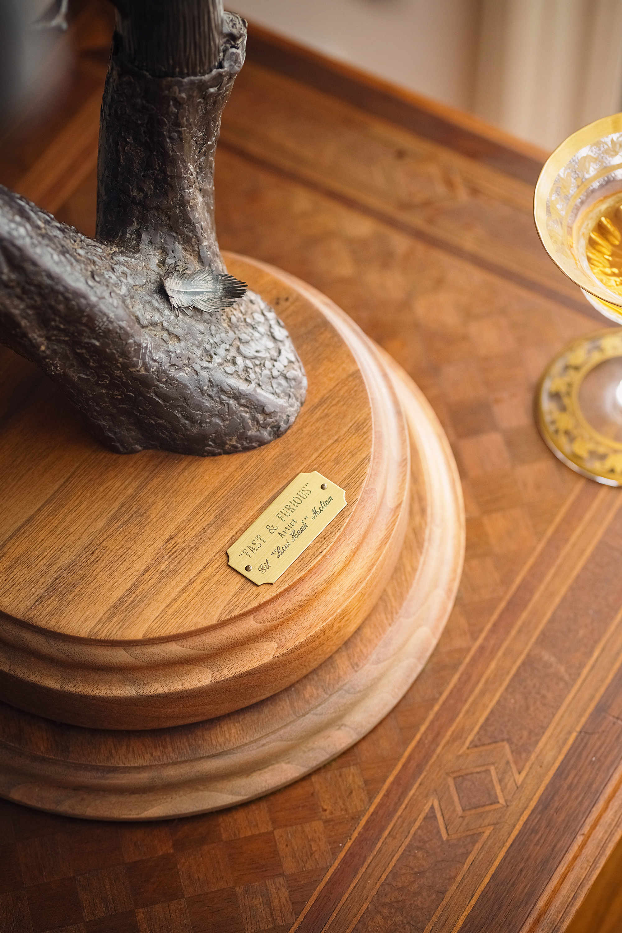 独角鹿西洋古董20世纪美国当代艺术家Gil “Levi Hawk” Melton签名创作出品“速度与激情”飞禽系列木质底座装饰雄鹰造型金属雕塑