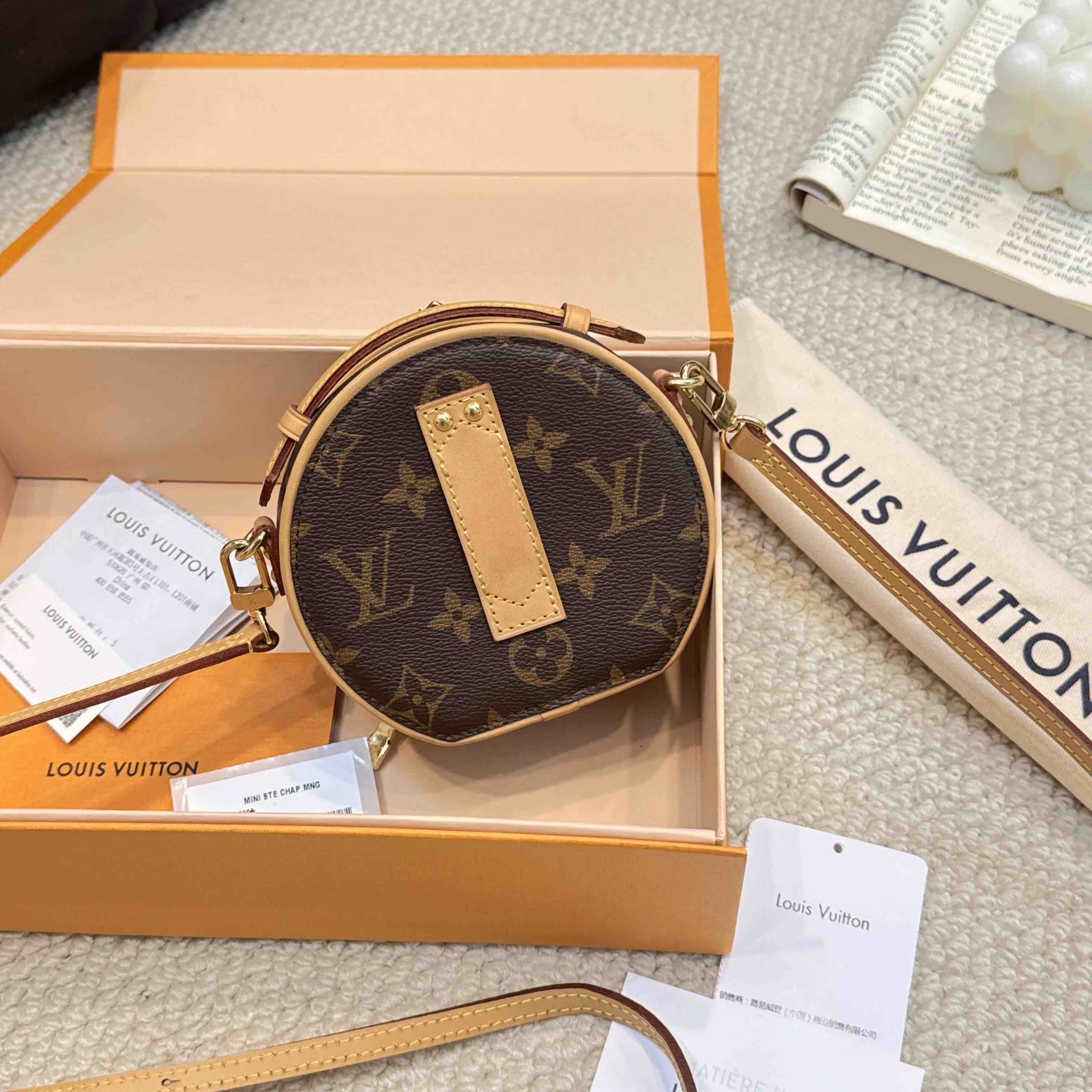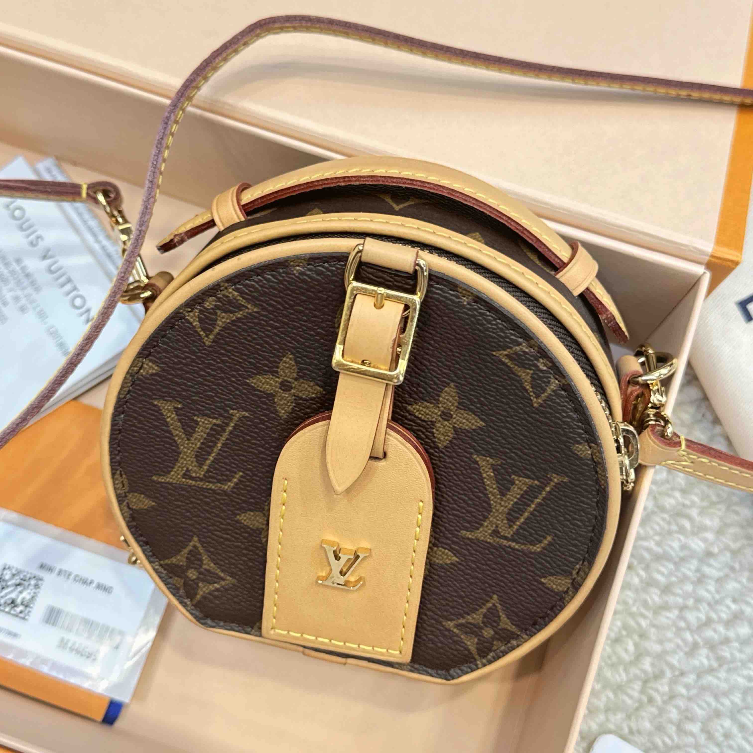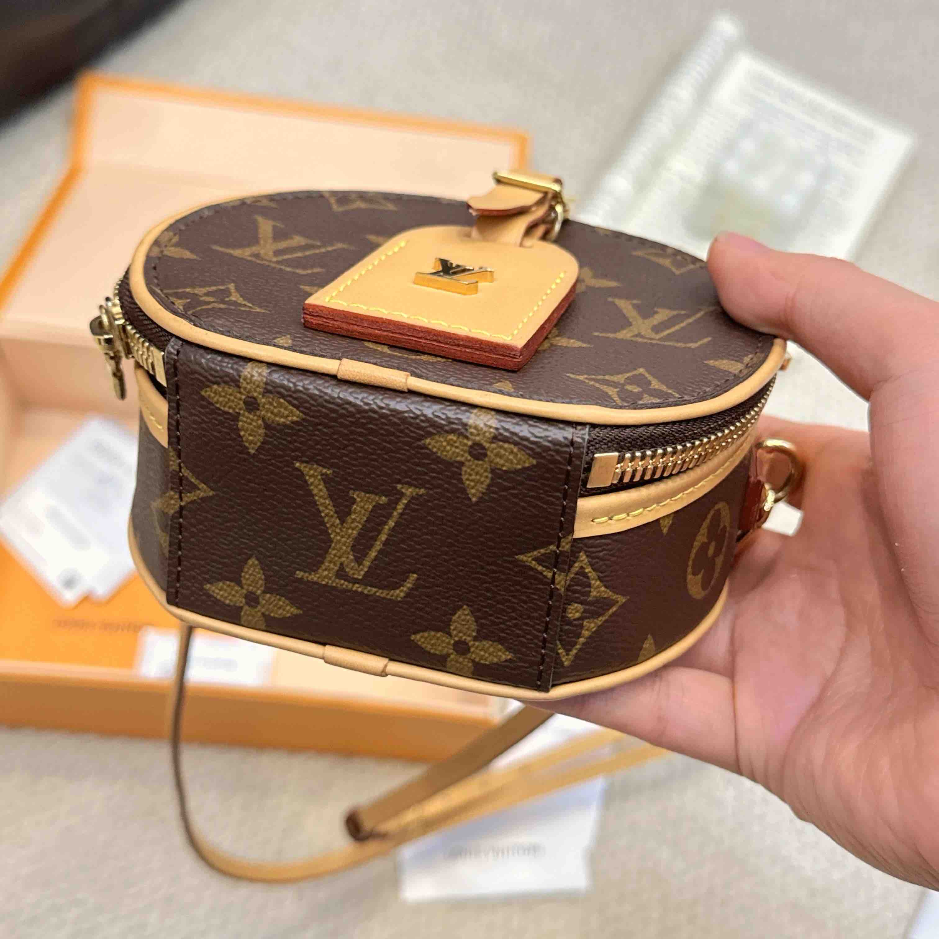 【商品詳情】正品二手 Lv 老花 mini chapeau 圆饼包🧴 97新 9×12 大全套配件:盒子、小票、防尘袋、肩带、行李挂牌。包身植鞣革轻微使用感 内里干净 自用送人都很可