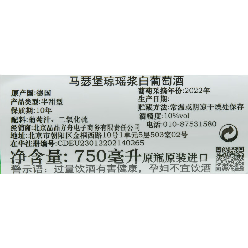 马瑟堡琼瑶浆白葡萄酒750ml/瓶