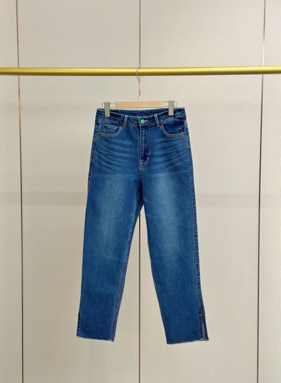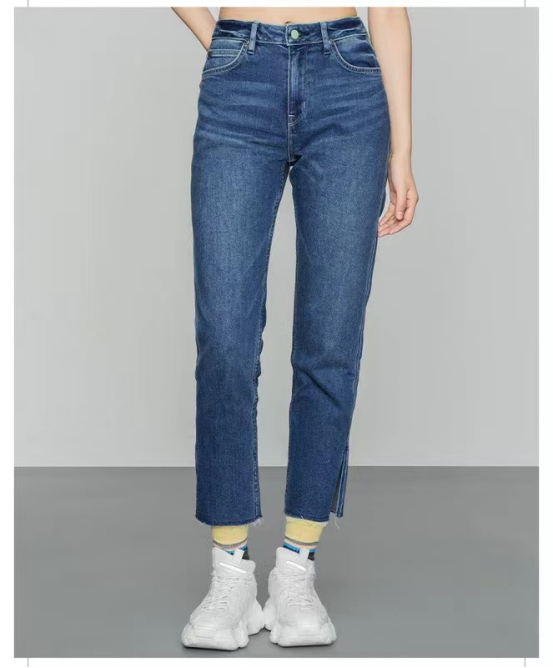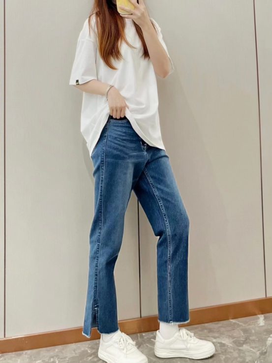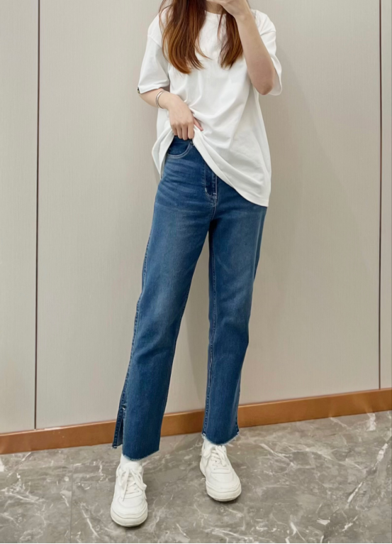 牛仔裤绝对是咱家的强项 实力打造更时髦显瘦的牛仔裤 让你穿上就爱上~ 高腰直筒版型显瘦显腿长,脚口做了小开叉 整体效果巨显瘦!! 上身是腰部、臀围、大腿是合身效果 膝盖往下小直筒效果!!