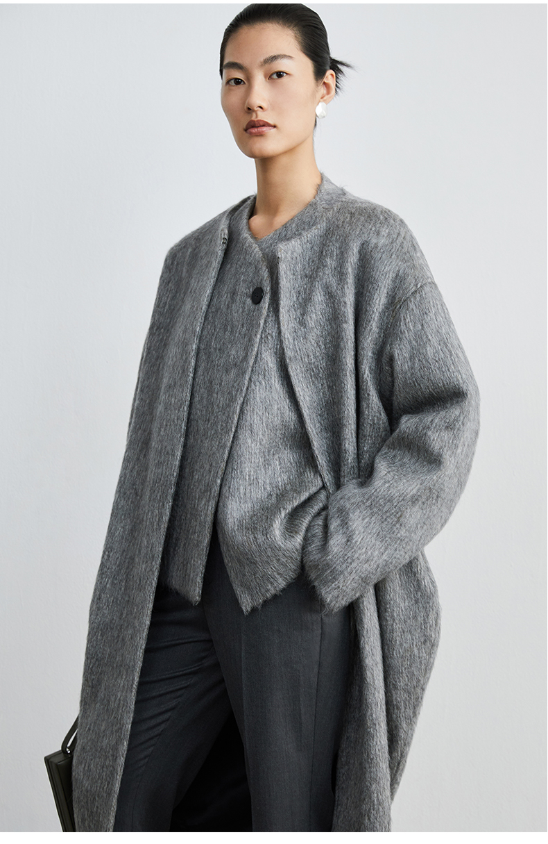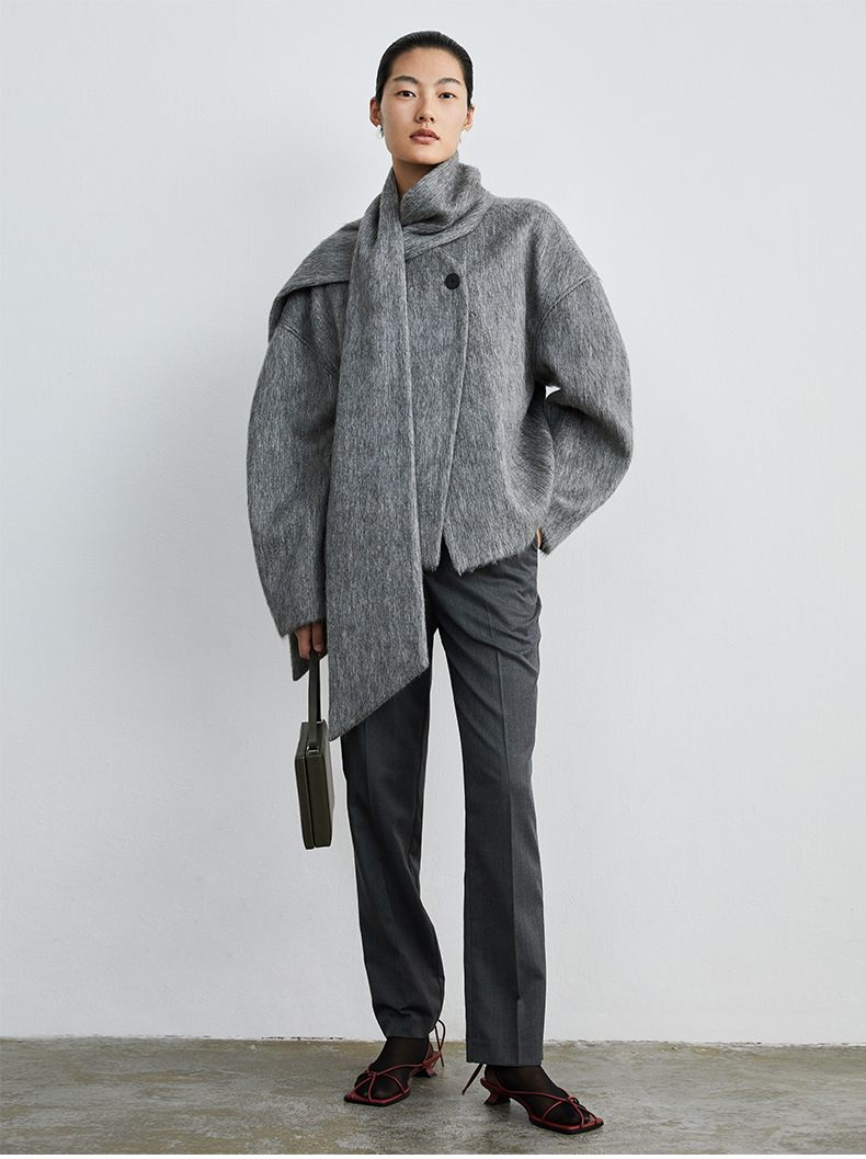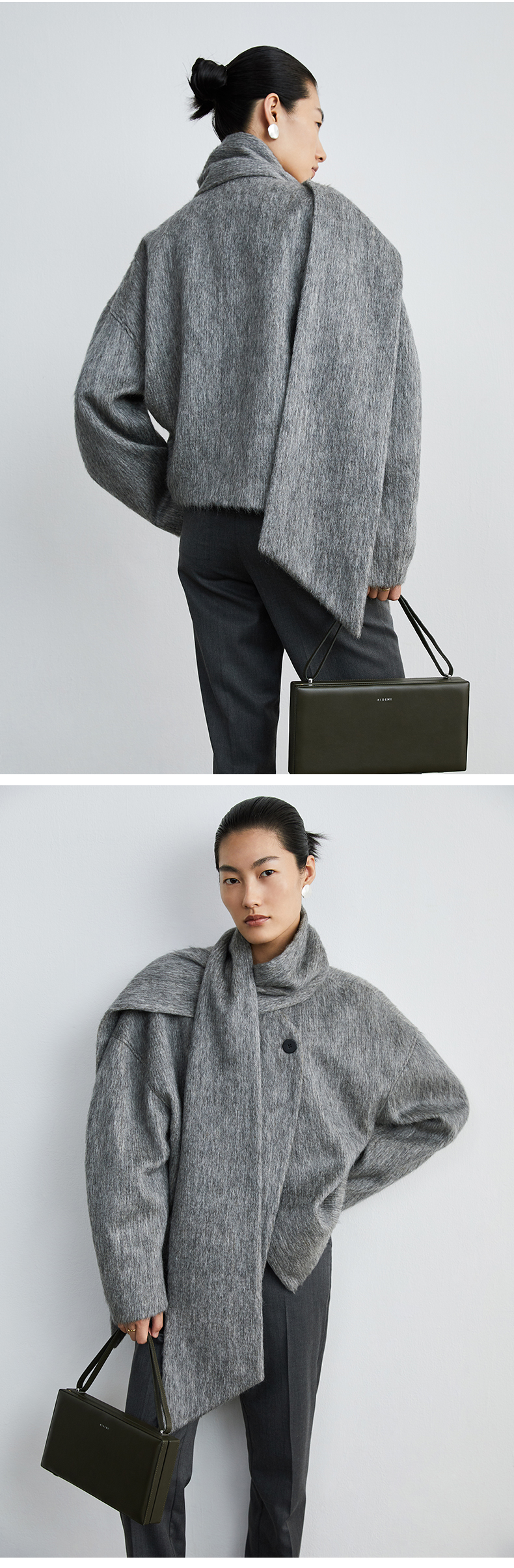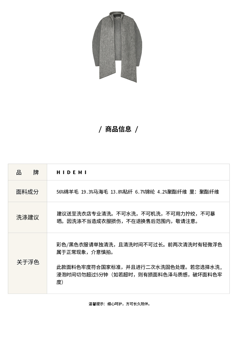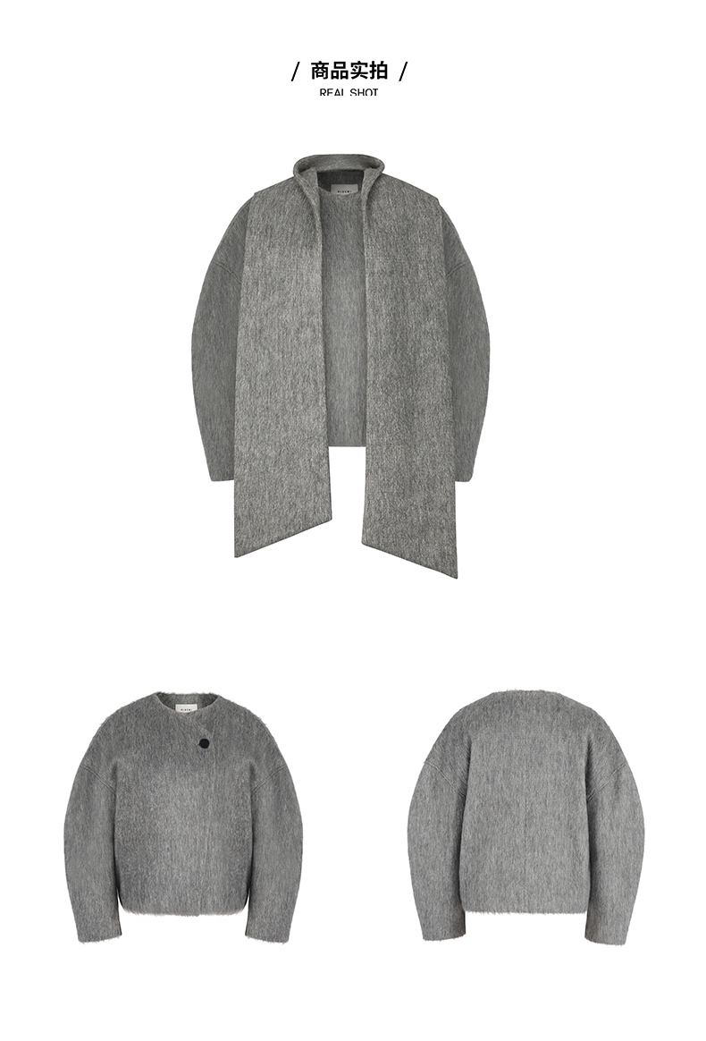 HIDEMI 水墨灰马海毛可拆卸围巾设计感短款茧型两件套大衣