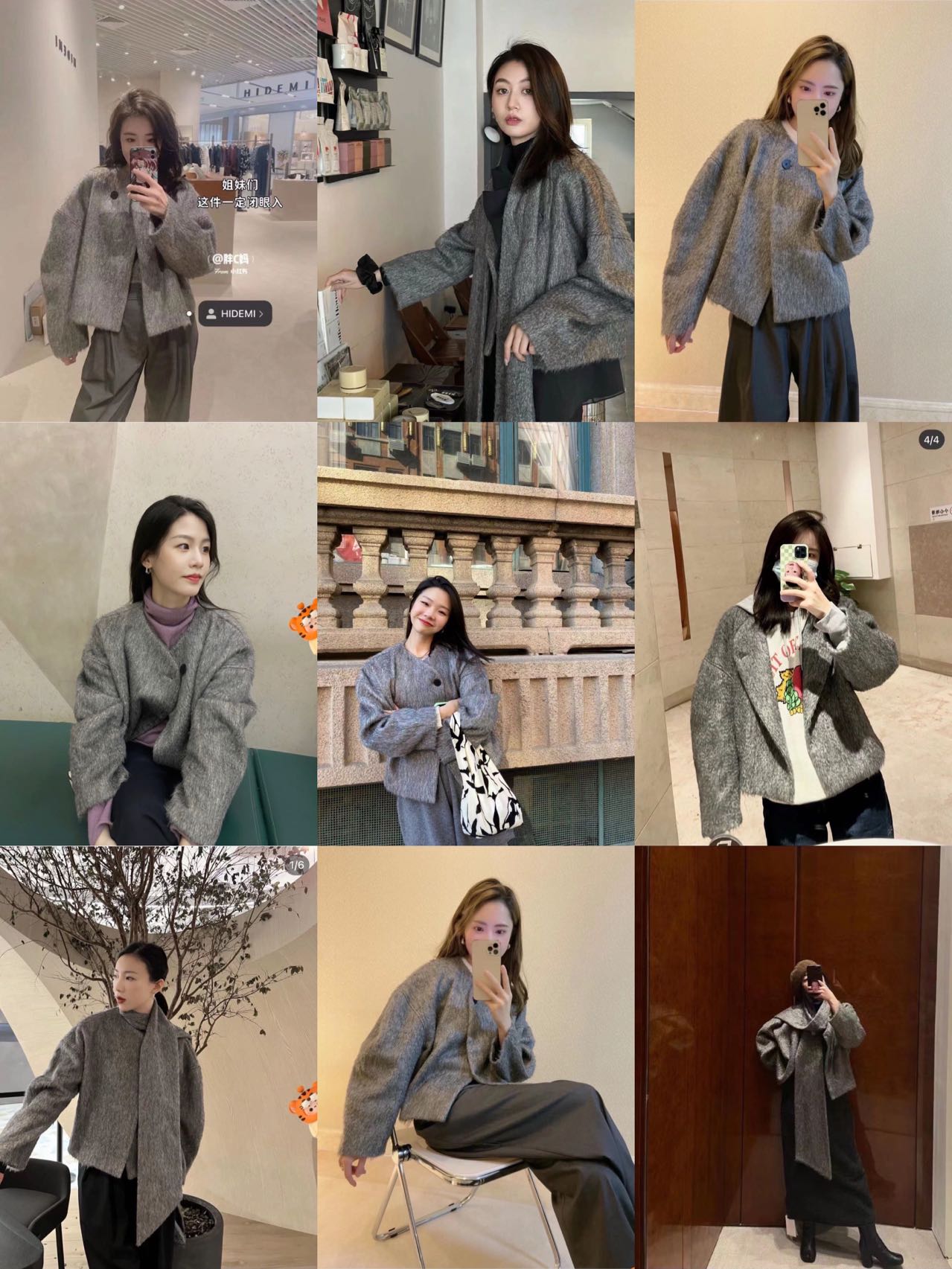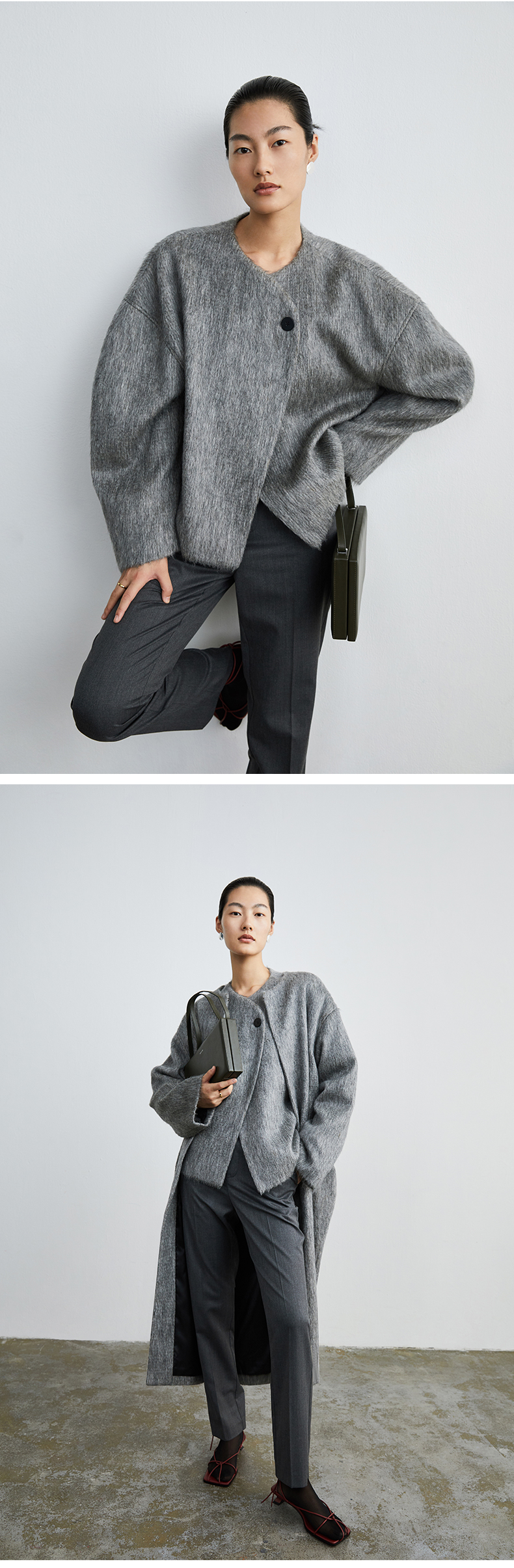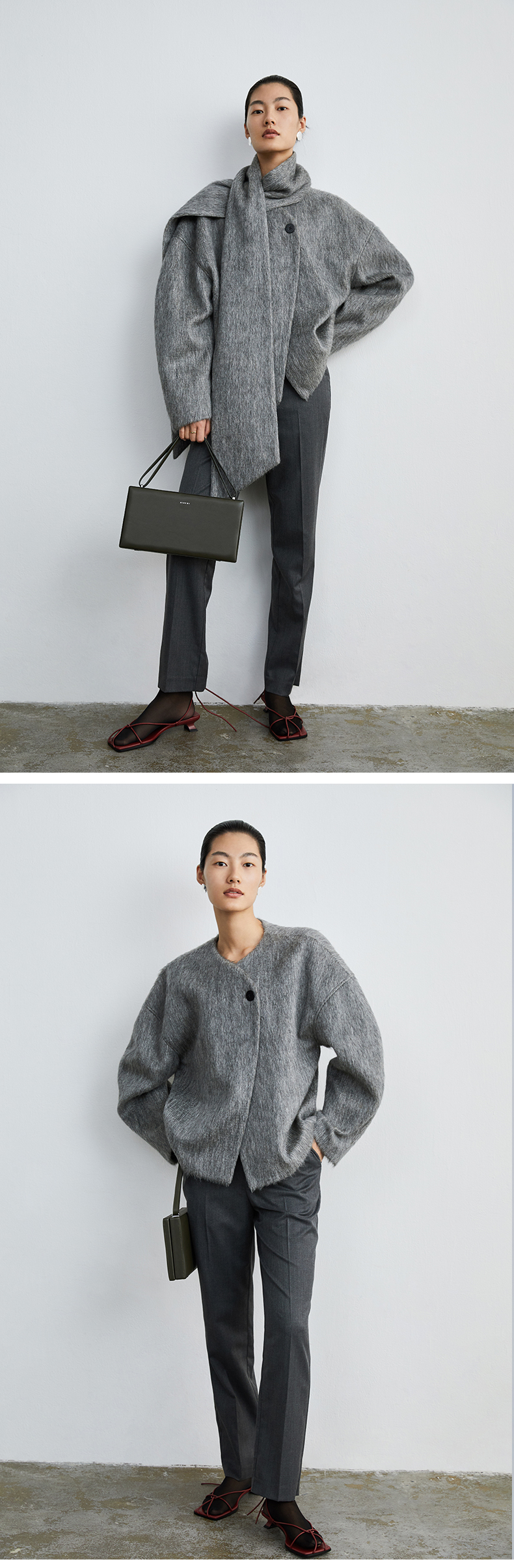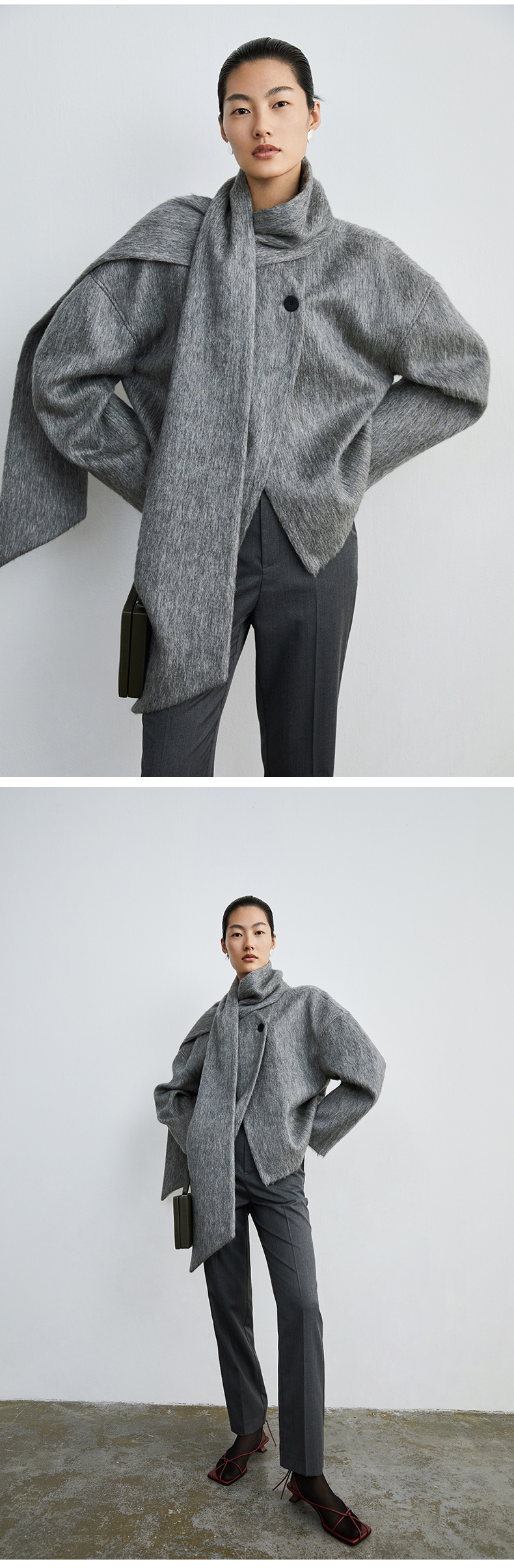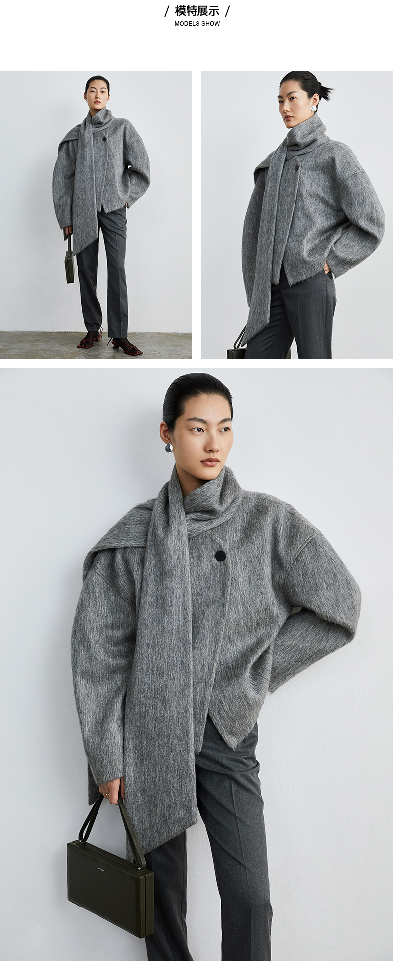 HIDEMI 水墨灰马海毛可拆卸围巾设计感短款茧型两件套大衣