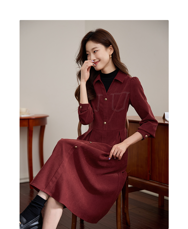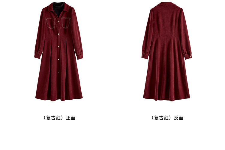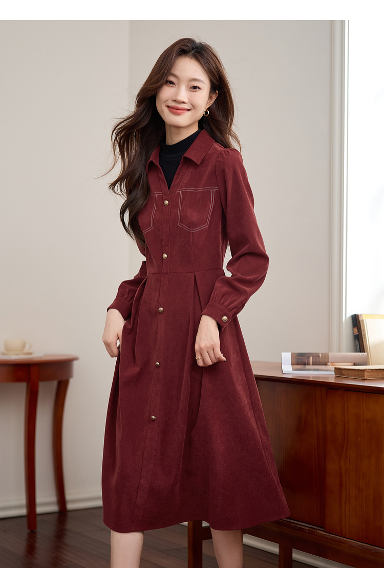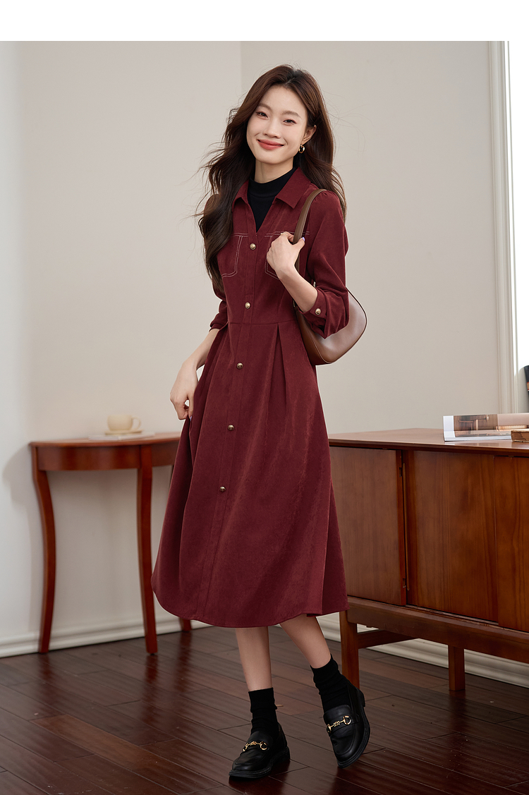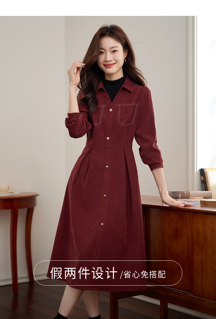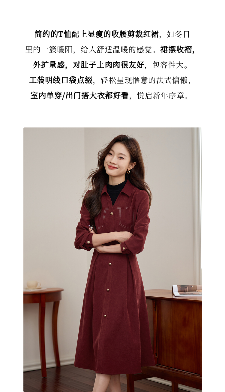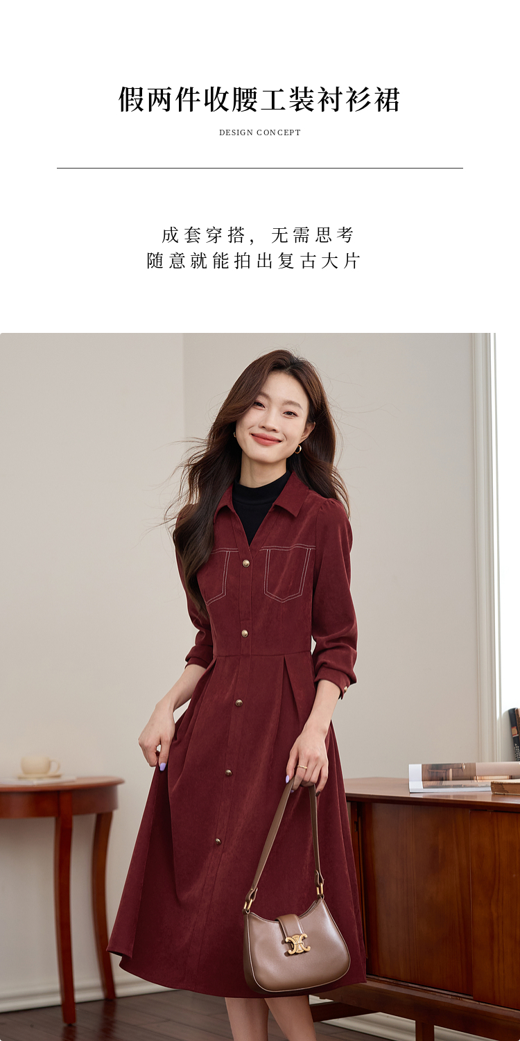 【1件76折】熙世界假两件磨绒红色连衣裙秋冬2025新款日常通勤磨毛衬衫裙子