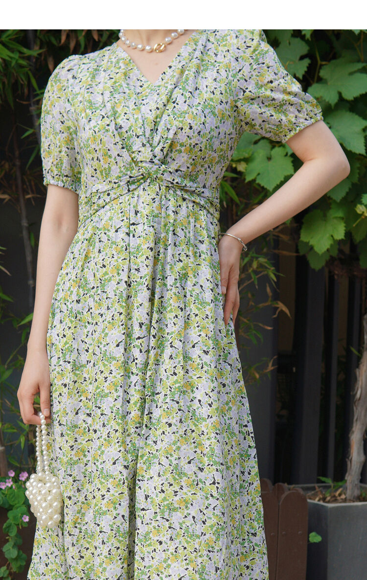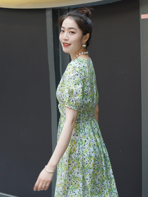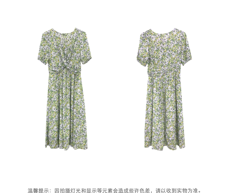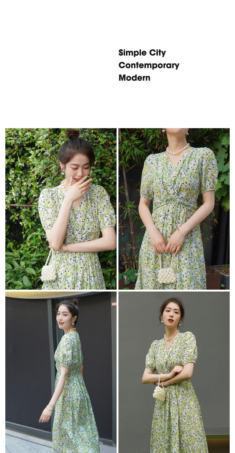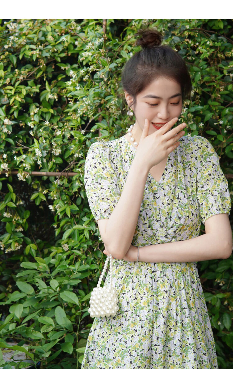 NEELLY纳俪商场同款气质V领泡泡袖连衣裙女韩版扭结设计显瘦A字裙