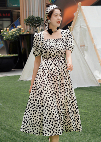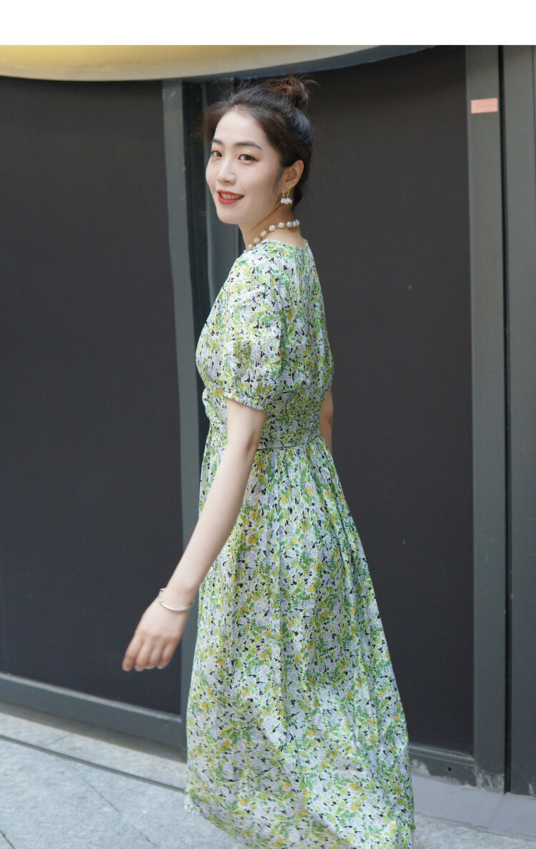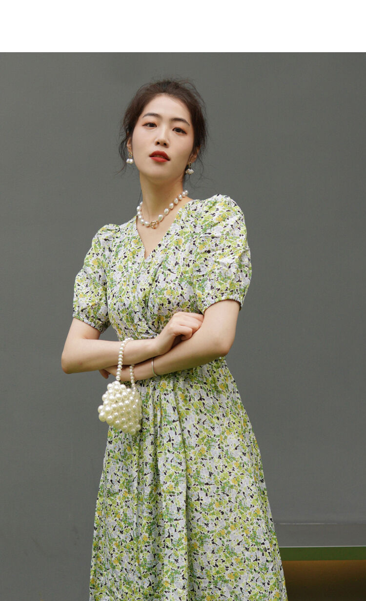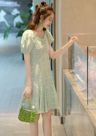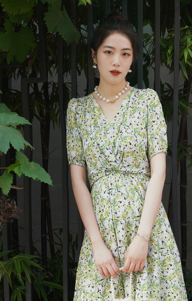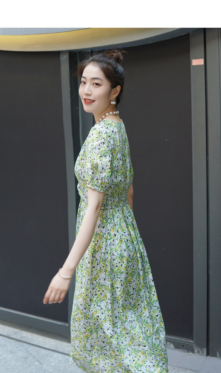 NEELLY纳俪商场同款气质V领泡泡袖连衣裙女韩版扭结设计显瘦A字裙