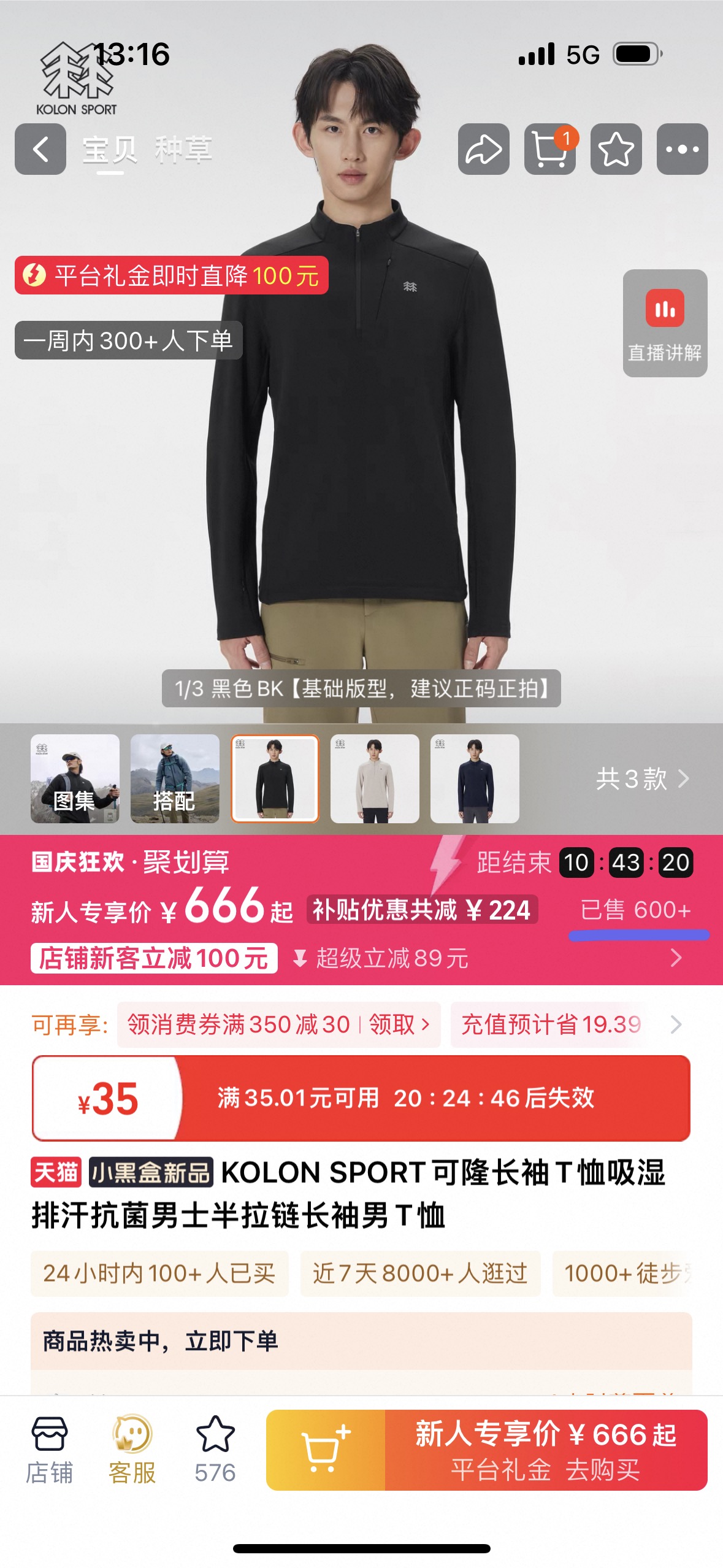 KOLON SPORT可隆秋冬新款男士半拉链吸湿 排汗