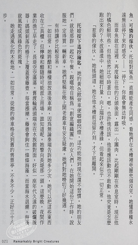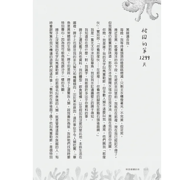 人類很難想像一隻章魚能擁有多少智慧,但馬塞勒斯真的懂,除了人類常見的盲點、傻氣行徑,牠甚至連托娃生命中*大的傷痛,都略知一二。為了回報這段友誼,馬塞勒斯用盡各種方式傳達事實真相給托娃,只盼為她填補內心的空洞……