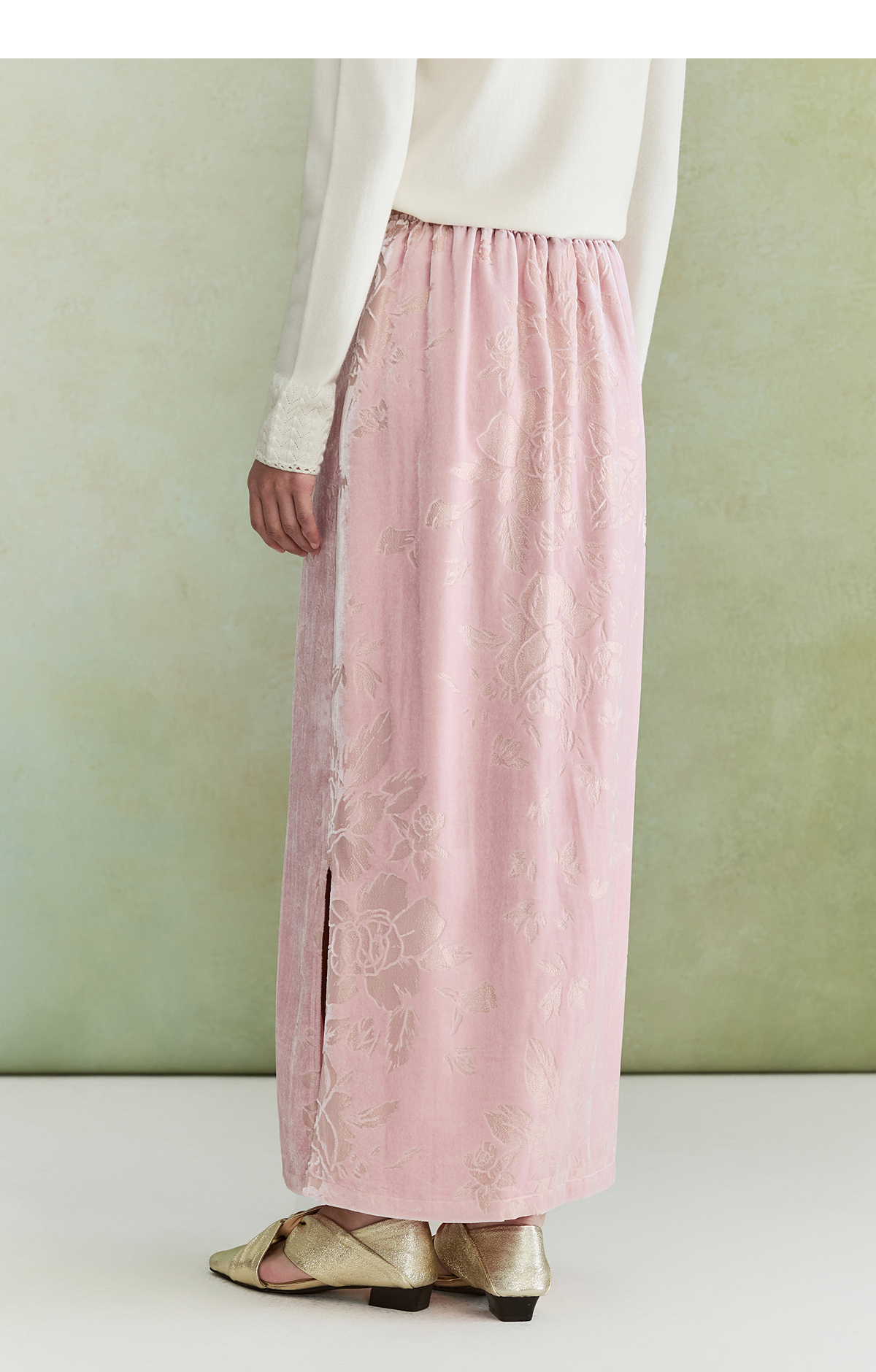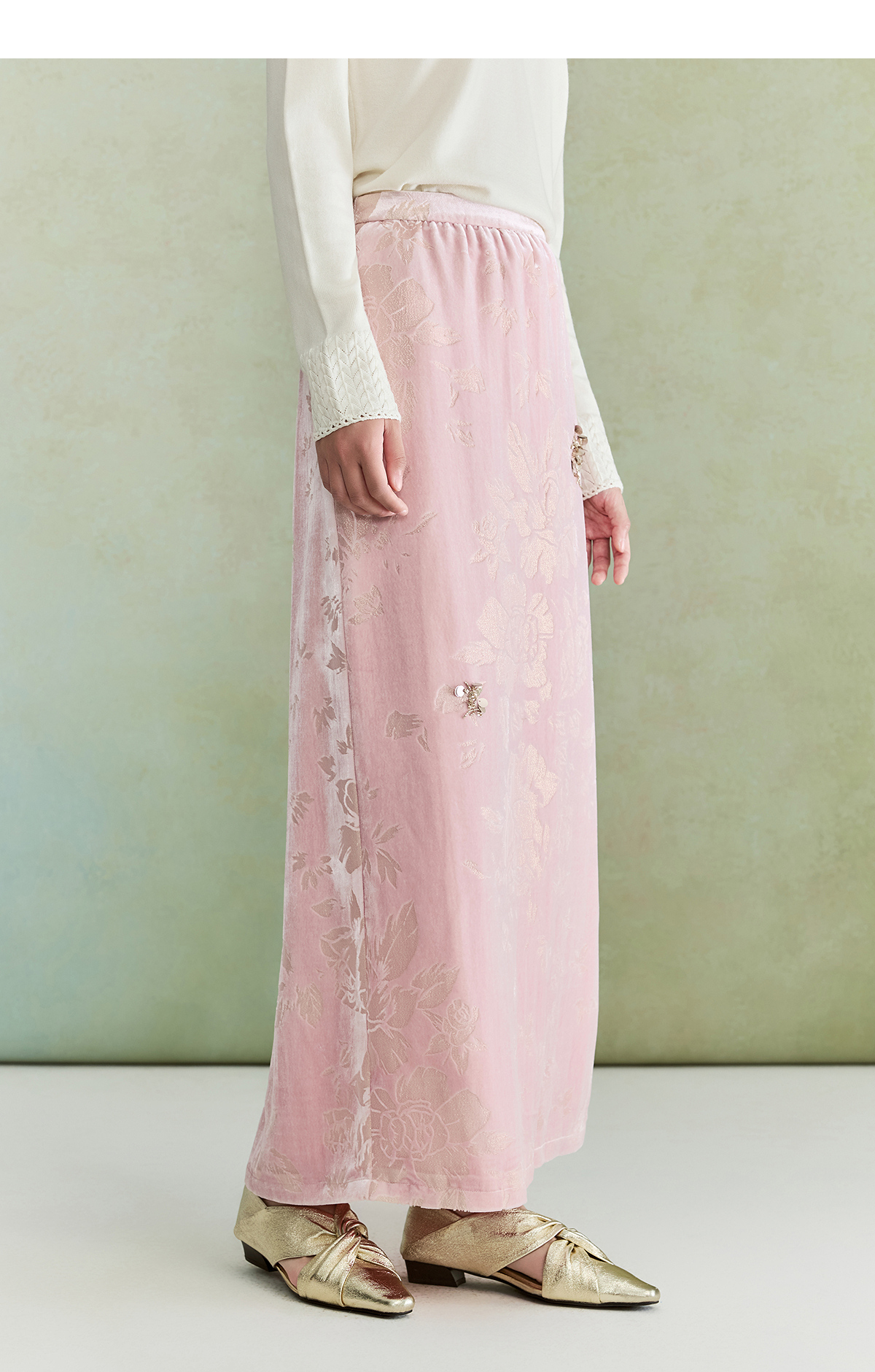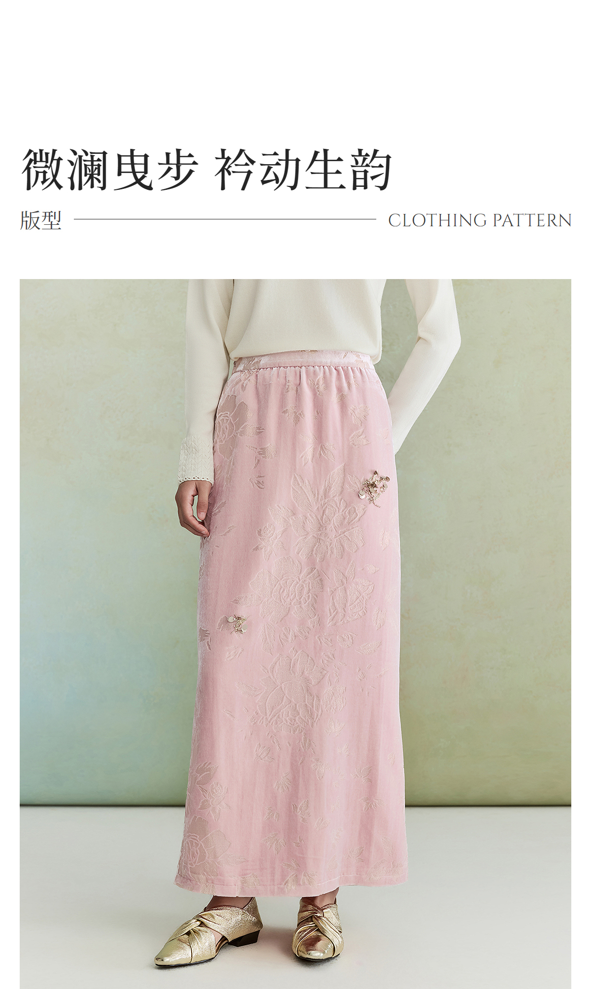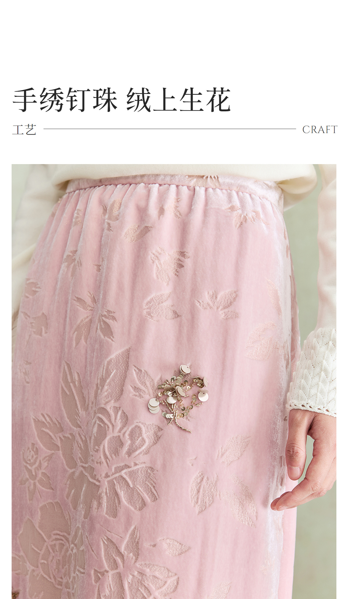 【林栖设计小店】(现货)粉色半身裙新中式丝绒烧花钉珠绣花2026早春新款裙子女1961038