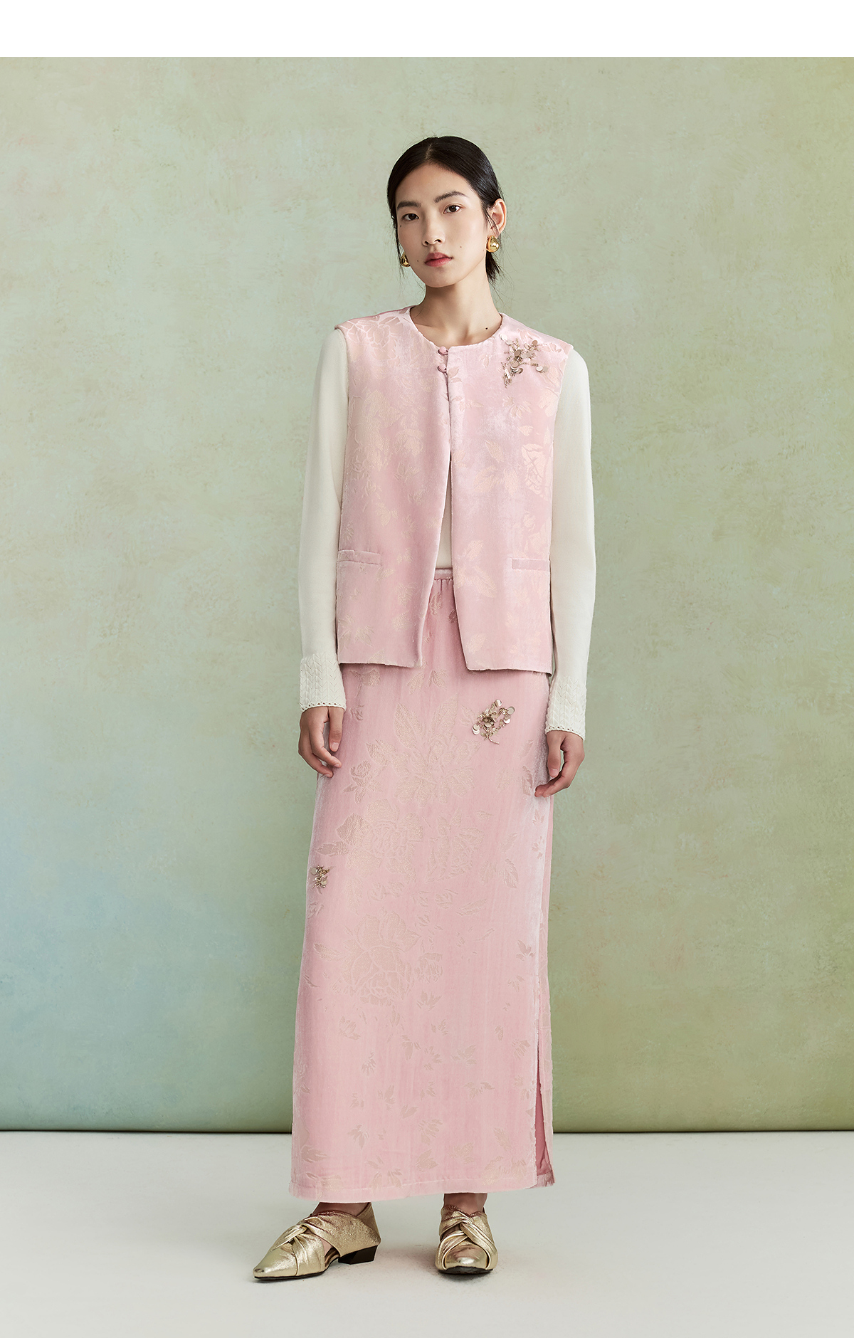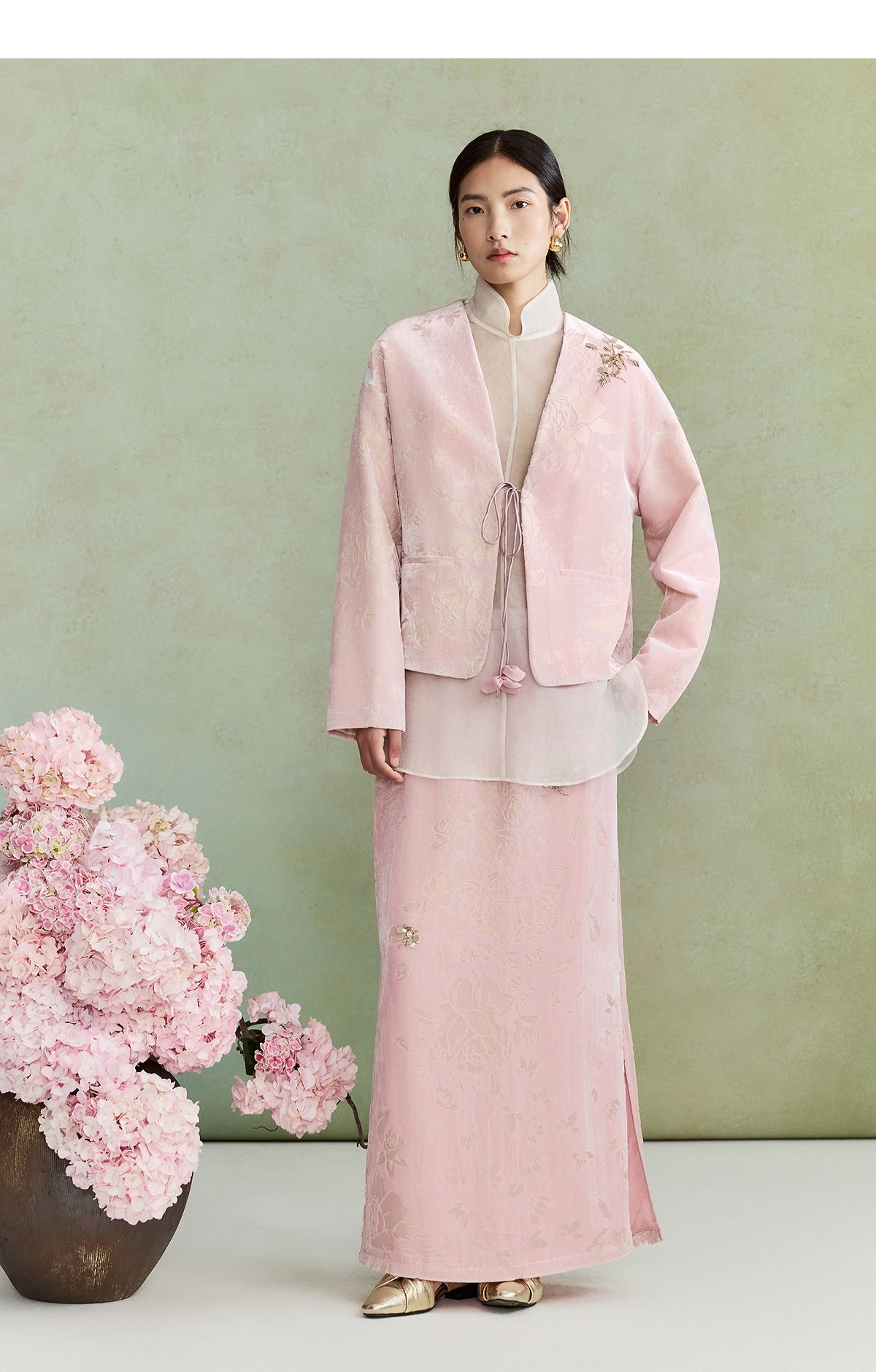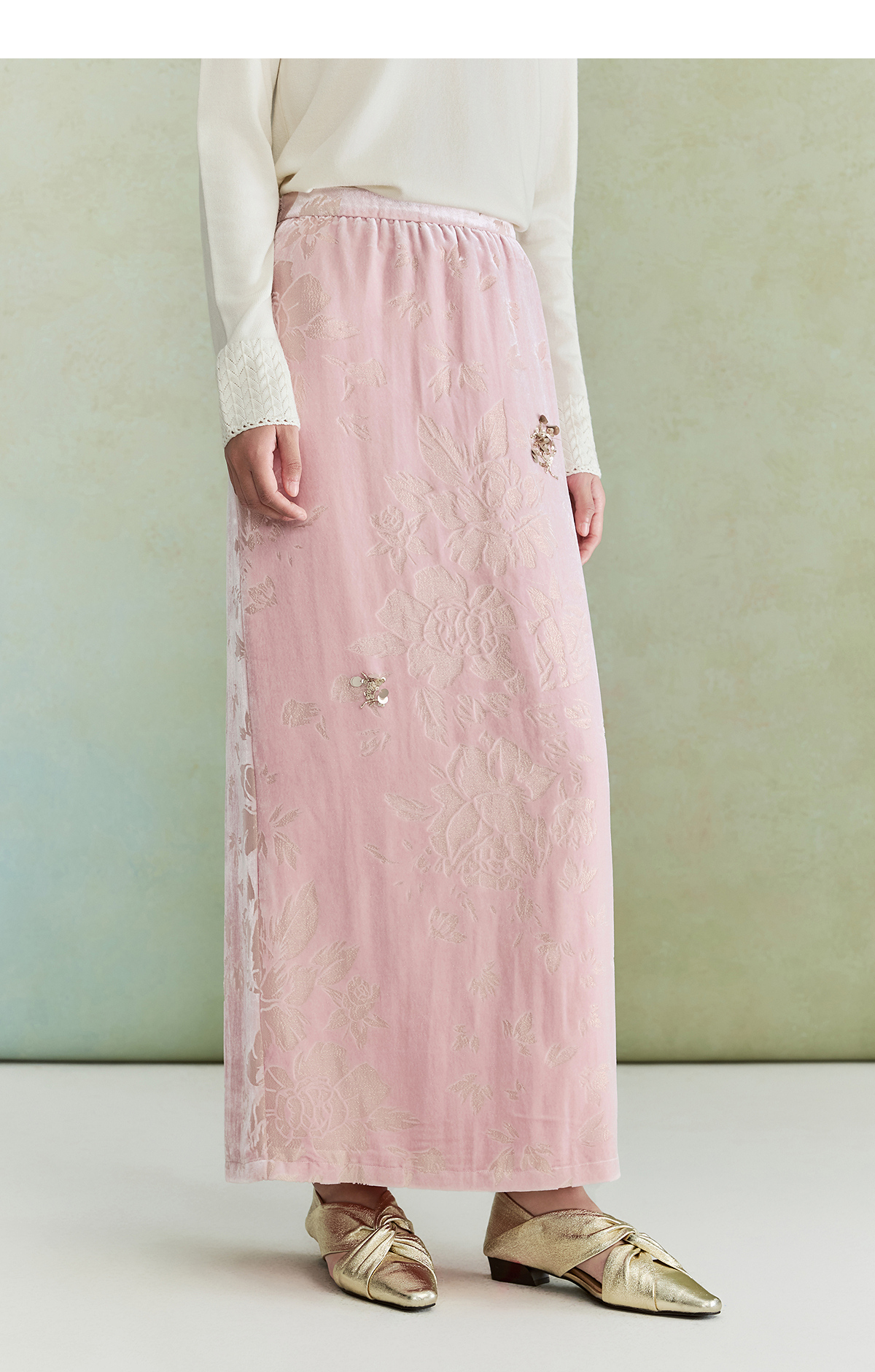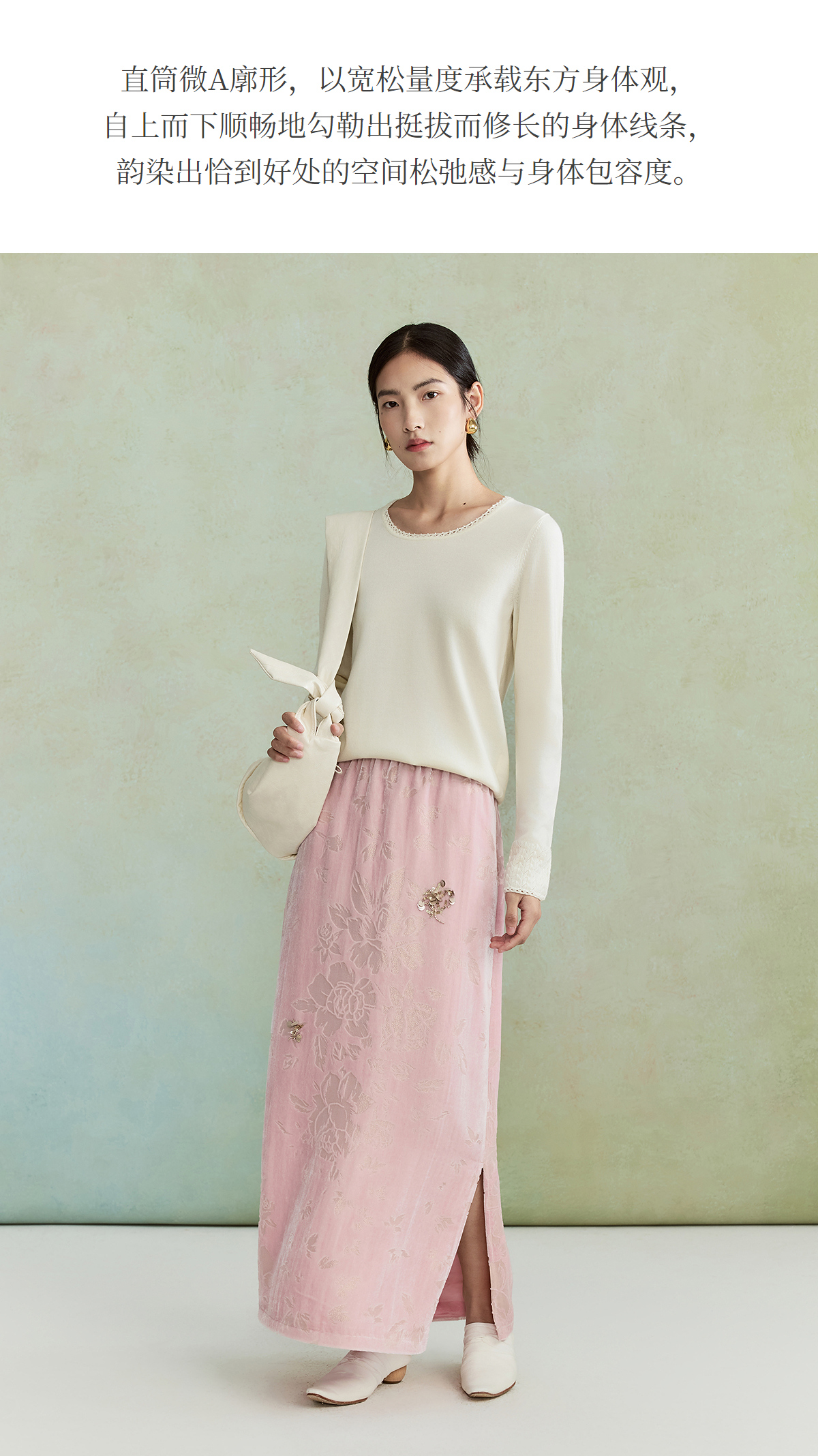 【林栖设计小店】(现货)粉色半身裙新中式丝绒烧花钉珠绣花2026早春新款裙子女1961038