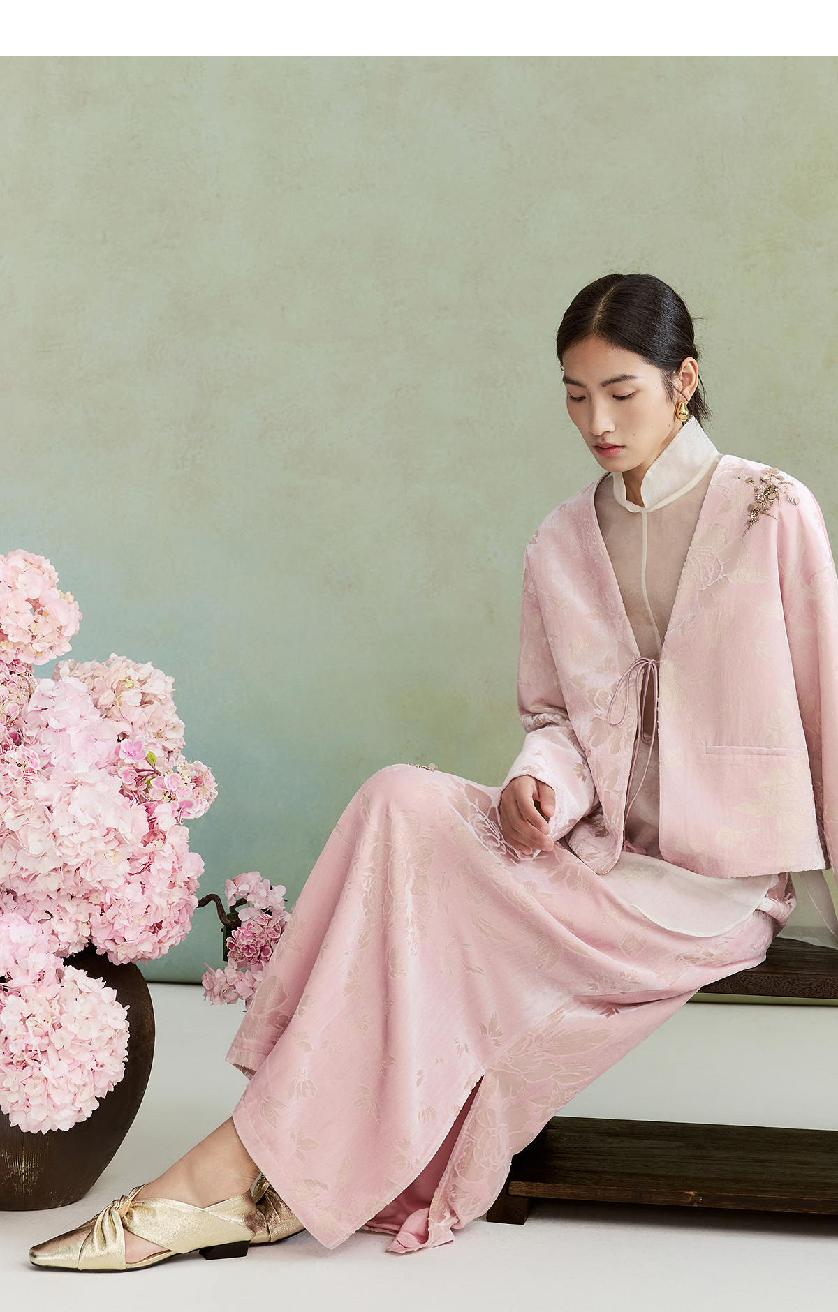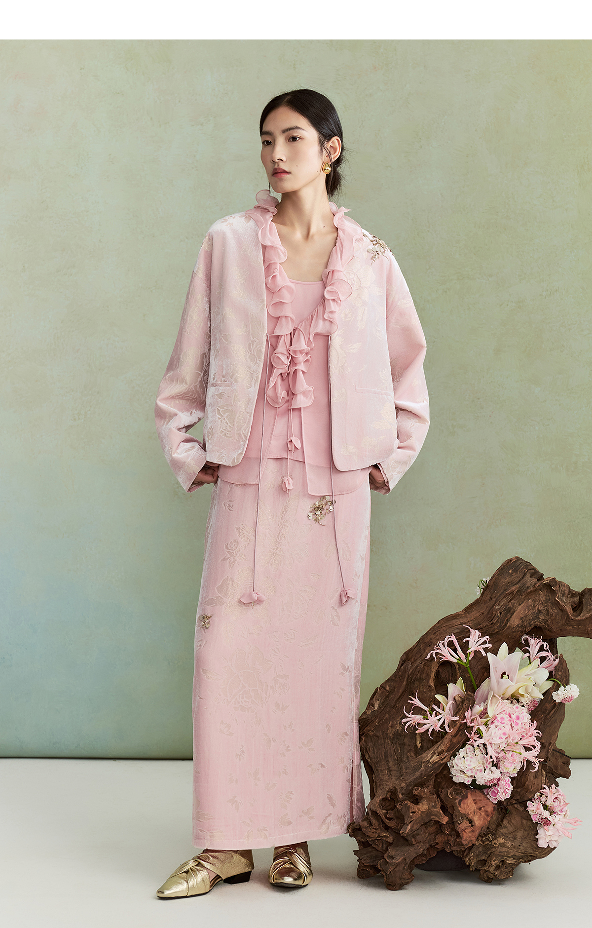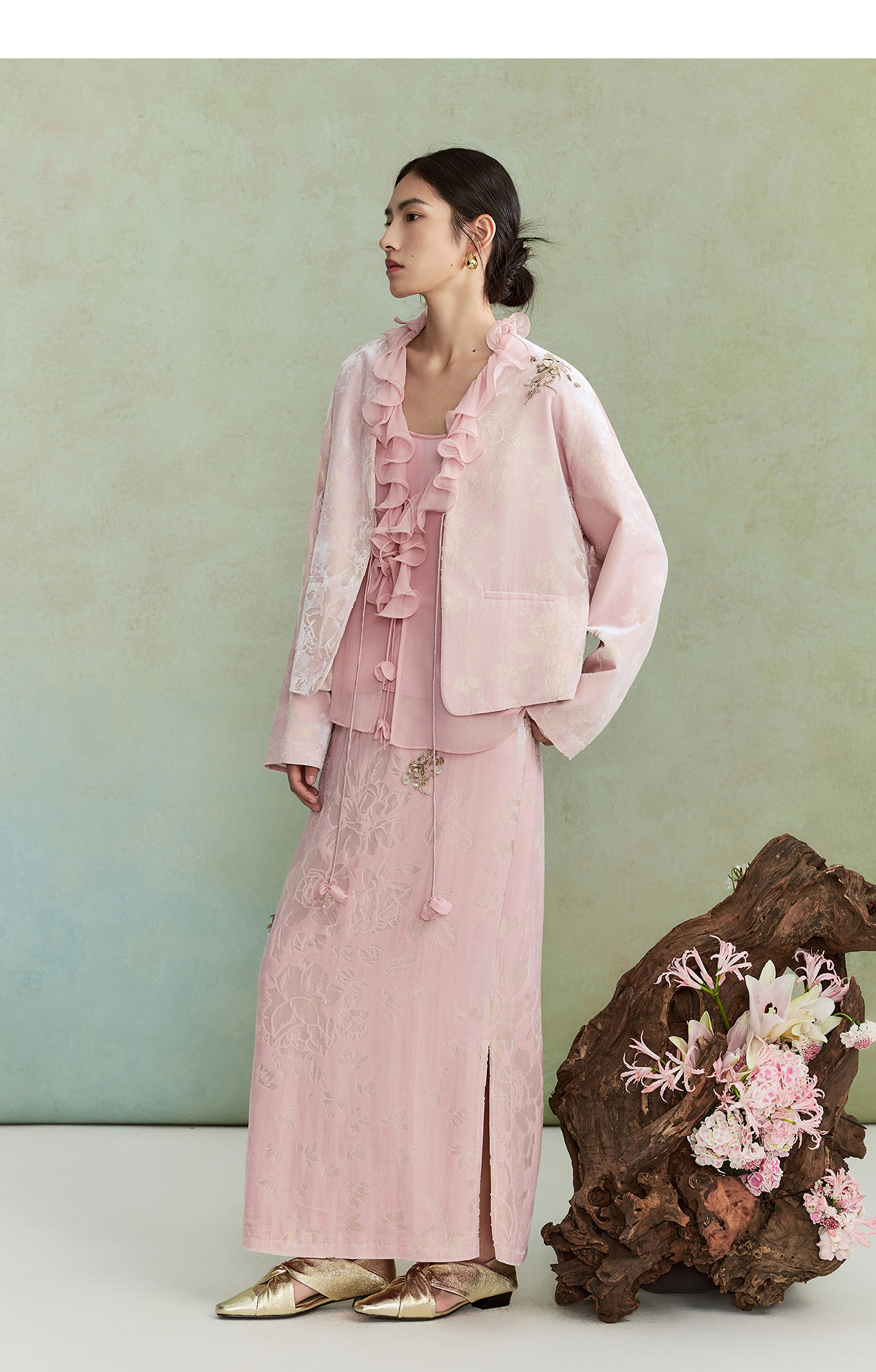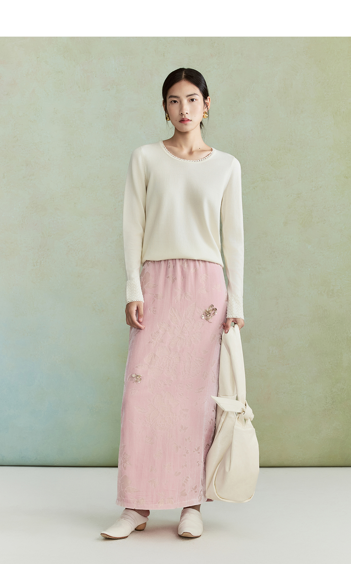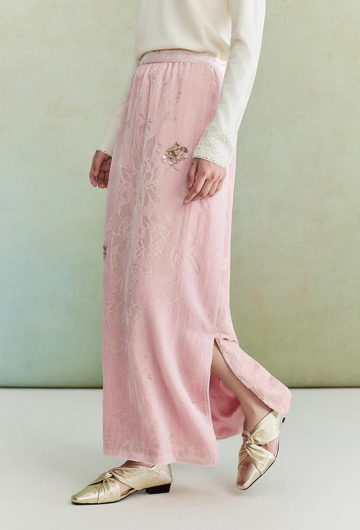 【林栖设计小店】(现货)粉色半身裙新中式丝绒烧花钉珠绣花2026早春新款裙子女1961038