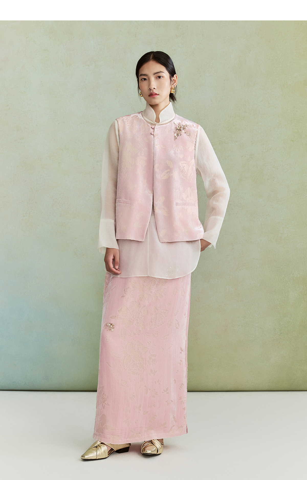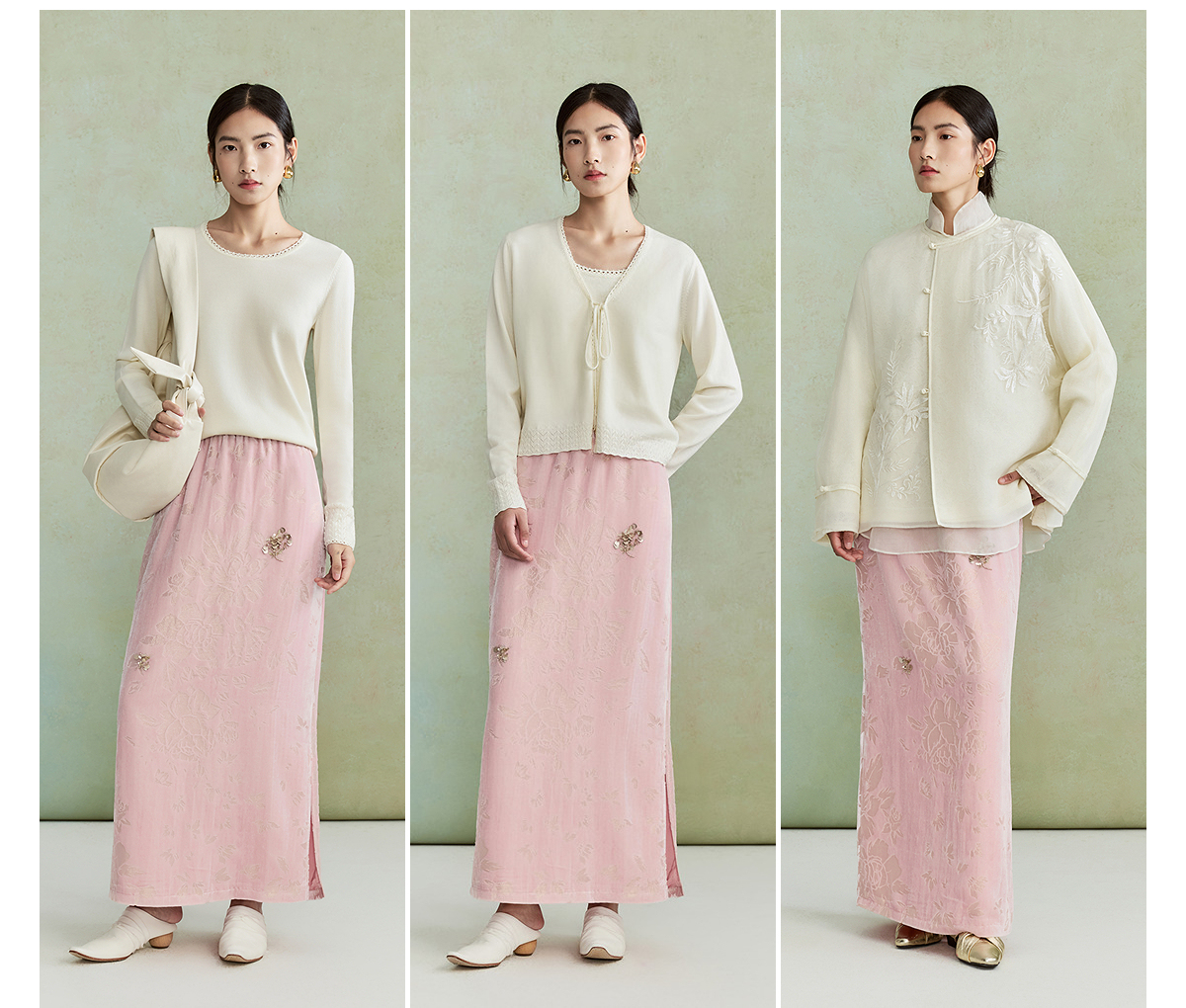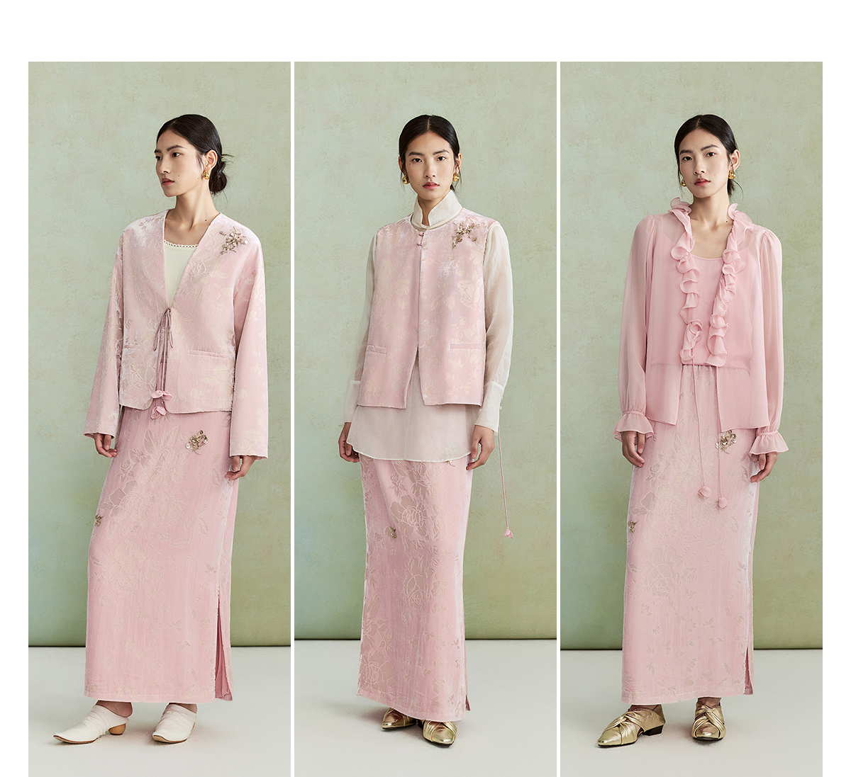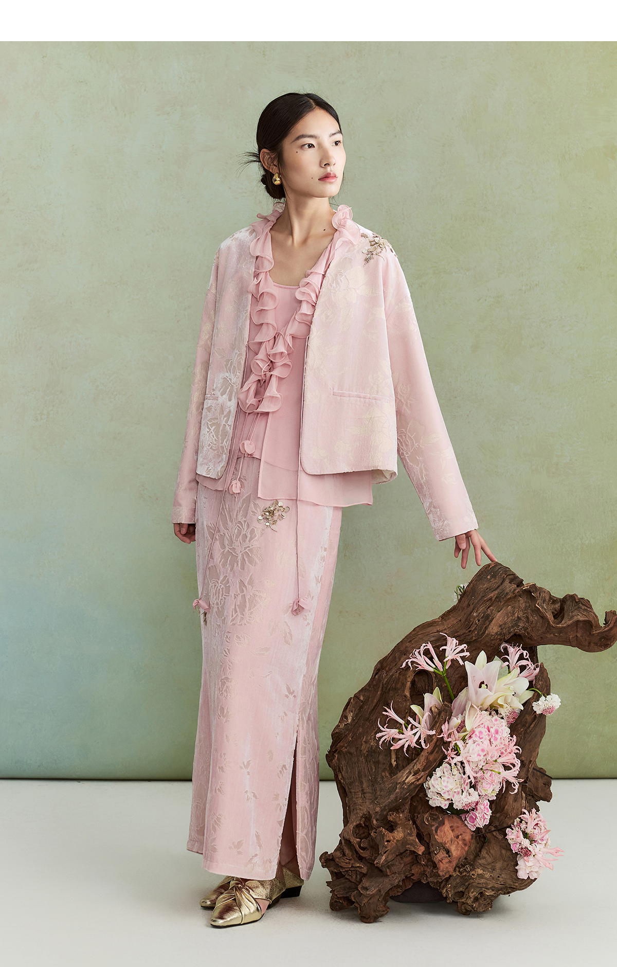 【林栖设计小店】(现货)粉色半身裙新中式丝绒烧花钉珠绣花2026早春新款裙子女1961038