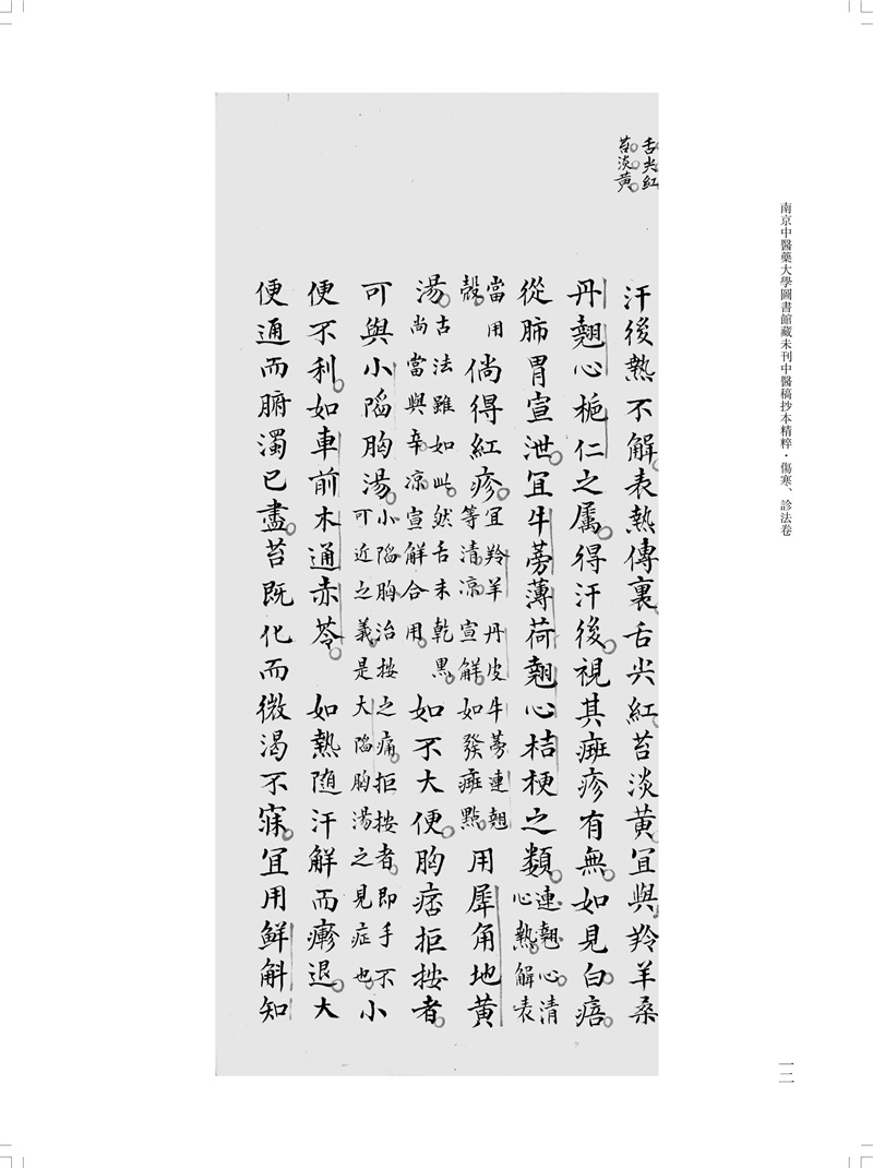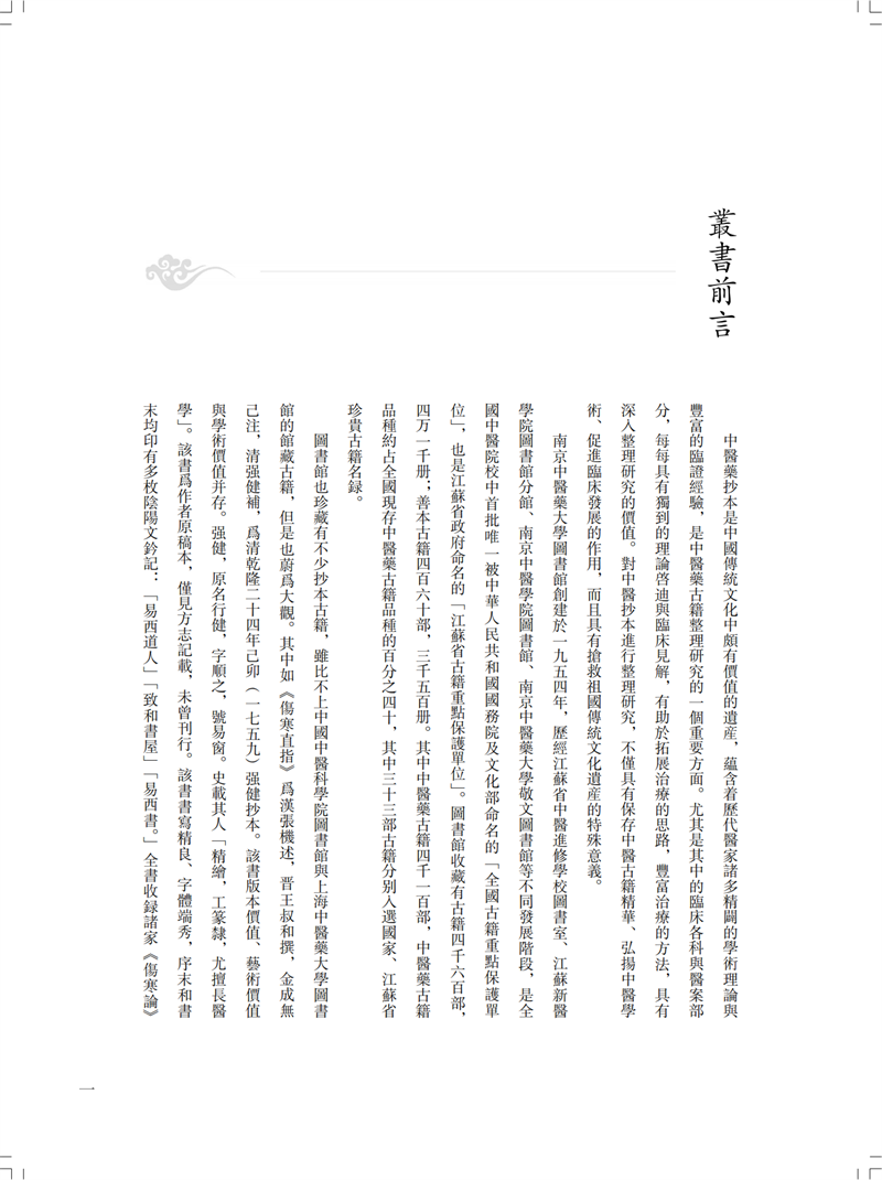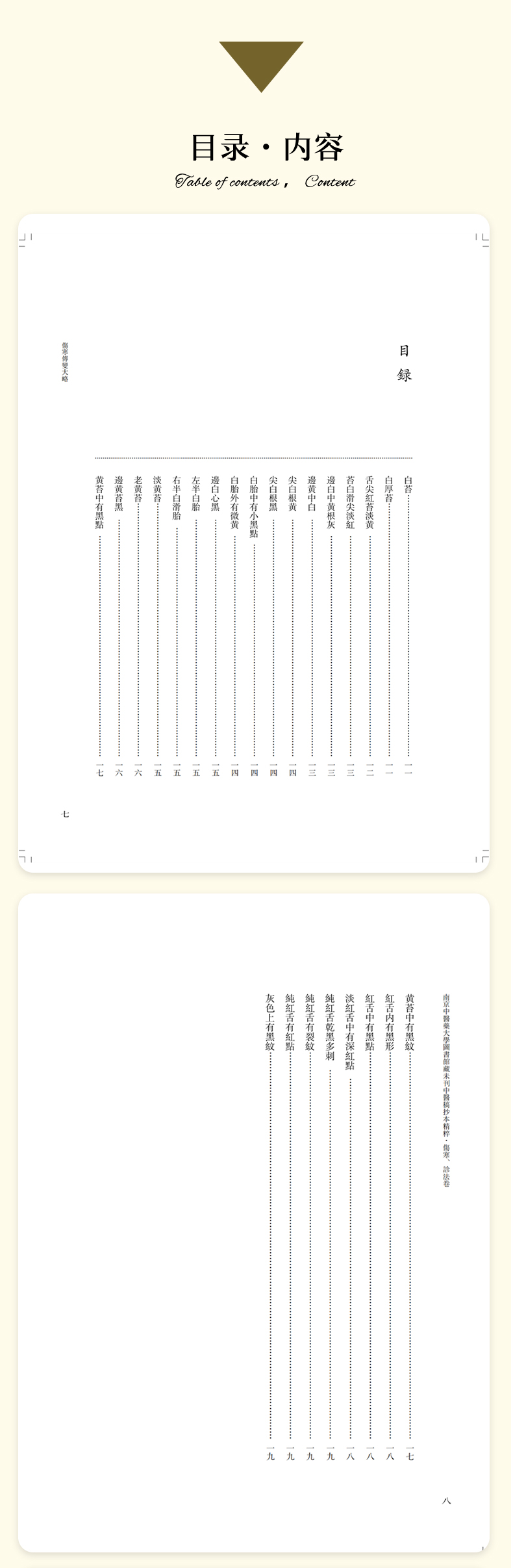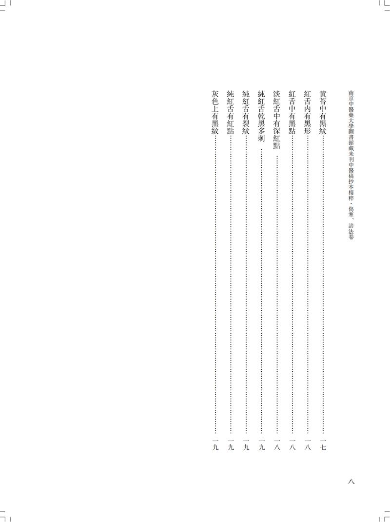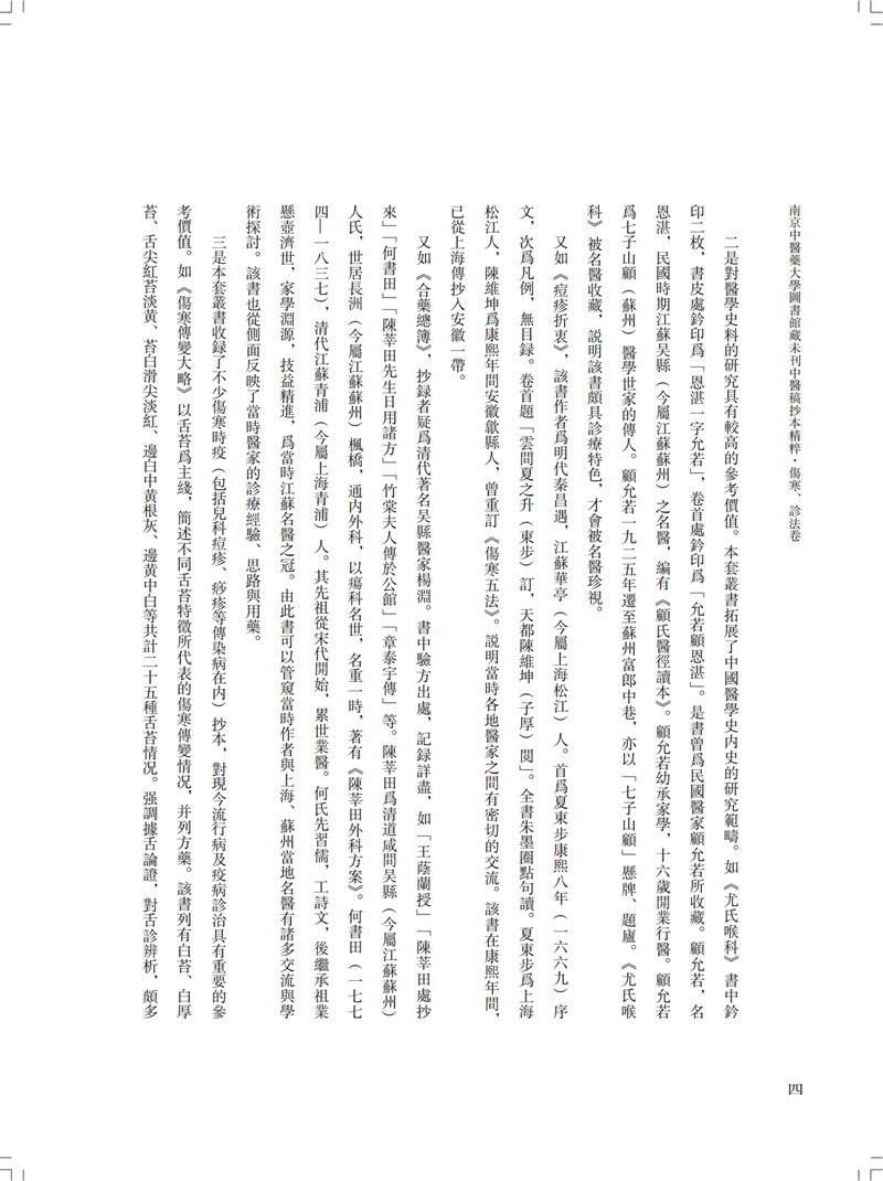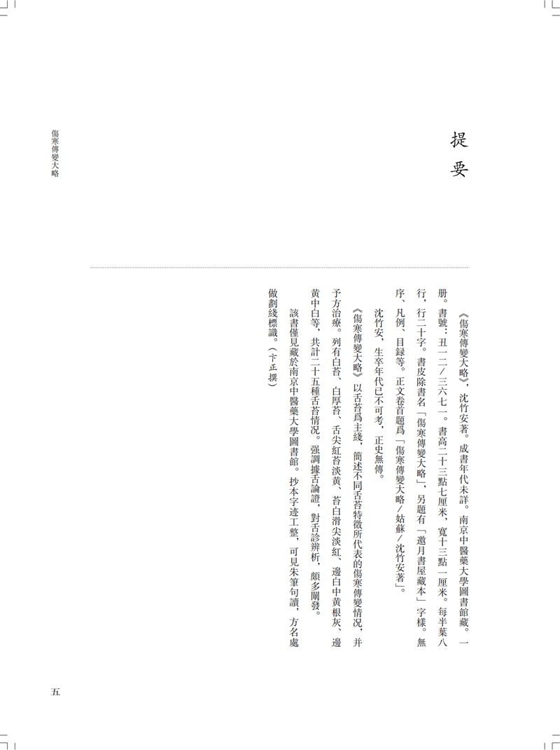 本冊為“南京中醫藥大學圖書館藏未刊中醫稿抄本精粹”之《傷寒、診法卷》,包括《傷寒傳變大略》《疫病證治大略》《杜清碧先生驗證舌法》《傷寒觀舌心法》《脈學》《醫學要覽》六個分冊。《傷寒傳變大略》簡述了不同的舌苔特徵所代表的傷寒傳變情況,共載二十五種舌苔情況,強調據舌論證。《疫病證治大略》論述了汗、吐、下、清、溫補五法對治疫病,五法分列不同方藥、適應證、注意事項等。《杜清碧先生驗證舌法》為論述舌象的專著,列舌象圖譜三十四張,下附有說明及方藥。《傷寒觀舌心法》闡述了九類舌象,每類舌先總論,再附圖描述,包含部分內科雜病、溫病舌象,可作為診斷依據。《脈學》為多本脈診著作的雜抄,內容包括脈法、不同病症脈象及六十七種病症的生死脈等。《醫學要覽》涉及臨床諸多方面,包括診斷、用藥、方劑、治驗等內容,均為世之業醫者必須掌握的治病要言。