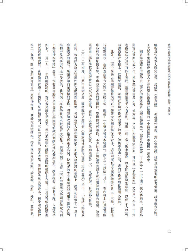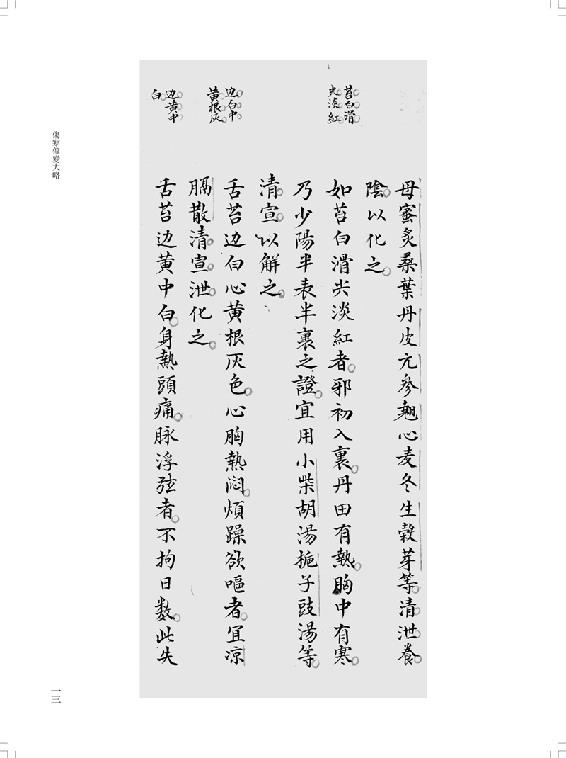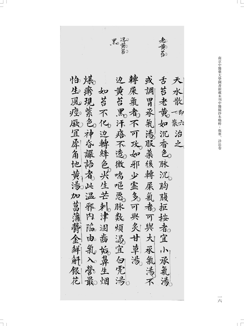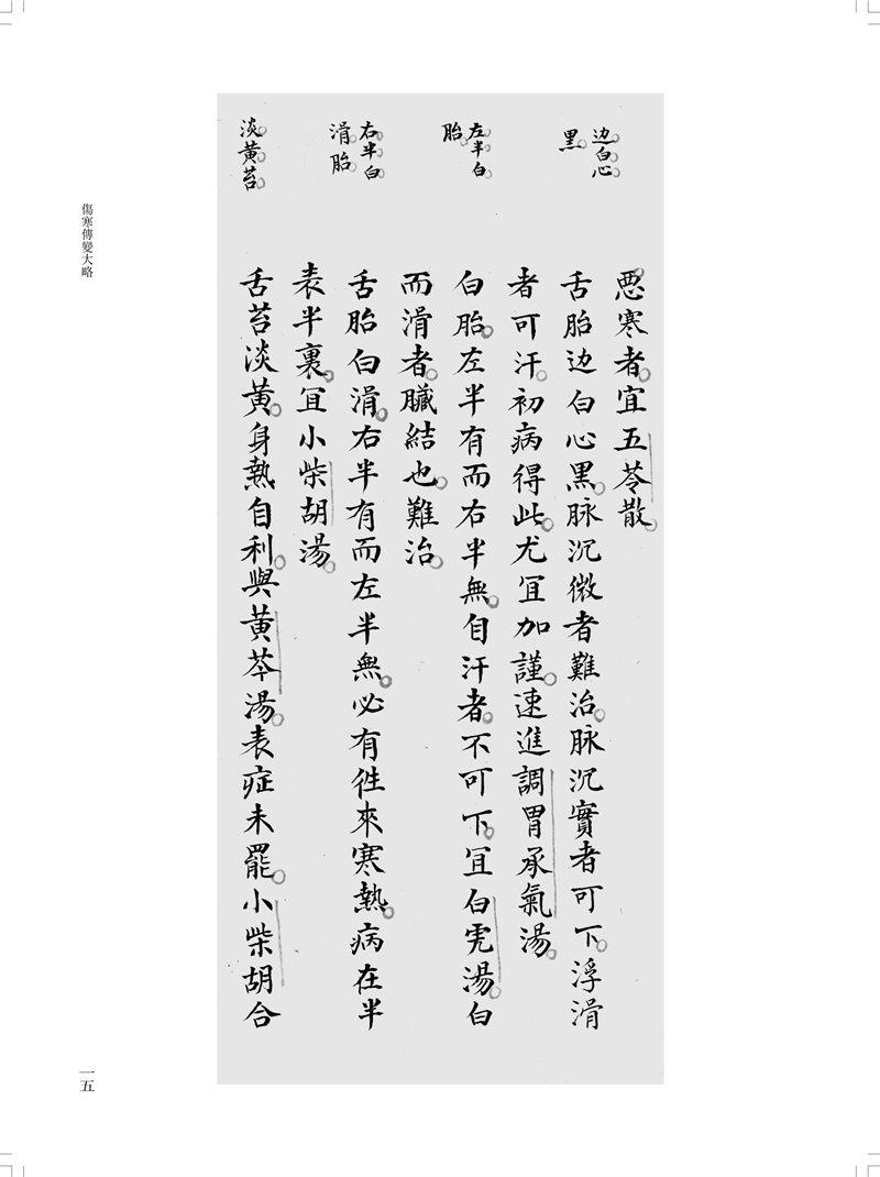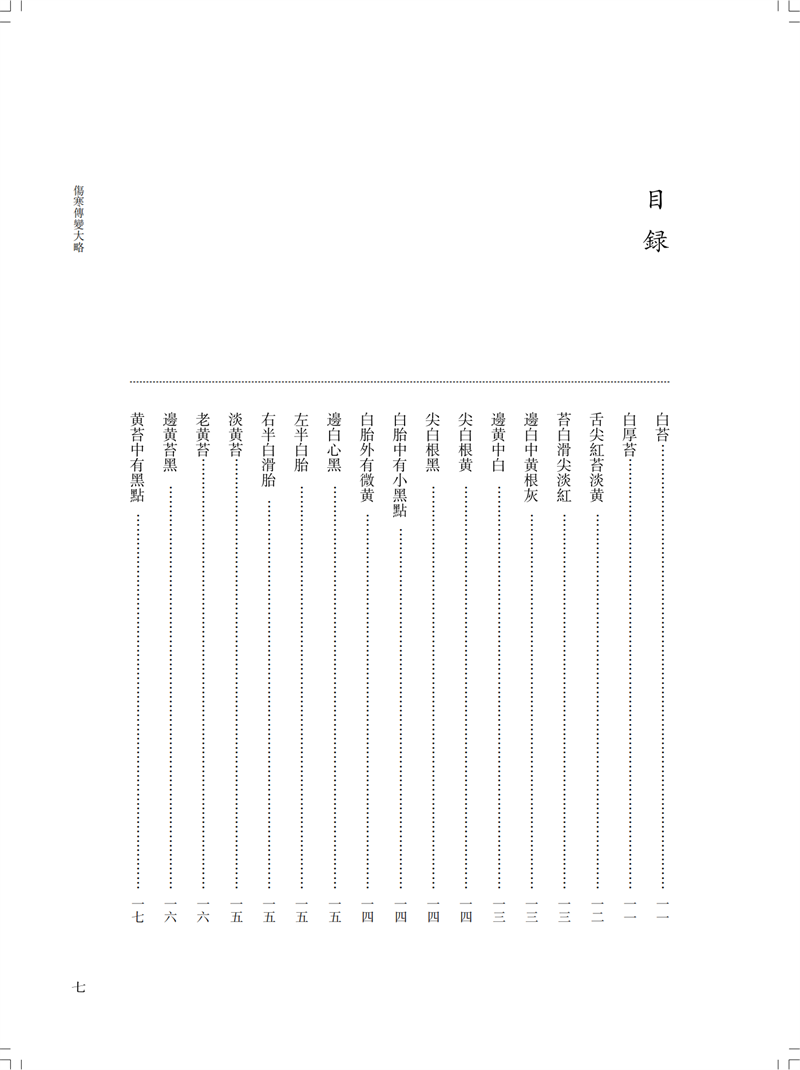 本冊為“南京中醫藥大學圖書館藏未刊中醫稿抄本精粹”之《傷寒、診法卷》,包括《傷寒傳變大略》《疫病證治大略》《杜清碧先生驗證舌法》《傷寒觀舌心法》《脈學》《醫學要覽》六個分冊。《傷寒傳變大略》簡述了不同的舌苔特徵所代表的傷寒傳變情況,共載二十五種舌苔情況,強調據舌論證。《疫病證治大略》論述了汗、吐、下、清、溫補五法對治疫病,五法分列不同方藥、適應證、注意事項等。《杜清碧先生驗證舌法》為論述舌象的專著,列舌象圖譜三十四張,下附有說明及方藥。《傷寒觀舌心法》闡述了九類舌象,每類舌先總論,再附圖描述,包含部分內科雜病、溫病舌象,可作為診斷依據。《脈學》為多本脈診著作的雜抄,內容包括脈法、不同病症脈象及六十七種病症的生死脈等。《醫學要覽》涉及臨床諸多方面,包括診斷、用藥、方劑、治驗等內容,均為世之業醫者必須掌握的治病要言。
