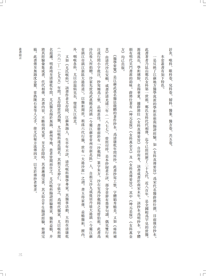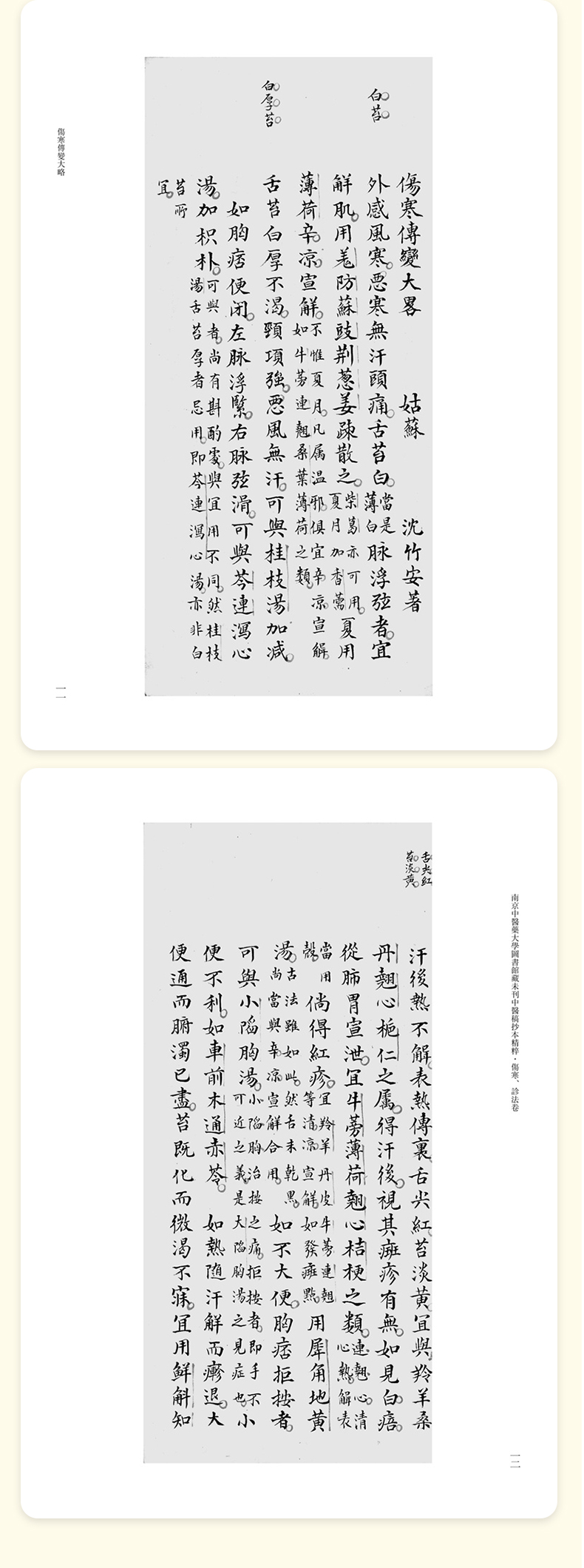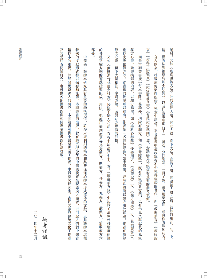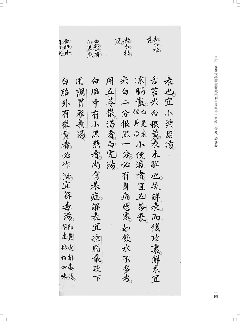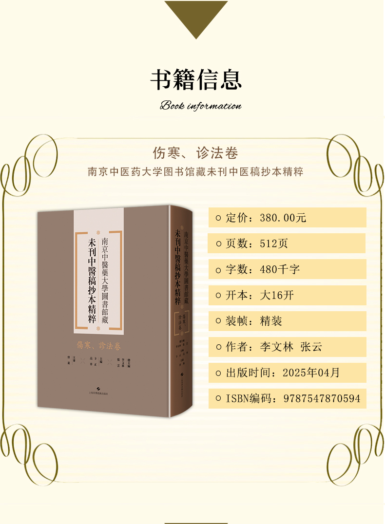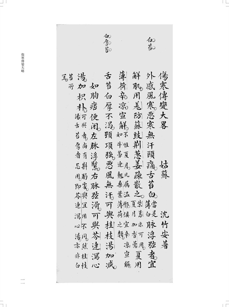 本冊為“南京中醫藥大學圖書館藏未刊中醫稿抄本精粹”之《傷寒、診法卷》,包括《傷寒傳變大略》《疫病證治大略》《杜清碧先生驗證舌法》《傷寒觀舌心法》《脈學》《醫學要覽》六個分冊。《傷寒傳變大略》簡述了不同的舌苔特徵所代表的傷寒傳變情況,共載二十五種舌苔情況,強調據舌論證。《疫病證治大略》論述了汗、吐、下、清、溫補五法對治疫病,五法分列不同方藥、適應證、注意事項等。《杜清碧先生驗證舌法》為論述舌象的專著,列舌象圖譜三十四張,下附有說明及方藥。《傷寒觀舌心法》闡述了九類舌象,每類舌先總論,再附圖描述,包含部分內科雜病、溫病舌象,可作為診斷依據。《脈學》為多本脈診著作的雜抄,內容包括脈法、不同病症脈象及六十七種病症的生死脈等。《醫學要覽》涉及臨床諸多方面,包括診斷、用藥、方劑、治驗等內容,均為世之業醫者必須掌握的治病要言。