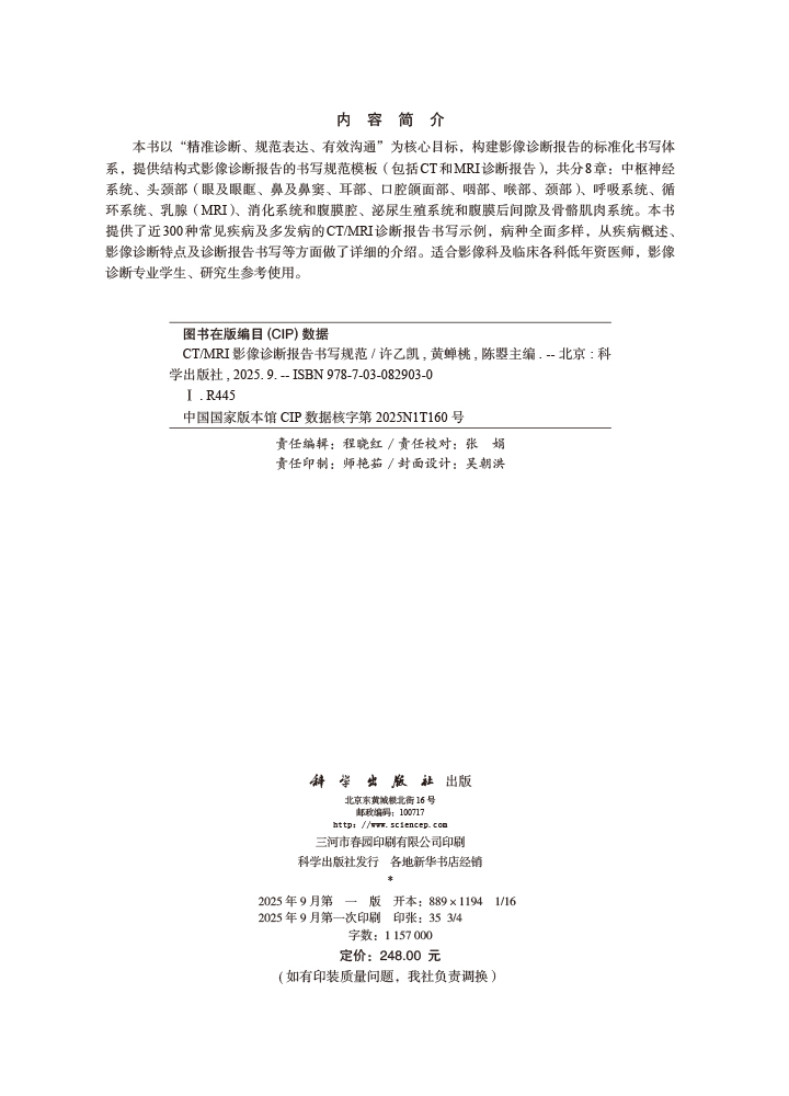 CT/MRI影像诊断报告书写规范 许乙凯 黄婵桃 陈曌 适合影像科及临床各科低年资医师 影像诊断专业学生 研究生参考使用 科学出版社