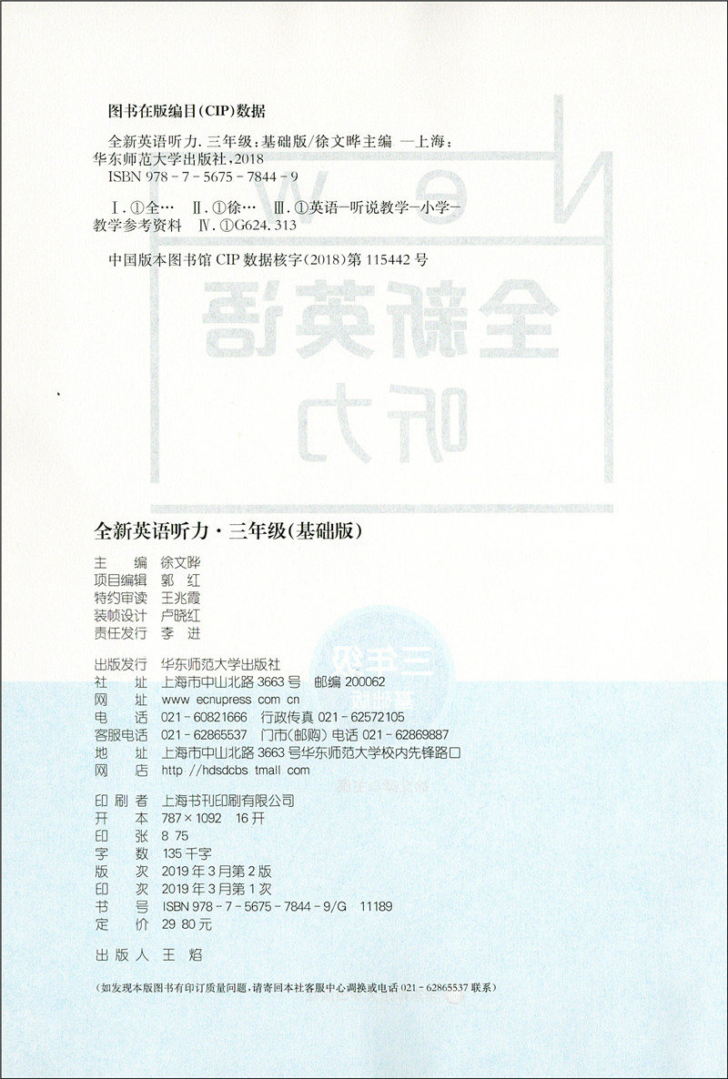 2020新版 全新英语听力三年级基础版 小学3年级英语听力 扫码听录音 小学生英语听力练习 英语听力强化训练 华东师范大学出版社