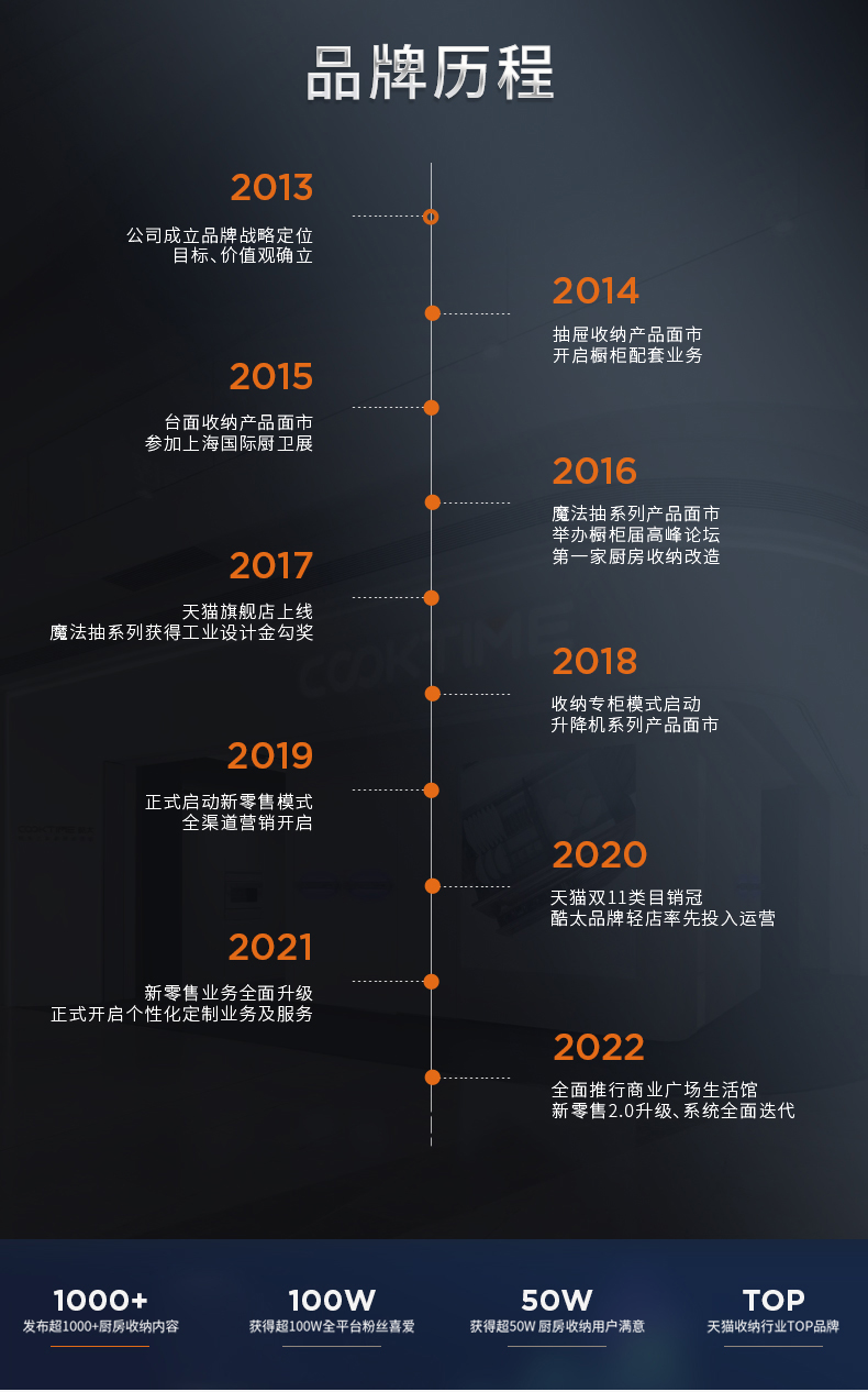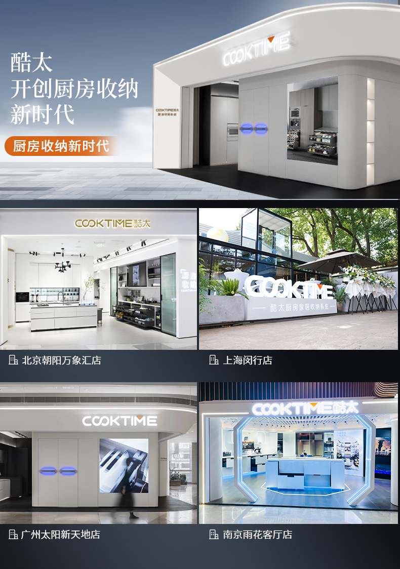 - 酷太坚持8年自主研发,已获得专利证书130项,拥有一套领先市场的厨房收纳系统,为千万中国家庭解决厨房脏乱差,缔造厨房新生活。