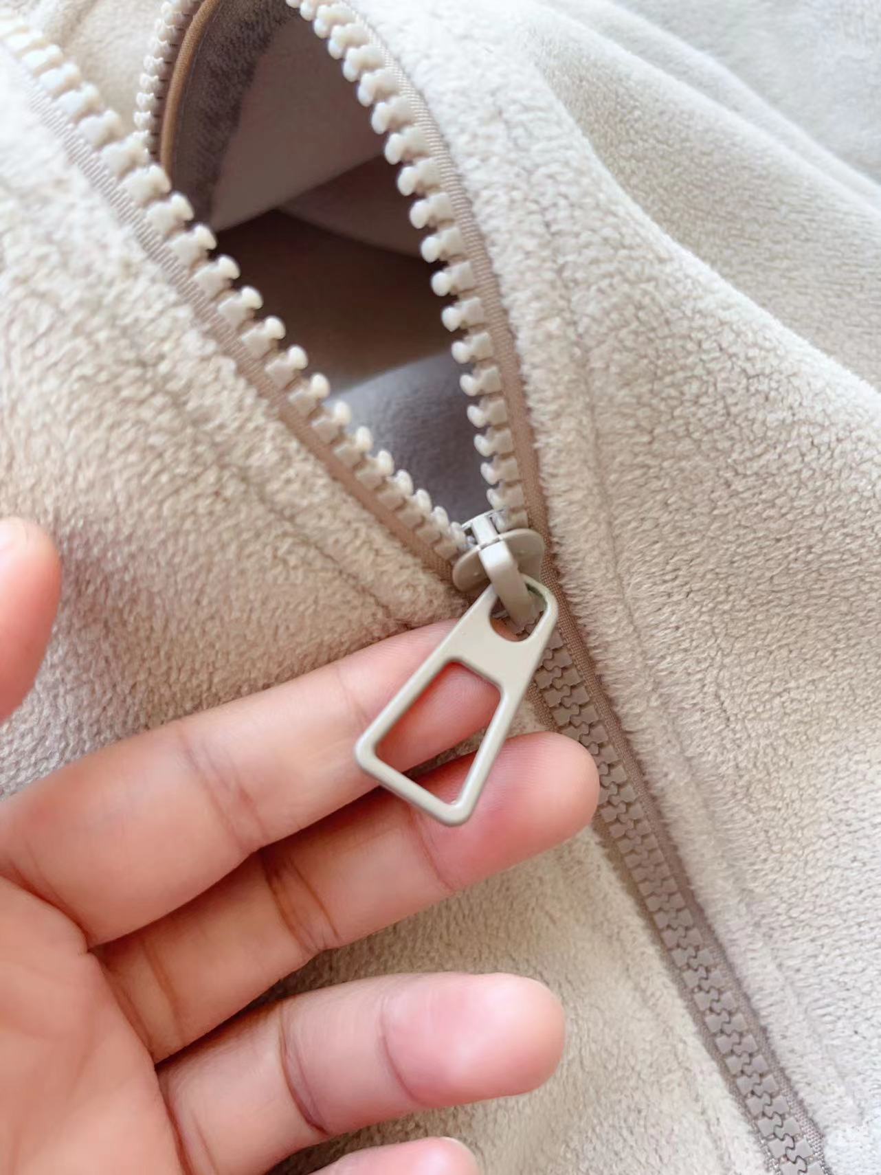 穿上又轻又暖,手感顺滑,拉一下也完全不会掉毛絮,拉链也相当顺滑。小立领,拉到顶部可以保护颈部更温暖,袋鼠兜兜这个细节也很爱,双手也可以取个暖