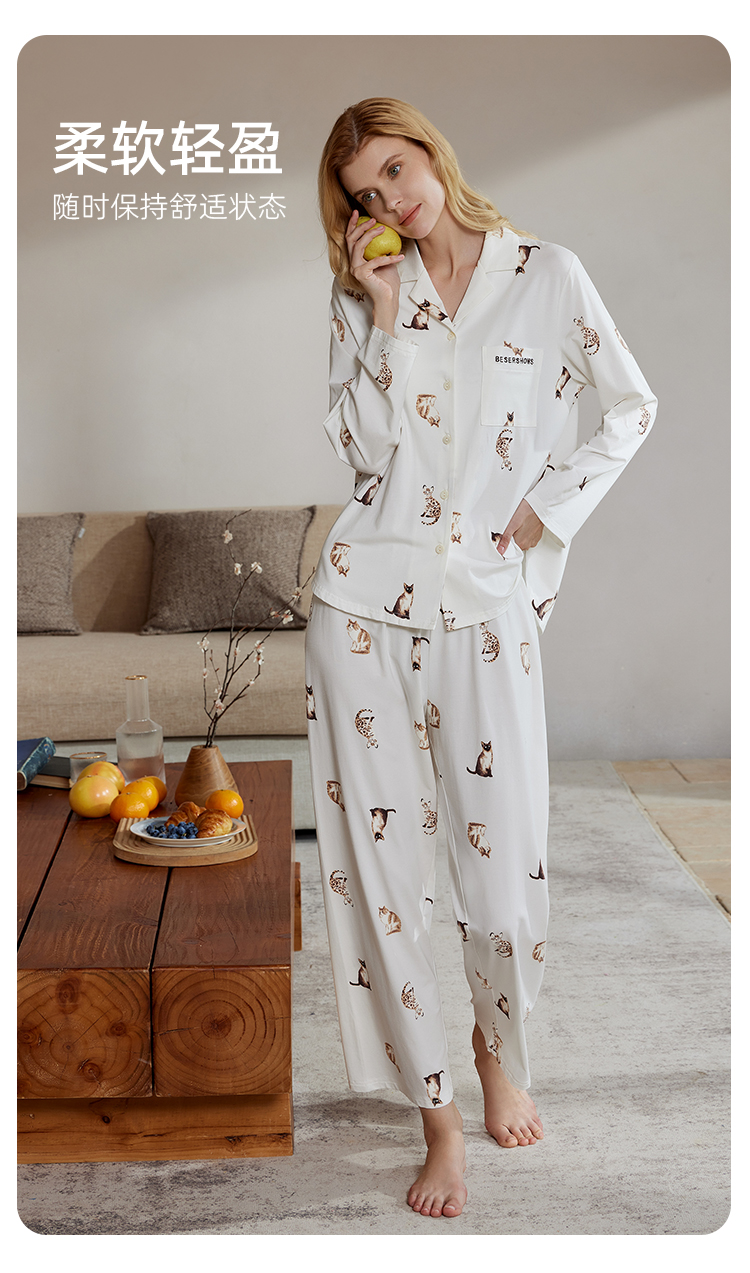 皇家丽美新款兰精莫代尔长绒棉家居服睡衣春秋长袖套装女款猫咪印花JJT90044