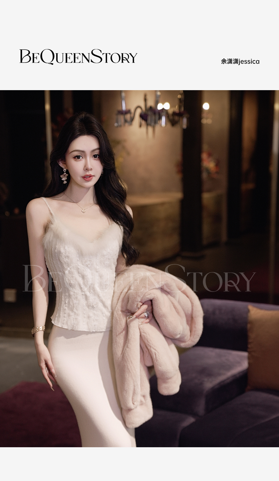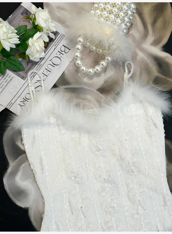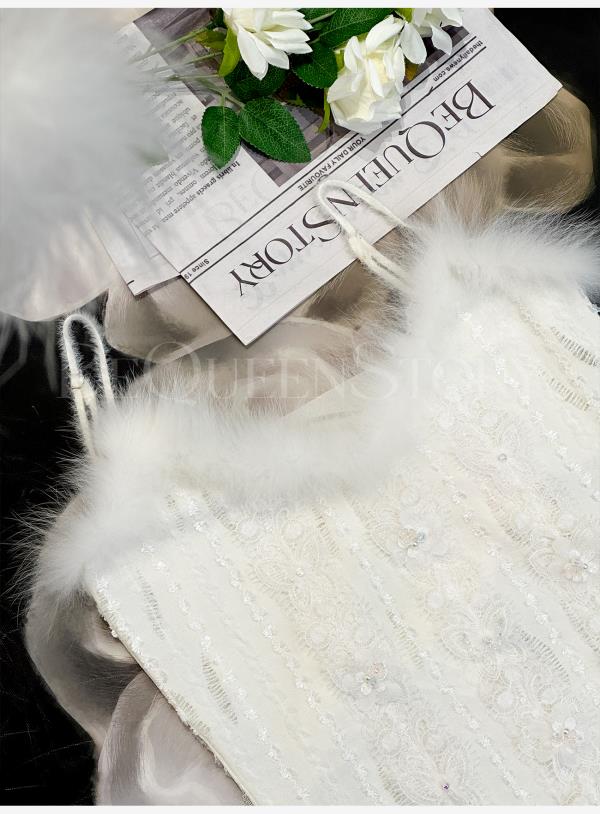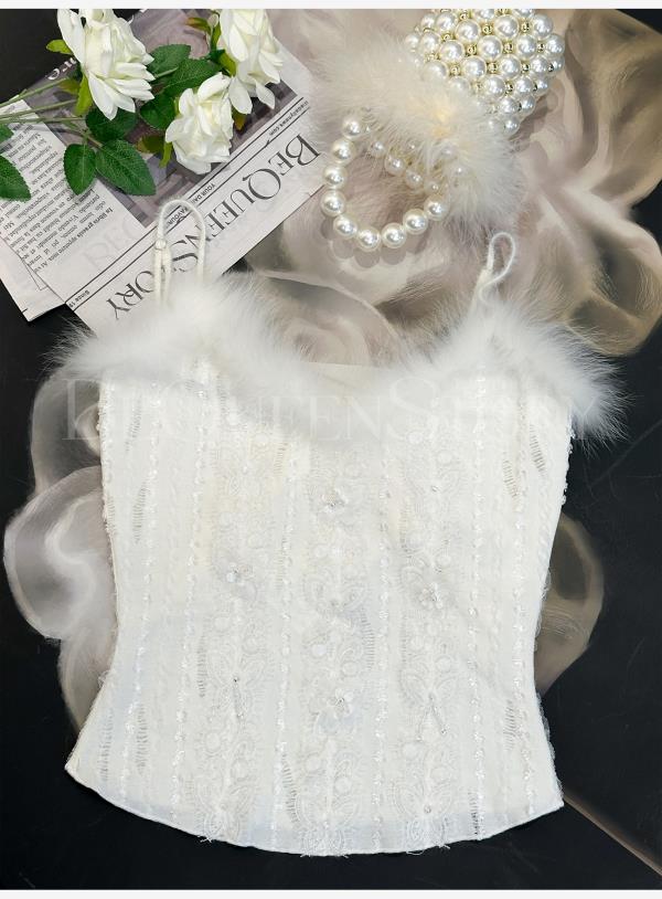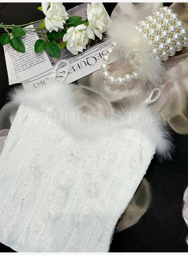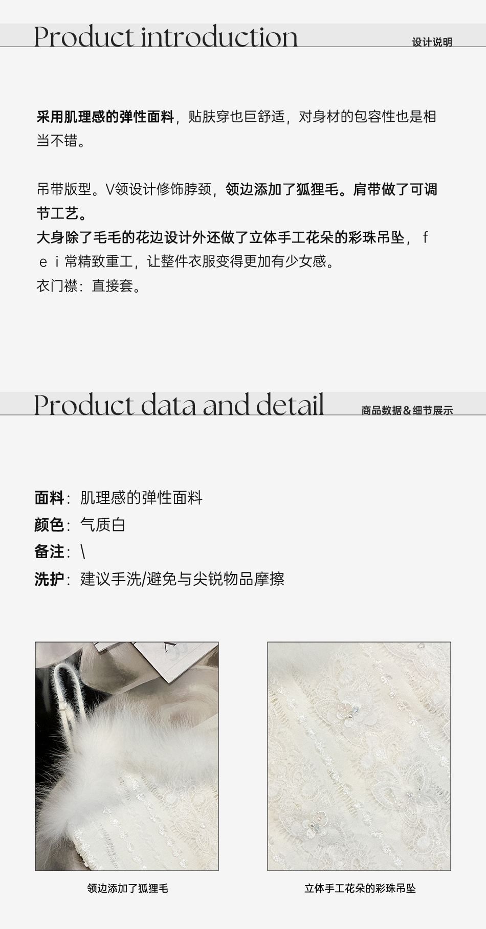 余潇潇【雪夜凝香】立体手工花朵彩珠吊坠拼接毛毛白色吊带背心内搭