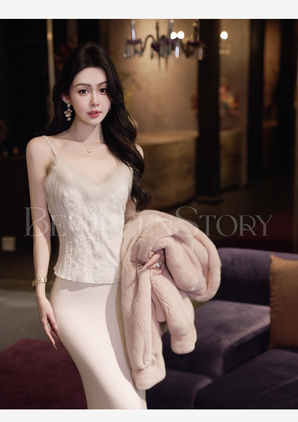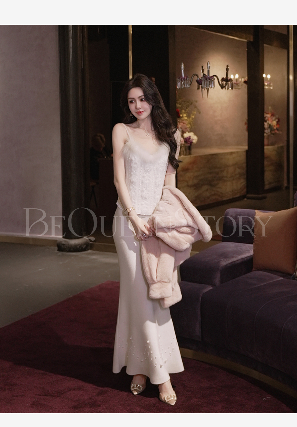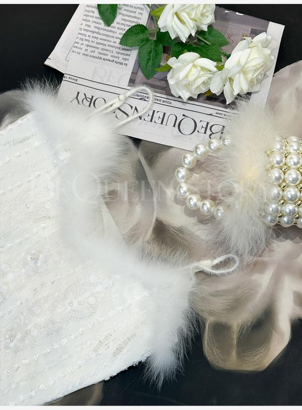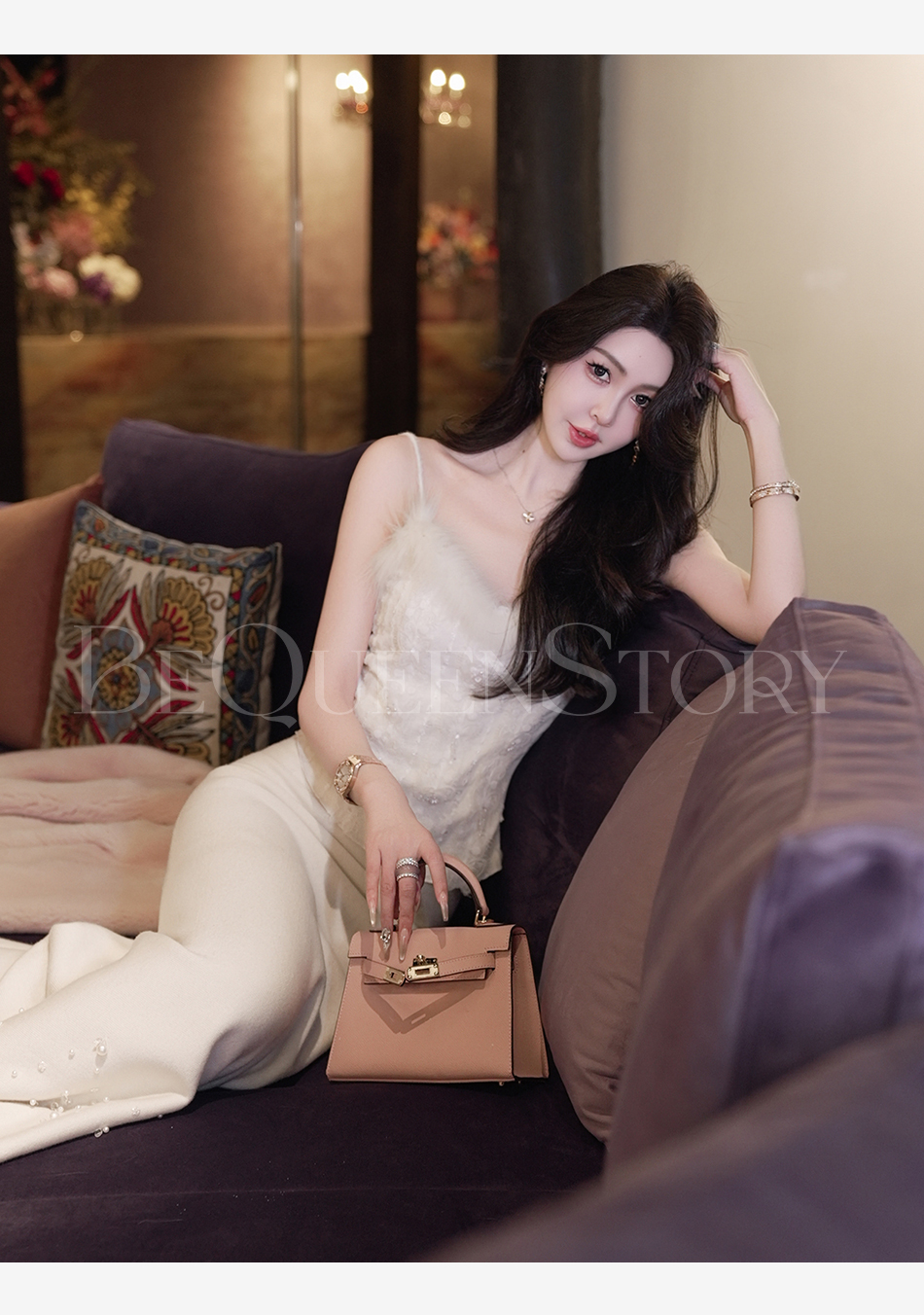 余潇潇【雪夜凝香】立体手工花朵彩珠吊坠拼接毛毛白色吊带背心内搭