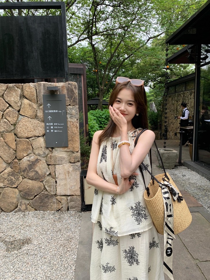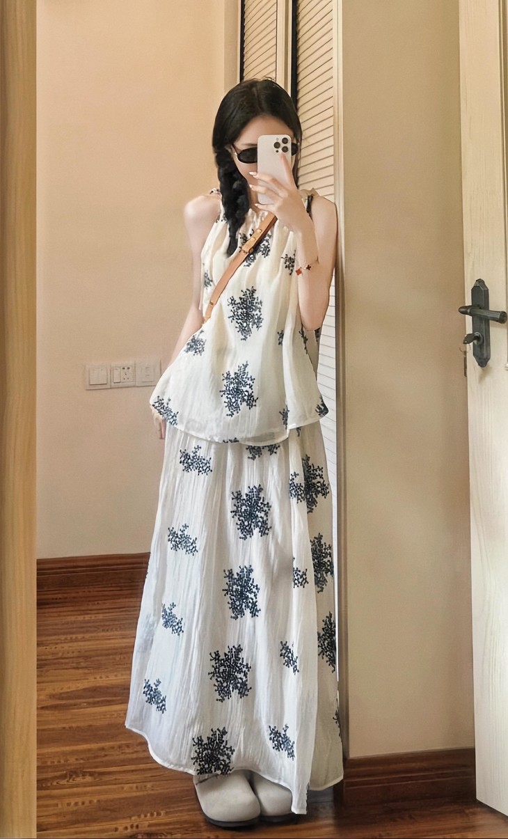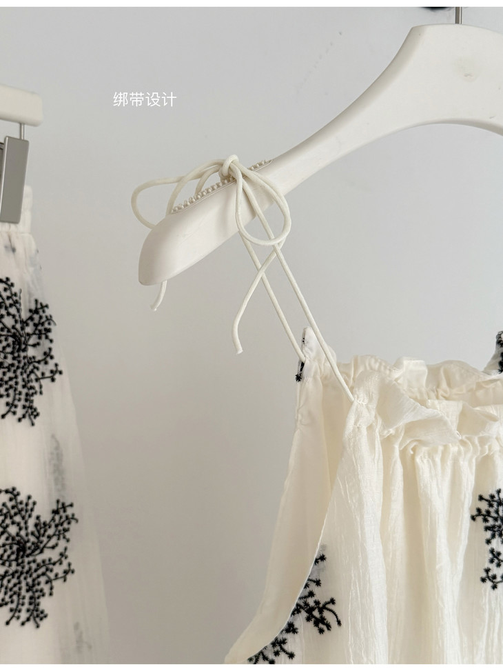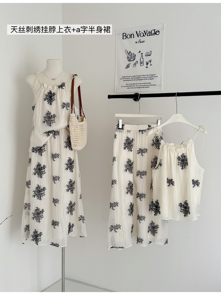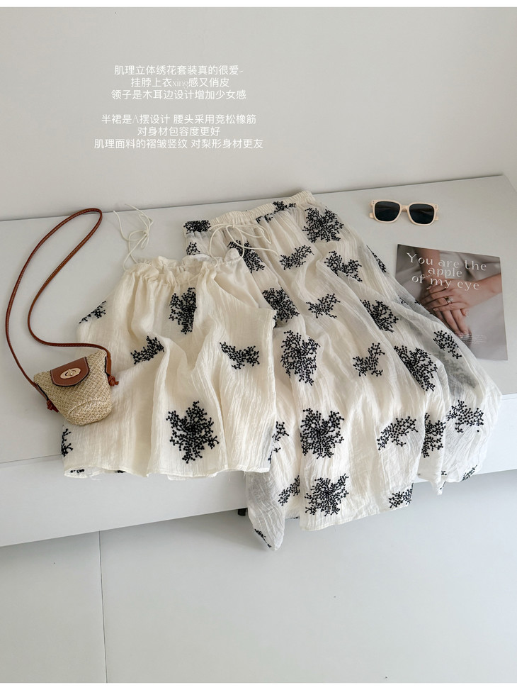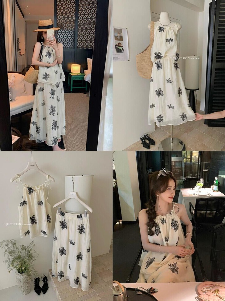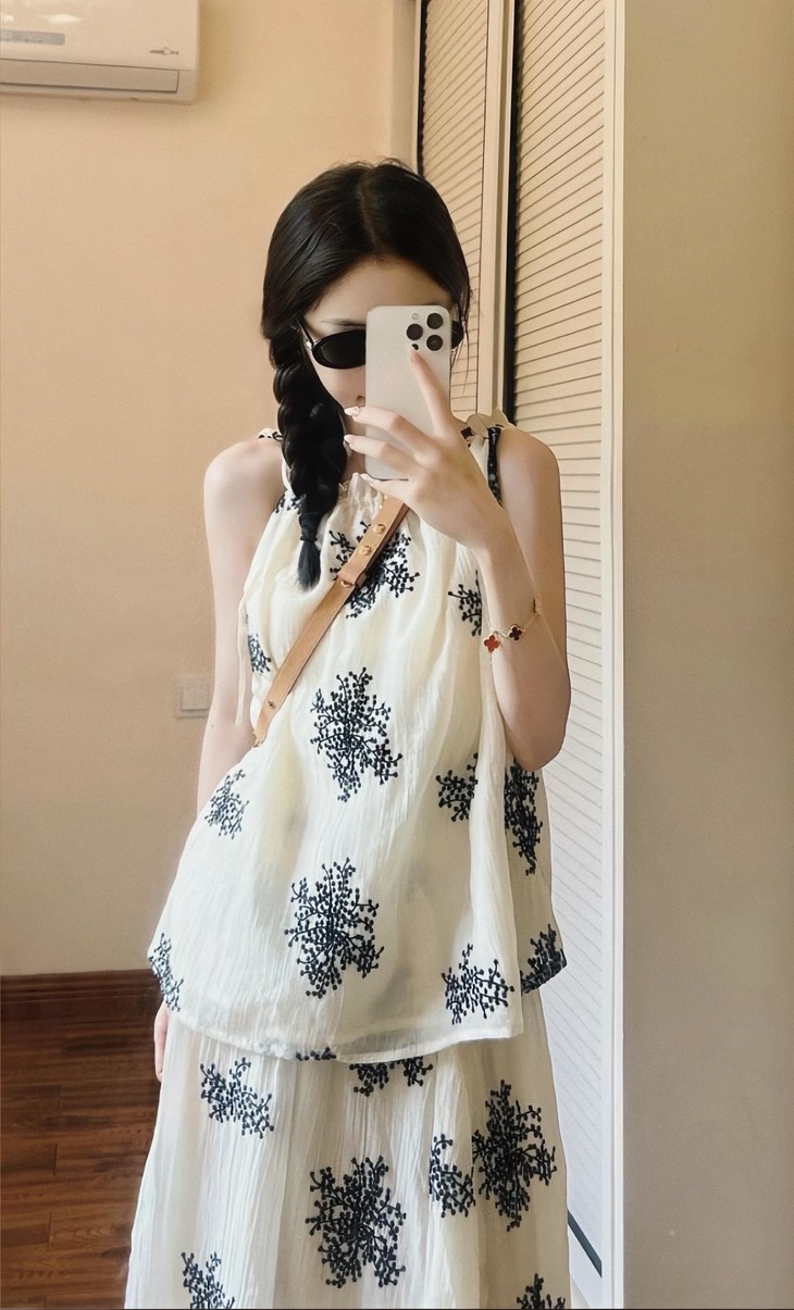 救命‼️谁懂啊😭 👉最近超爱的【刺绣系带挂脖小衫+松紧腰A字裙】套装 这套刺绣套装简直是夏日甜妹氛围感的收割机❗️ 温柔到骨子里 我愿称它为行走的温柔制造机❗️ 每次穿出门都被追着问链接 那种被夸到不好意思的快乐,全靠它给! ✅这一套直接把“温柔感拉满” 上身一整个清冷气质的温柔感~ 刻进DNA 里的那种😜