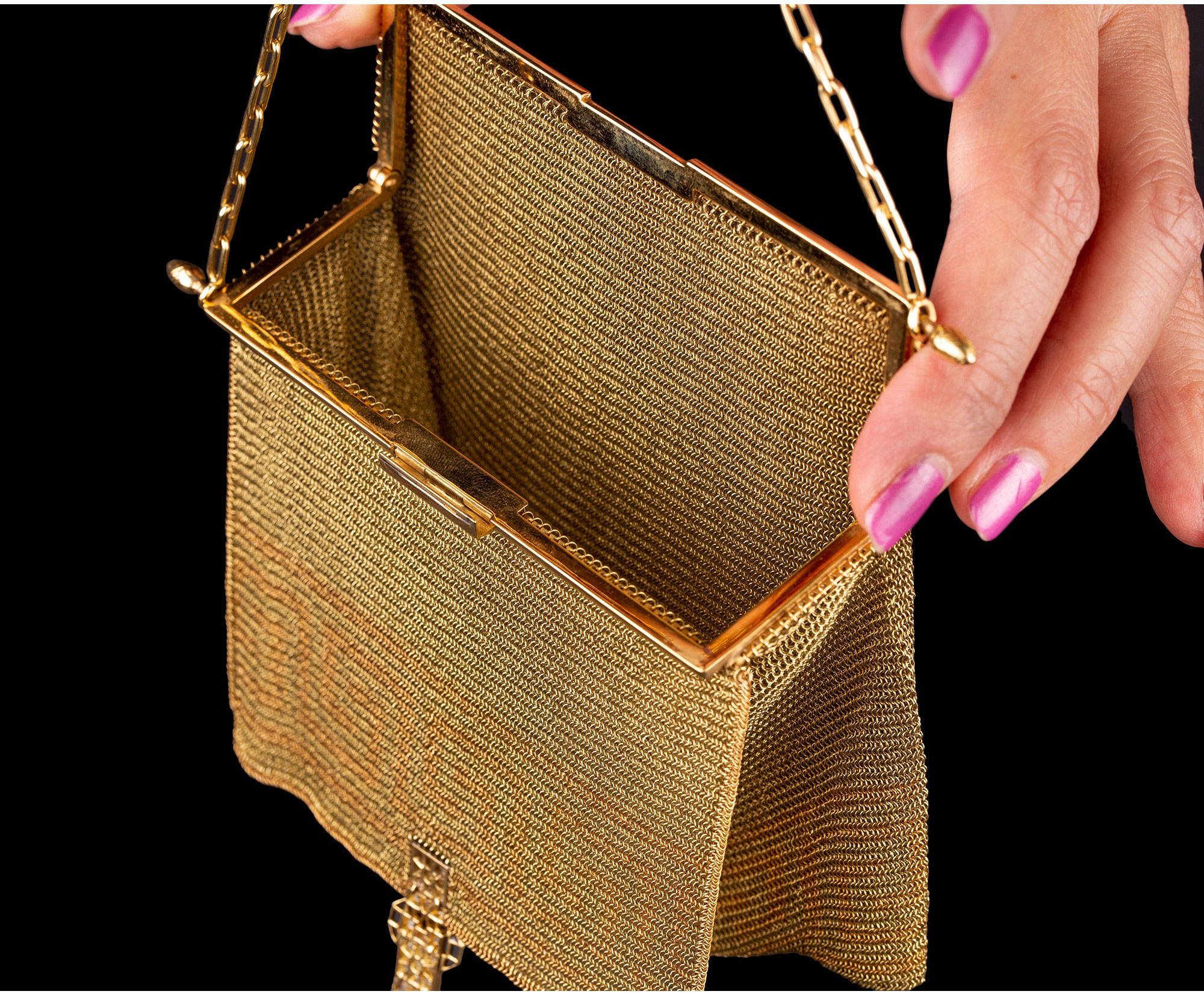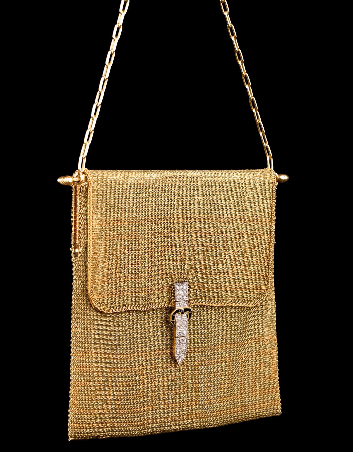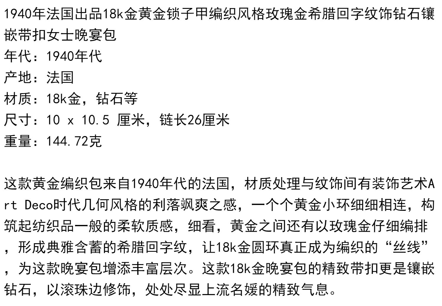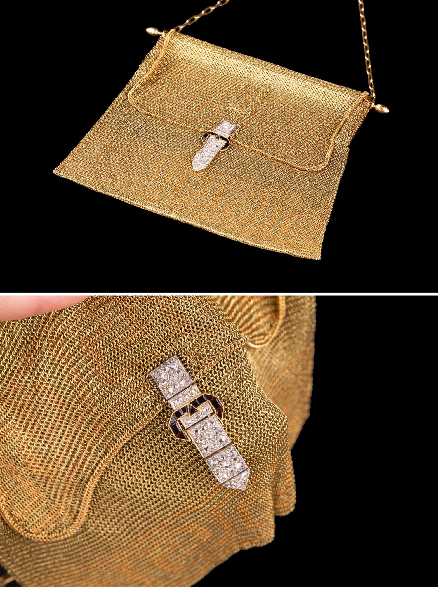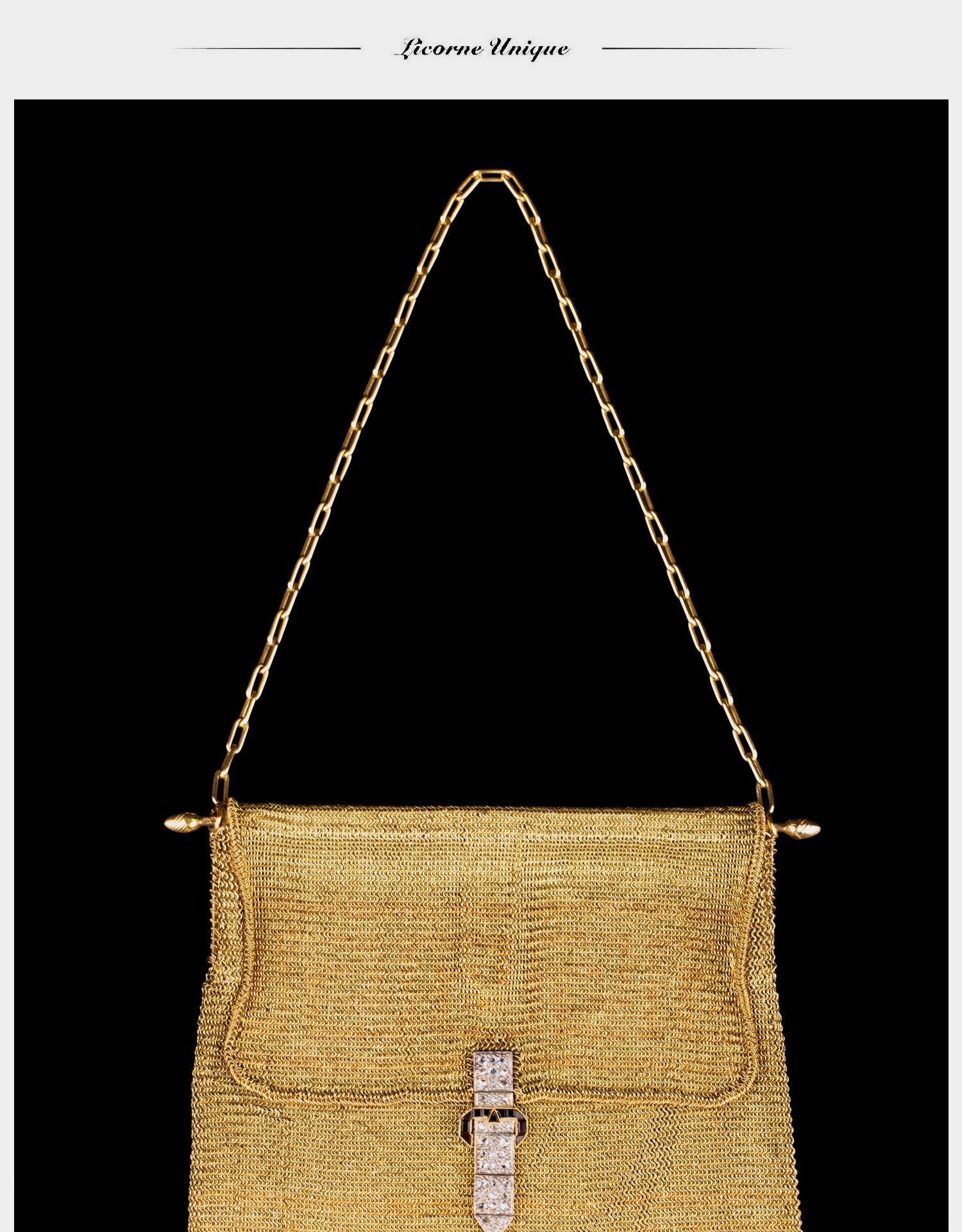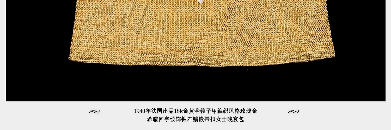 独角鹿西洋古董18K金黄金锁子甲编织希腊回字纹镶钻石女士晚宴包