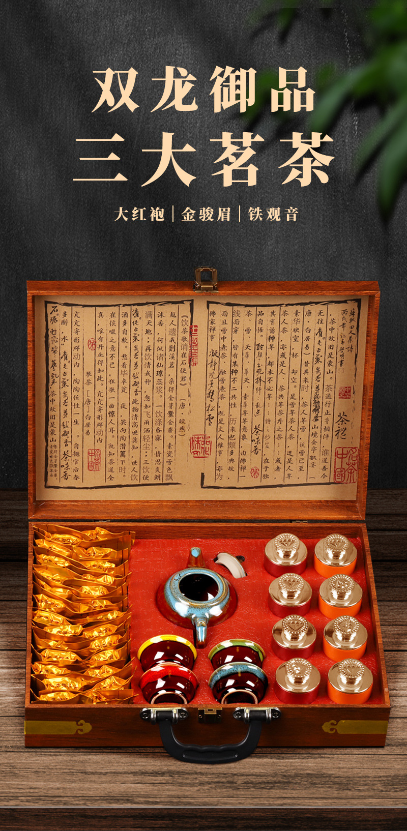 【双龙御品!三大茗茶+茶具礼盒套装】好茶好运,一盒送福!武夷山大红袍正岩金骏眉红茶铁观音乌龙茶茶叶