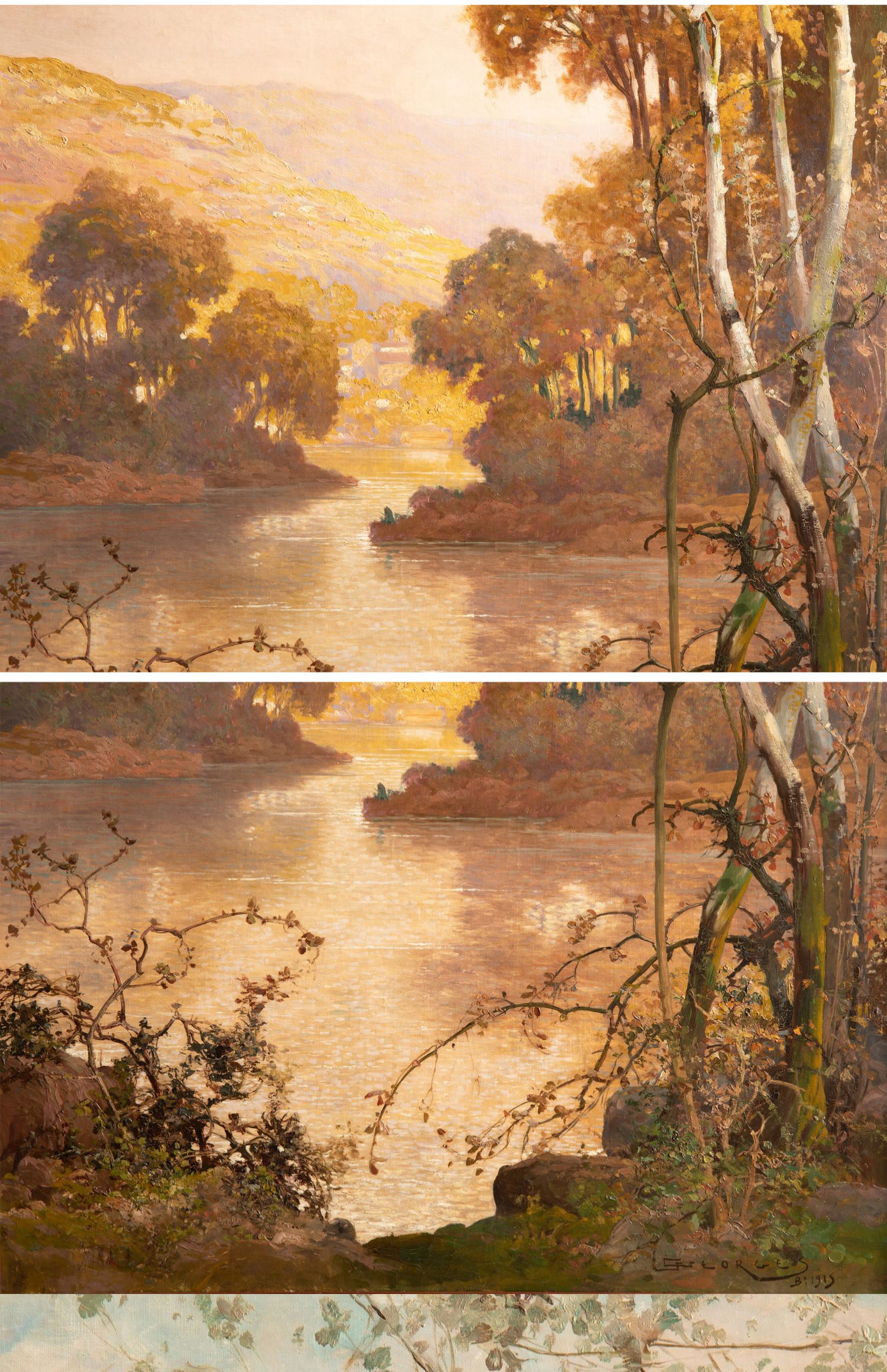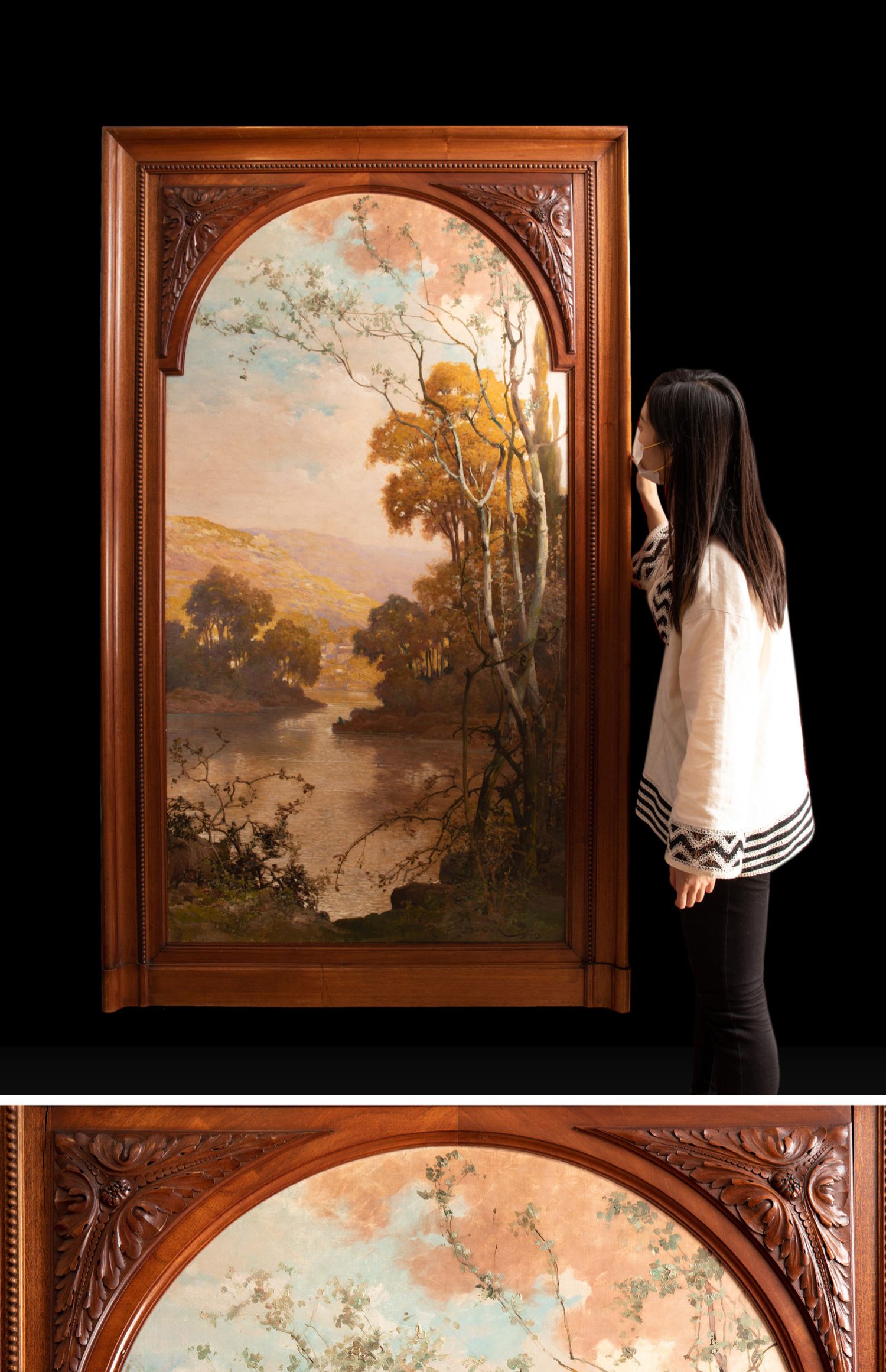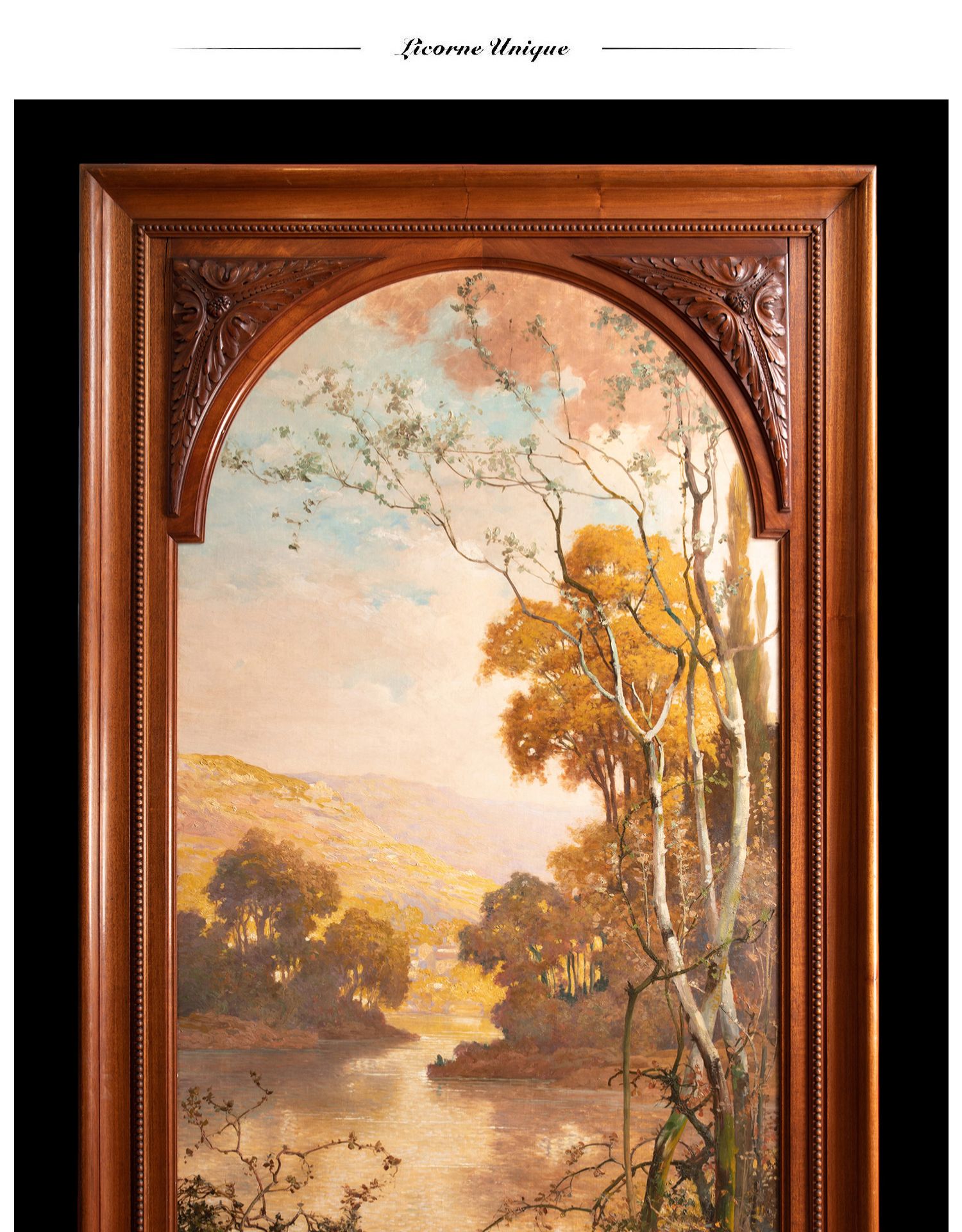 独角鹿西洋古董法国画家J. Georges风景布面油画金林秋波独钓人