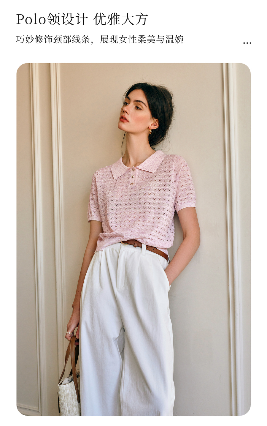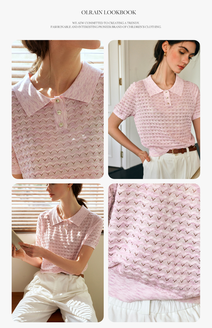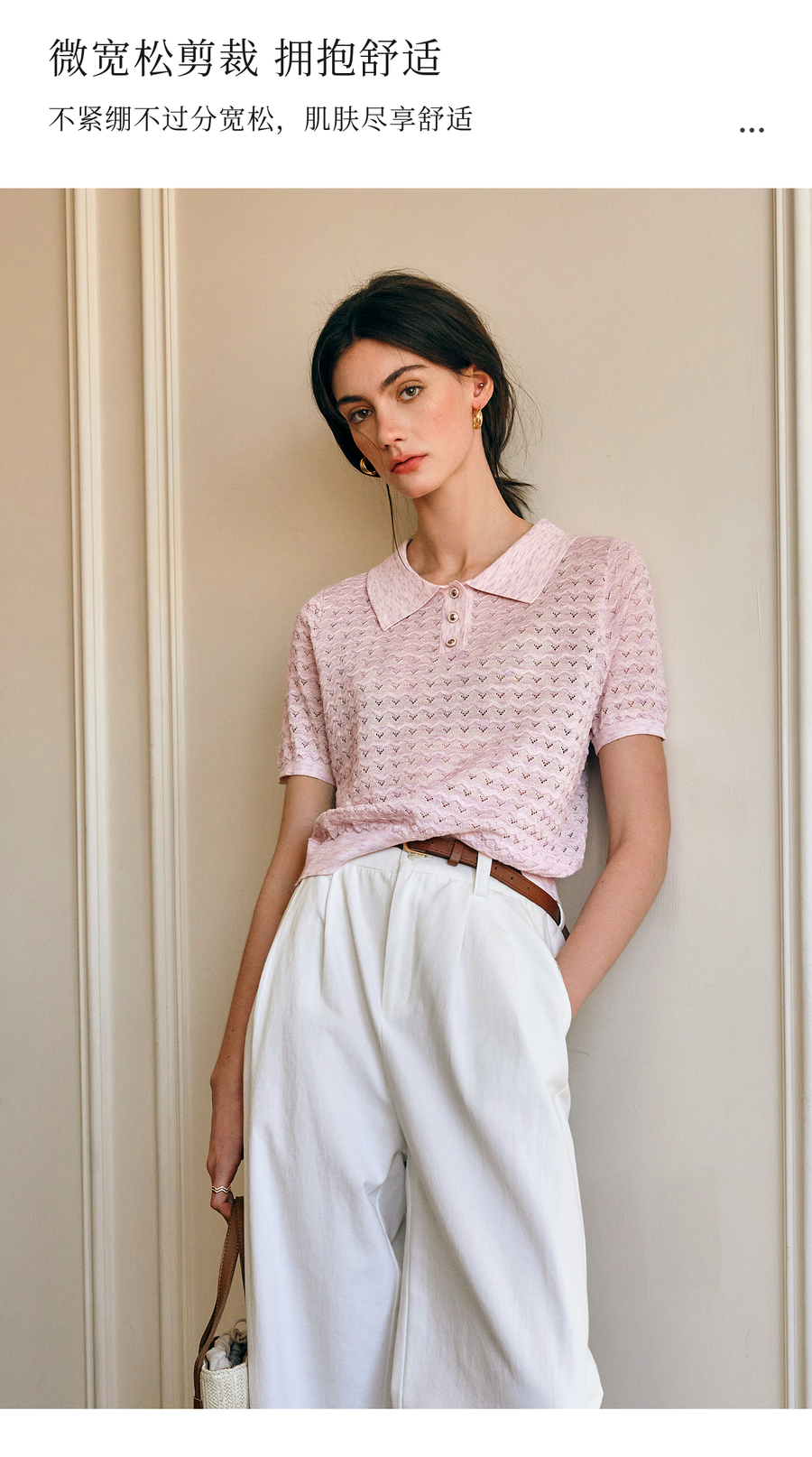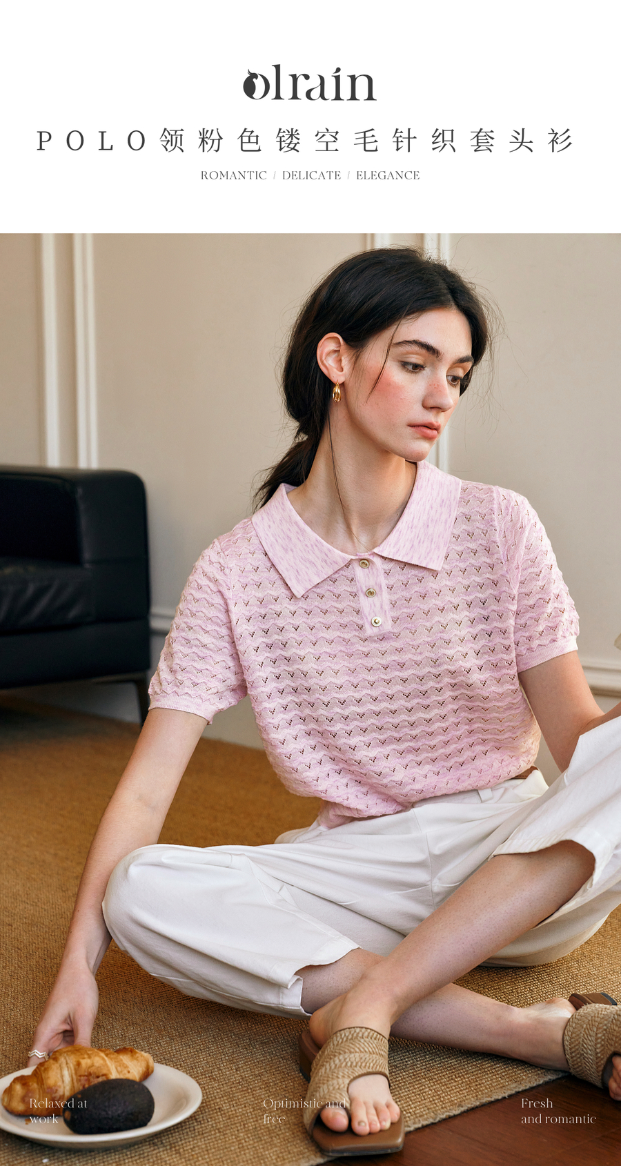 OLrain欧芮儿2025夏季新款POLO领粉色系通勤镂空短袖针织T恤衫女