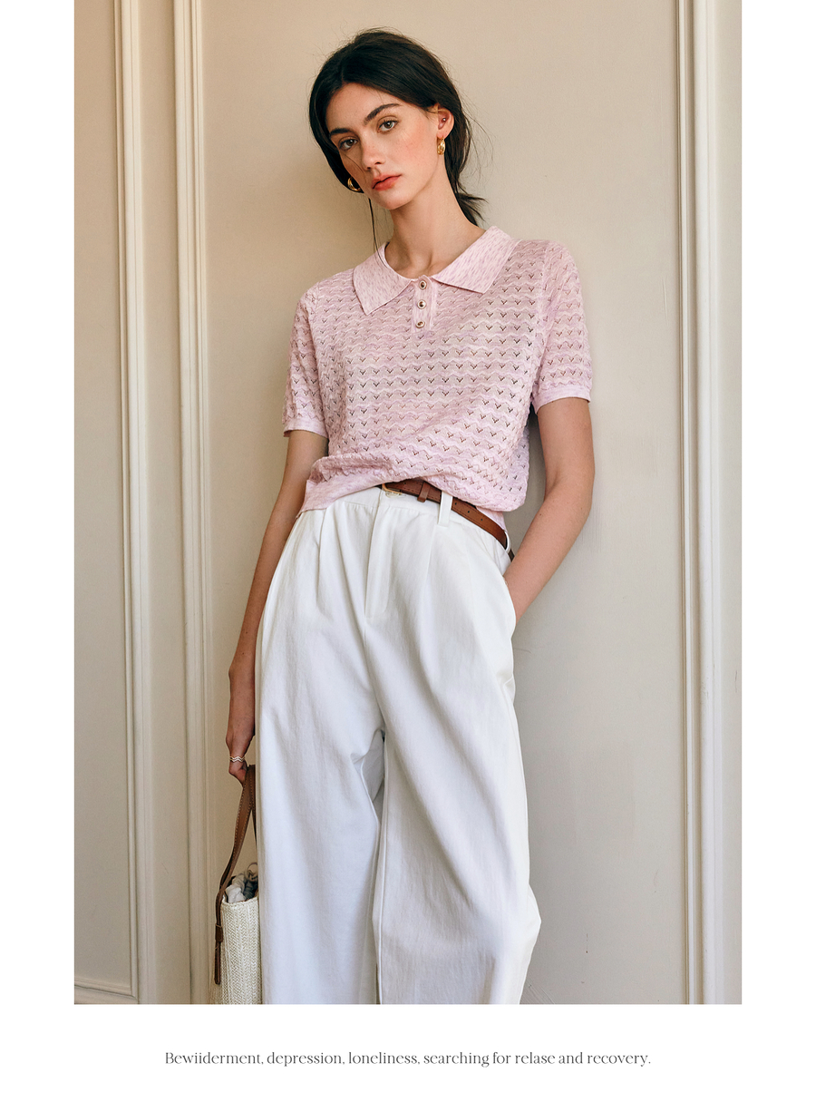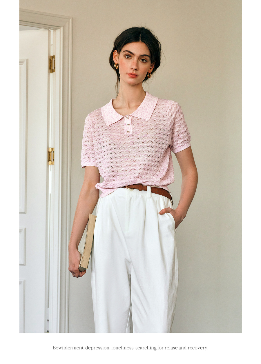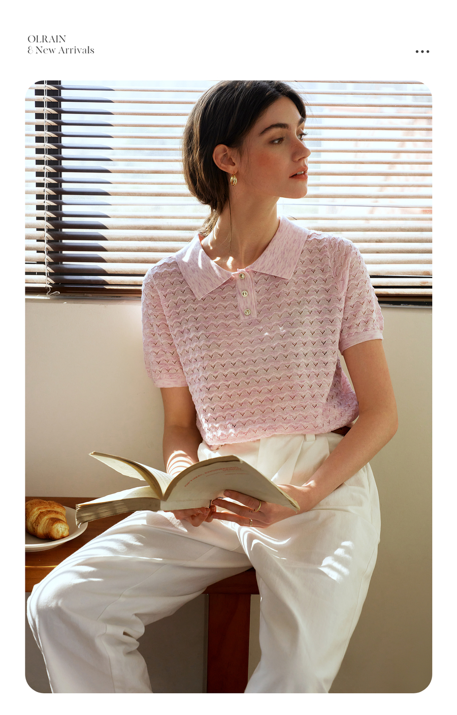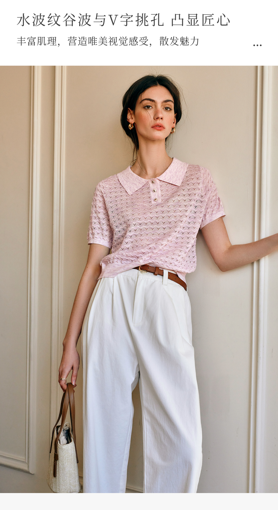 OLrain欧芮儿2025夏季新款POLO领粉色系通勤镂空短袖针织T恤衫女
