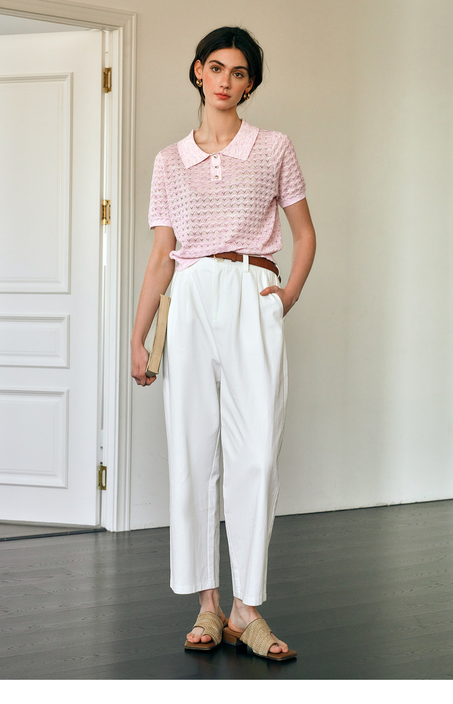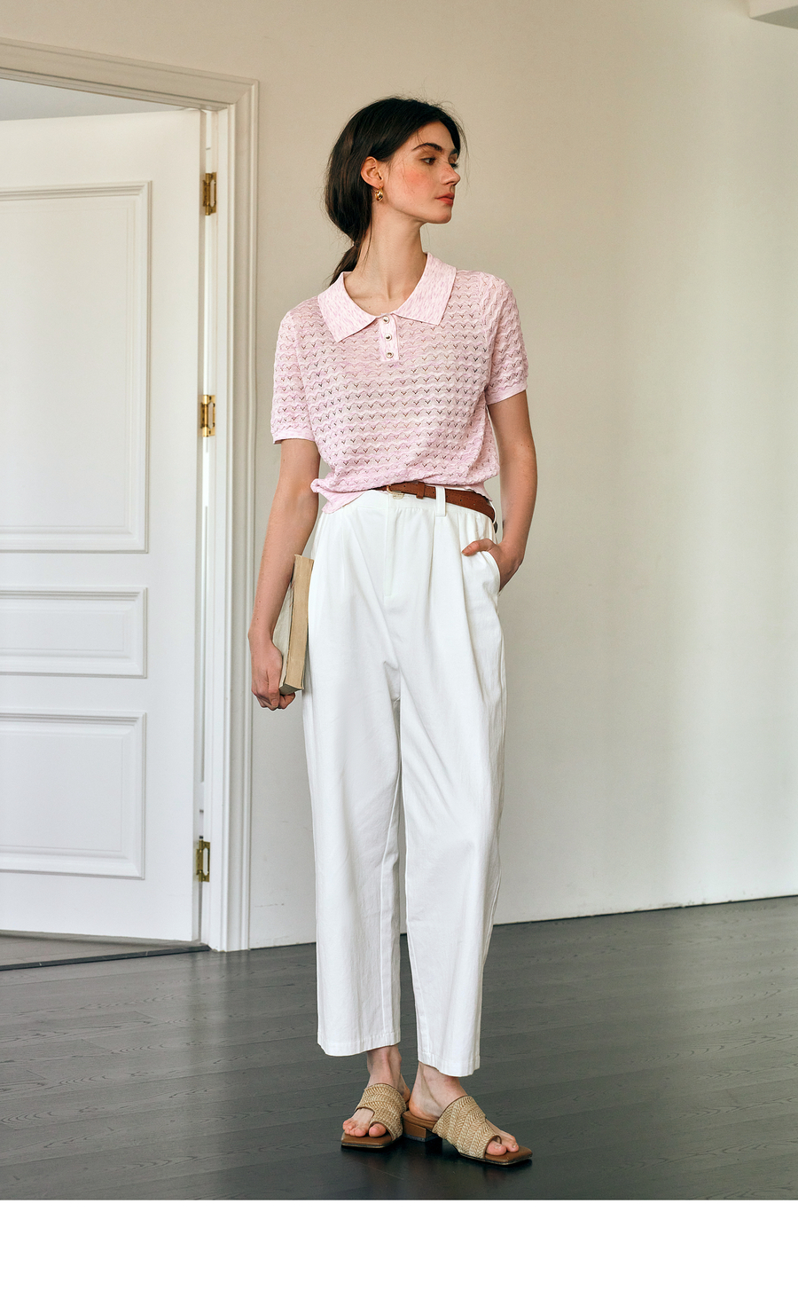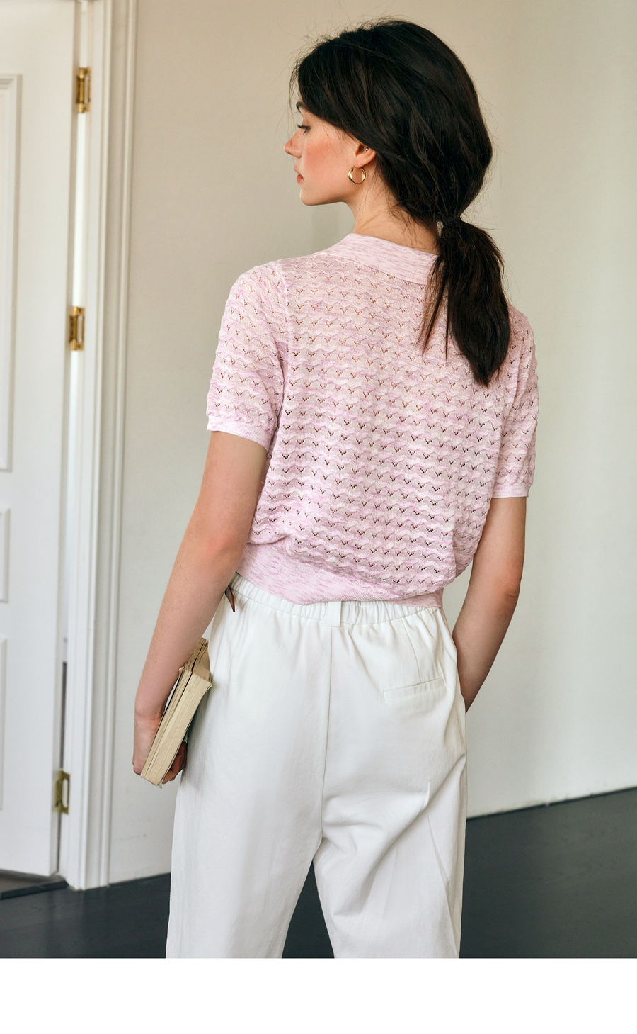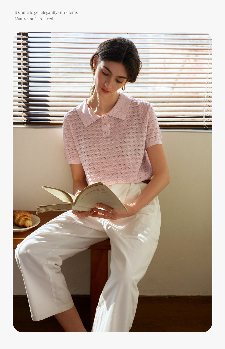 OLrain欧芮儿2025夏季新款POLO领粉色系通勤镂空短袖针织T恤衫女