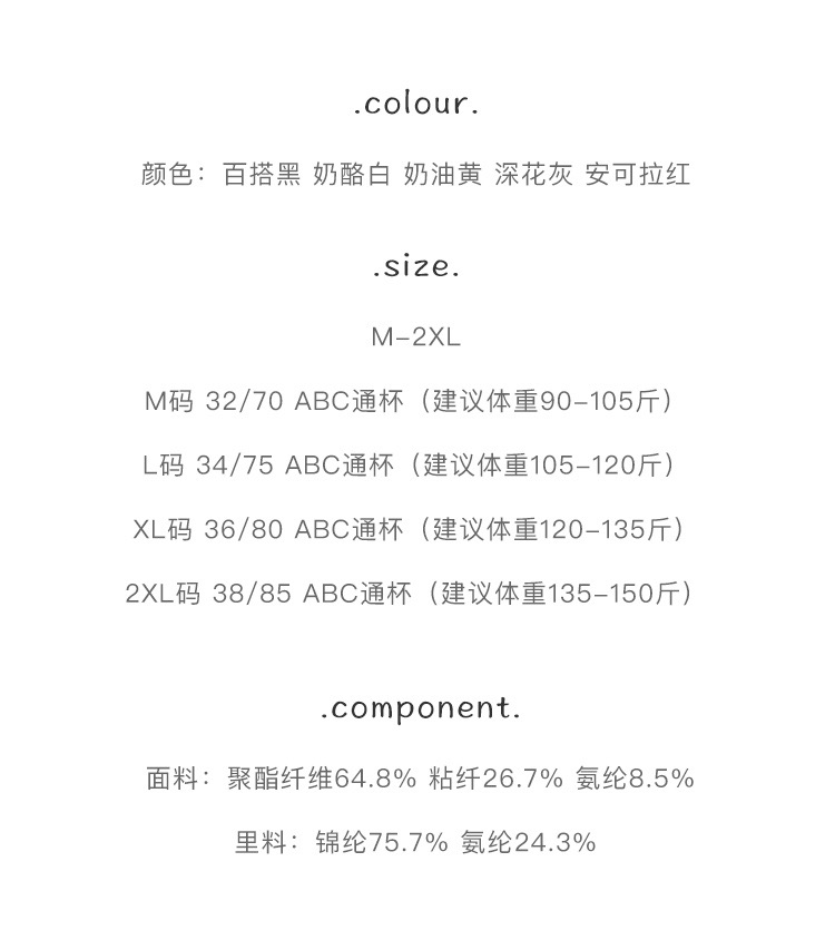 这个法式的版型设计, 太美了。。。无钢圈的舒适感是bi须哒,胸下围软支撑向上提拉 ,上身秒变元气嘟嘟胸,水滴立体罩杯温柔包裹,无束缚 不压胸,承托力,收副乳和聚拢效果也是chao出想象的好。 W型提拉设计不变形!隐藏赘肉, 塑造身体迷人曲线~