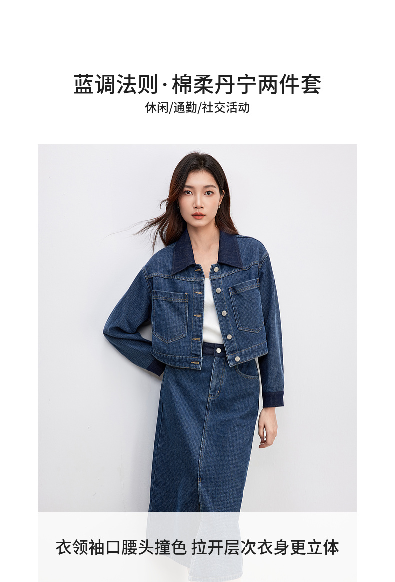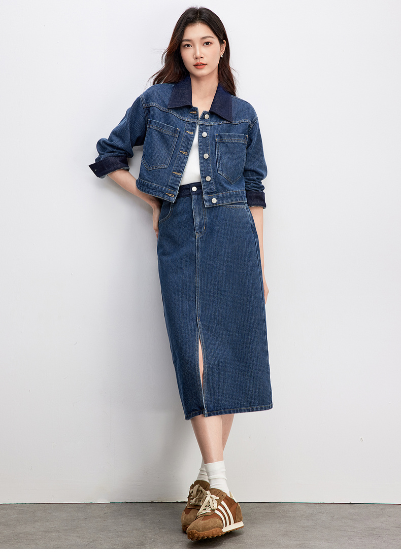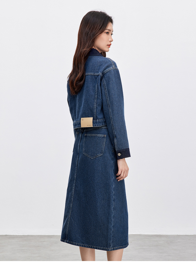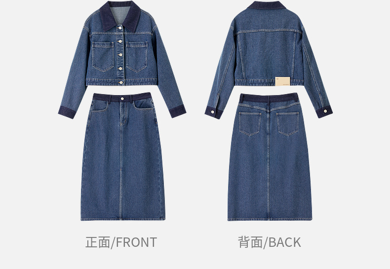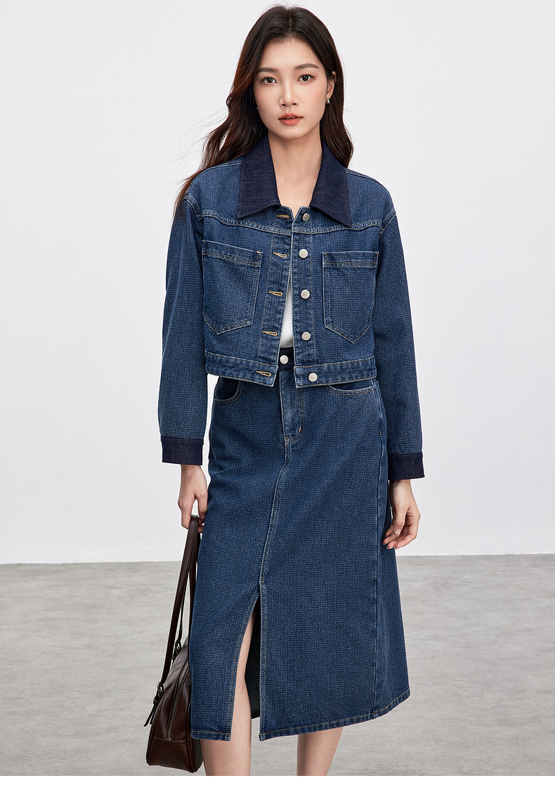 【内购】W51Z87901休闲通勤衬衫外套开叉半裙水洗棉牛仔套装-RJ054