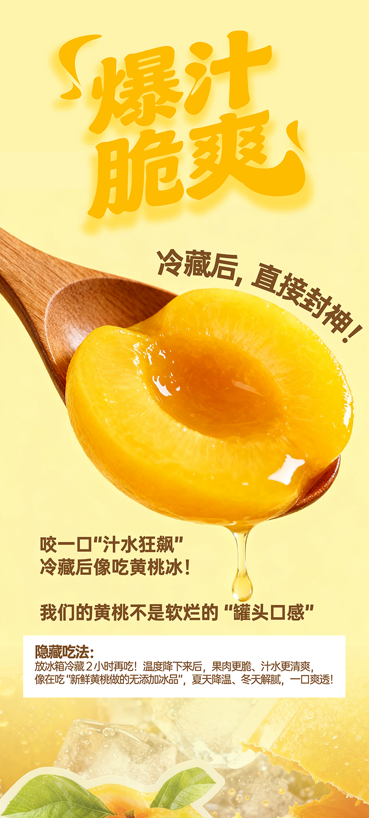 优选沂蒙山当季新现黄桃,对半切开后保留完整果肉,果肉饱满多汁;