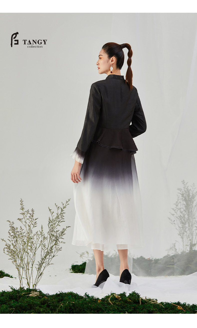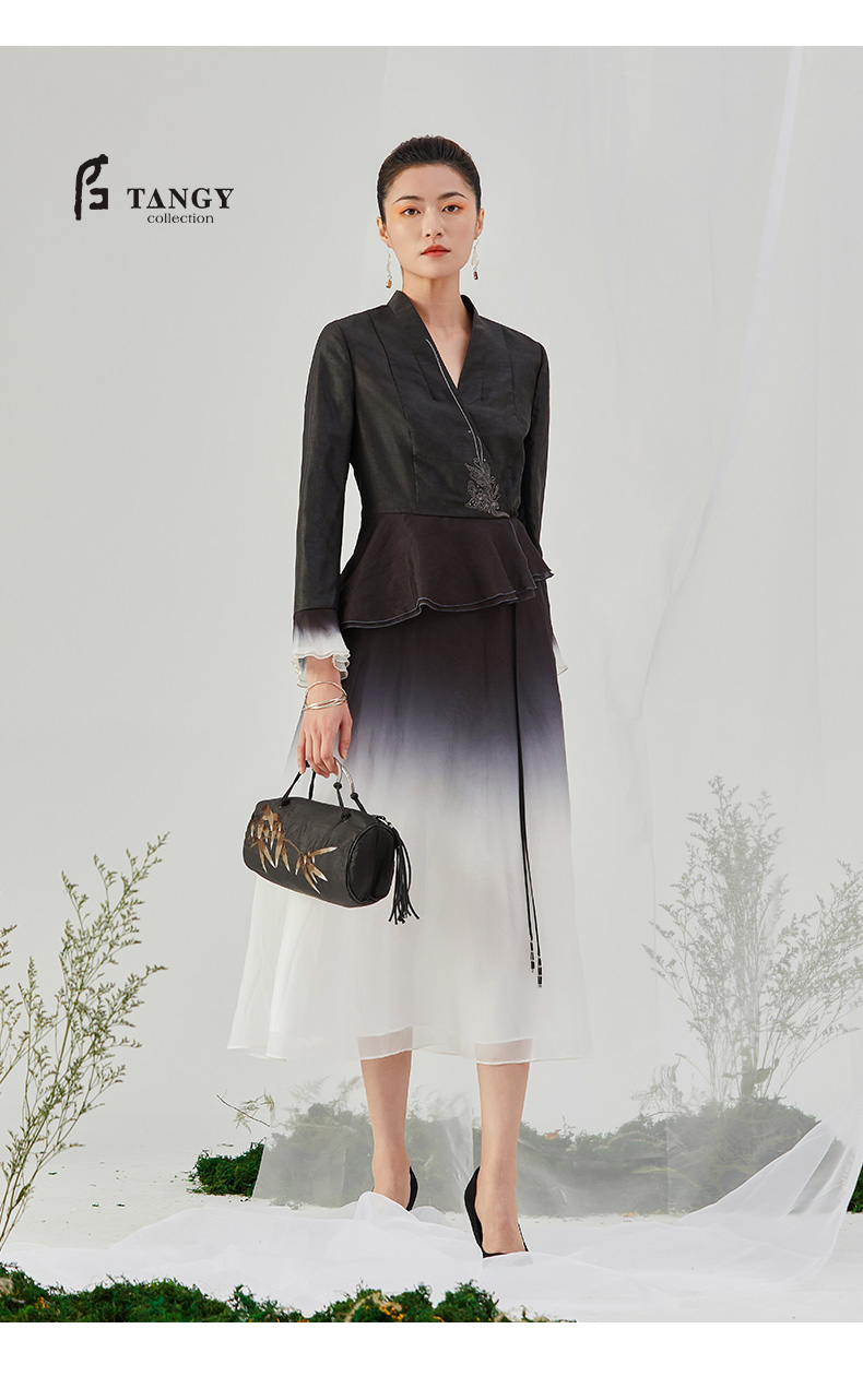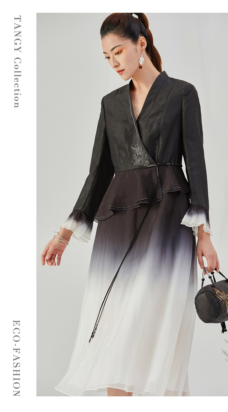 TANGY Collection/天意精品2021年秋季新品吊染拼撞刺绣莨绸连衣裙
