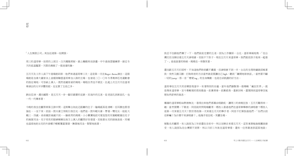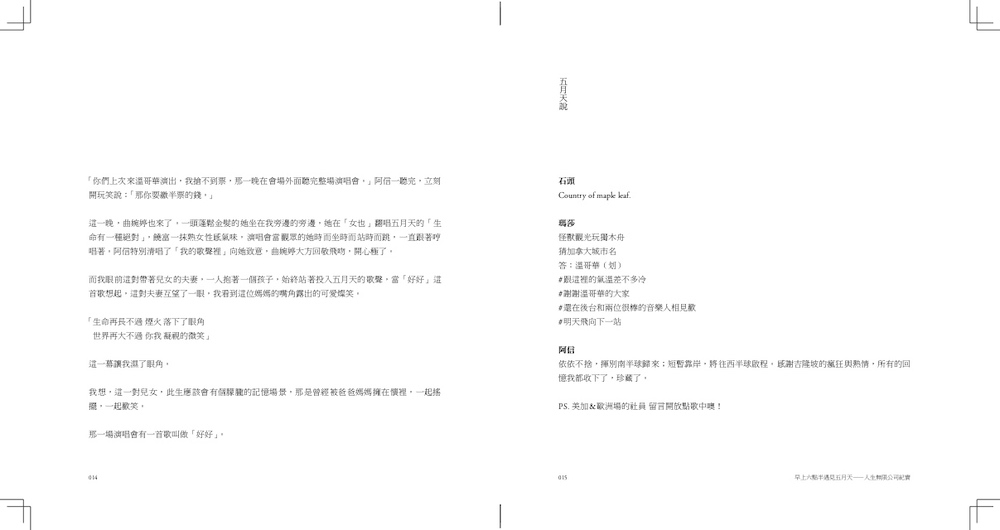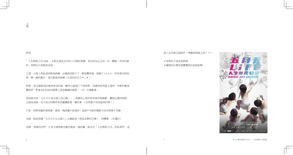 巡迴演唱會特地邀請娛樂記者趙雅芬隨團側寫,以真摯細膩的文筆,如數家珍地真實貼近描寫五月天巡演點滴,並在忙亂的巡演日常中,採訪五月天,紀錄五人的感受,以及唱片公司工作人員的感觸,甚至訪談興奮等候開演的聽眾,記下一篇篇動人的歌迷故事。