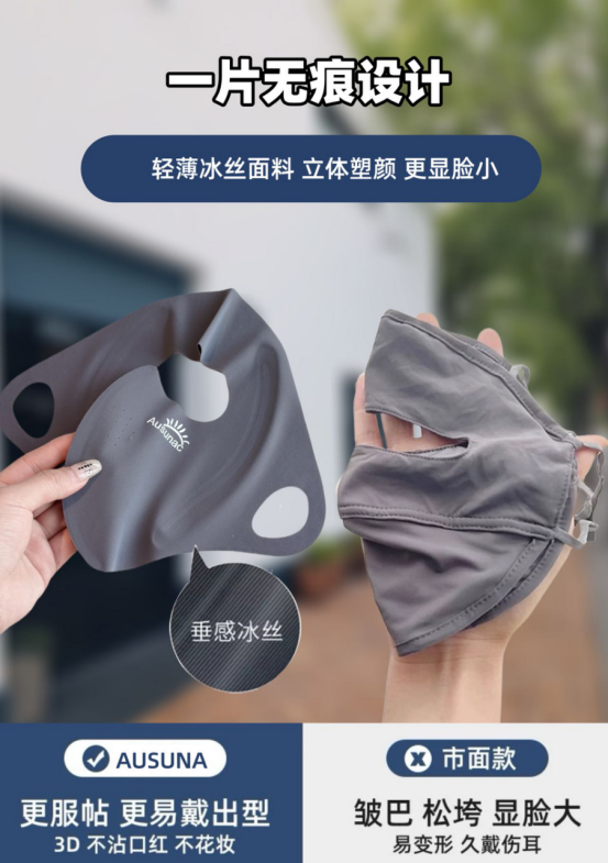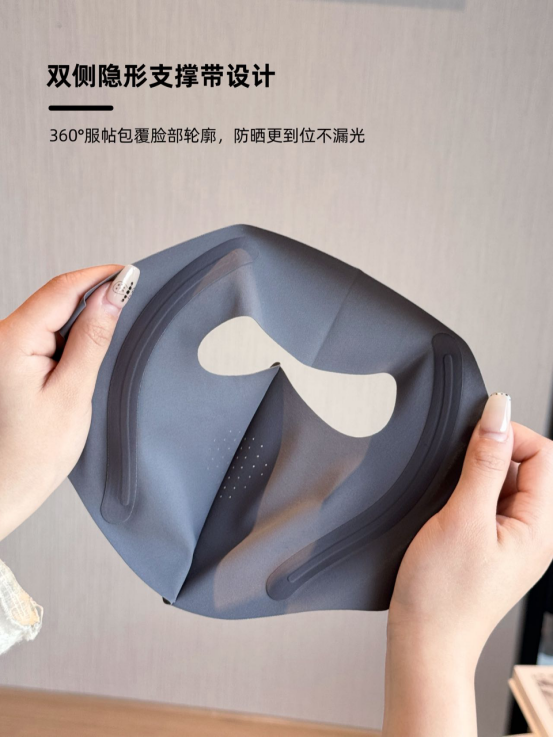3D立体裁剪+隐形软骨支撑结构 不仅防晒,还美观显脸小 无感耳挂结构+透气口鼻区域设计 解决“闷、勒、不透气”痛点 不是单纯的面罩 而是一款从穿戴逻辑到脸部舒适感受 都全面进阶的“防晒武器”