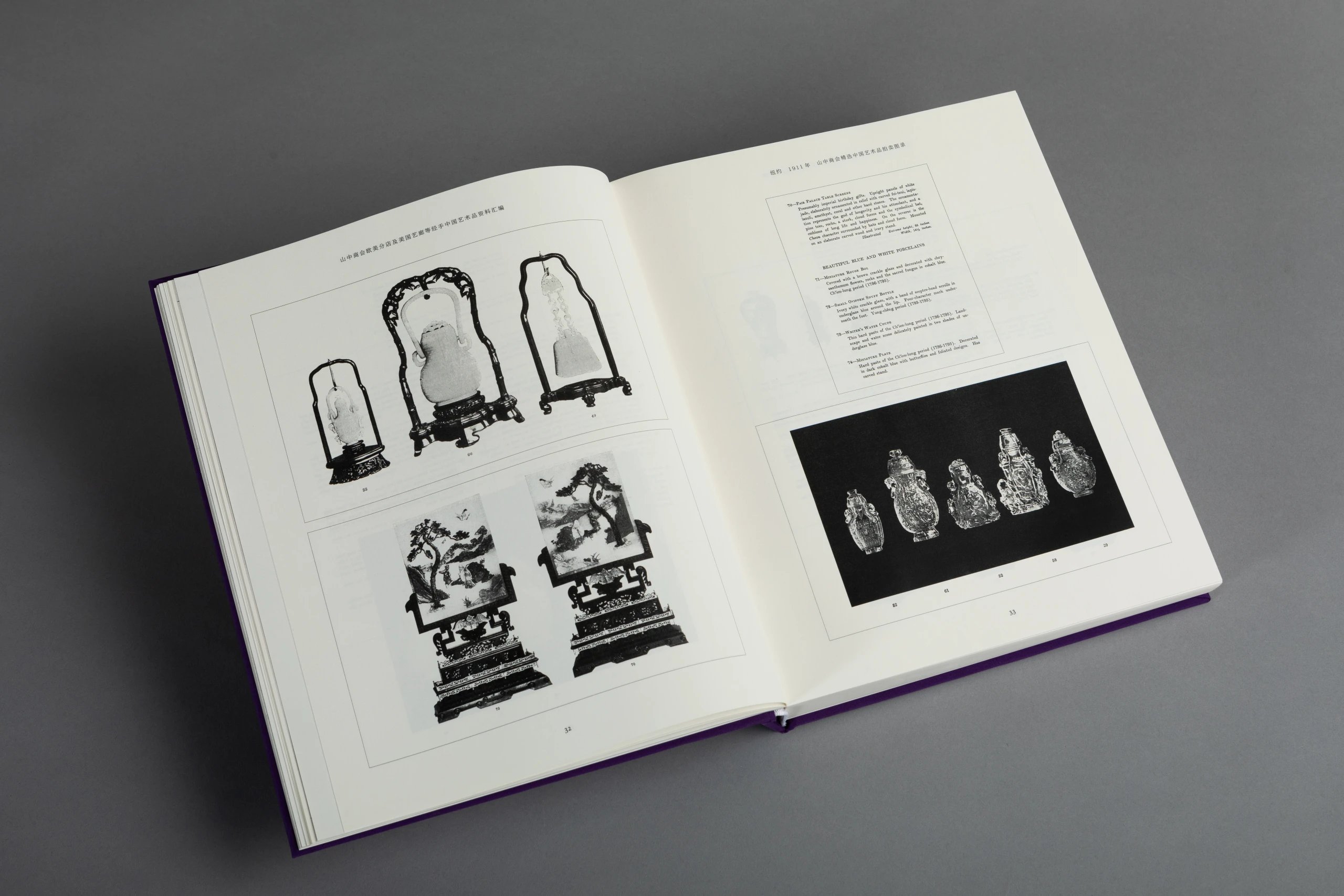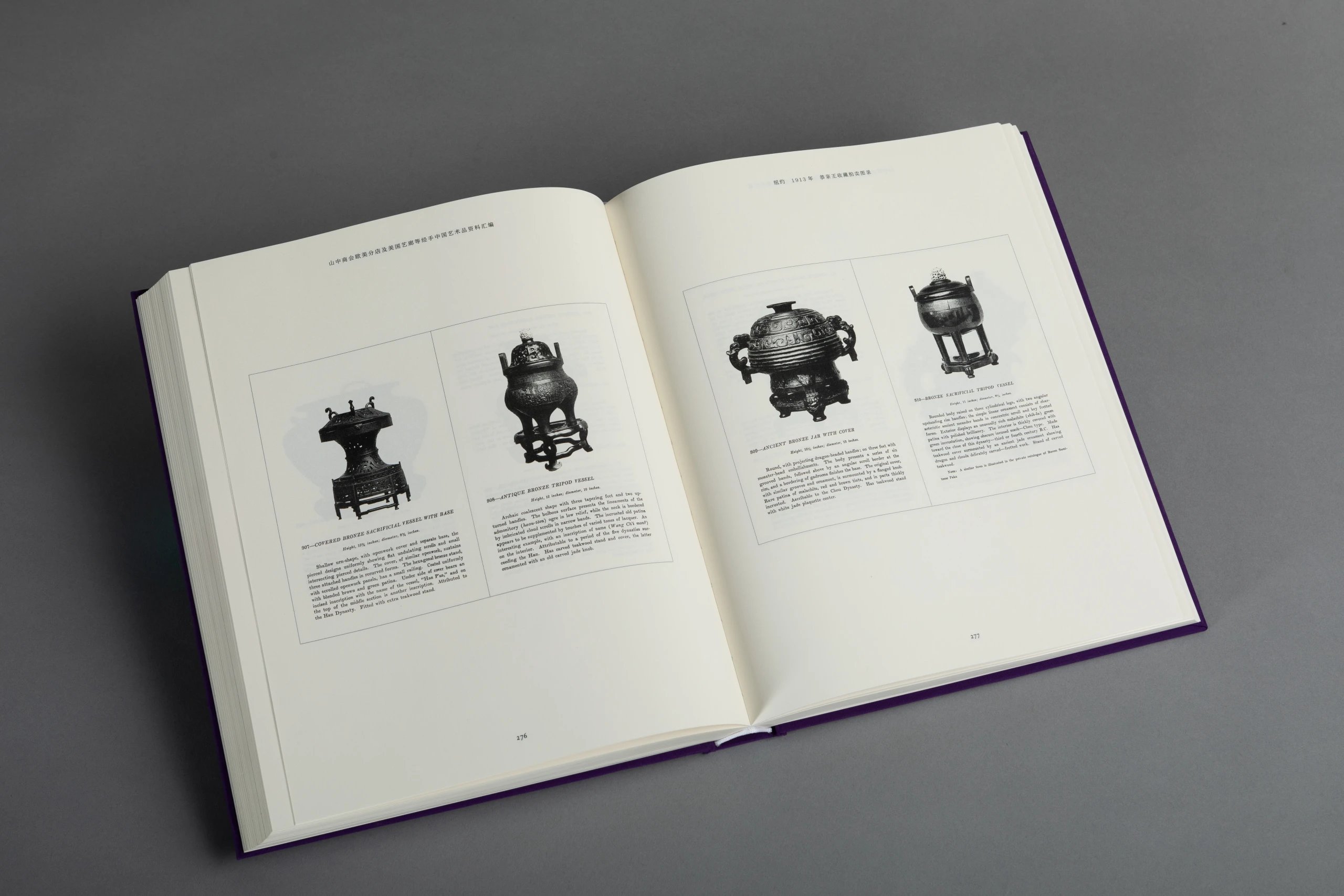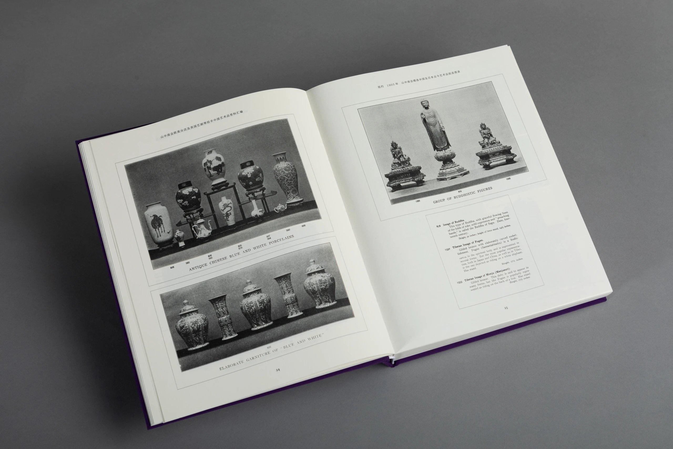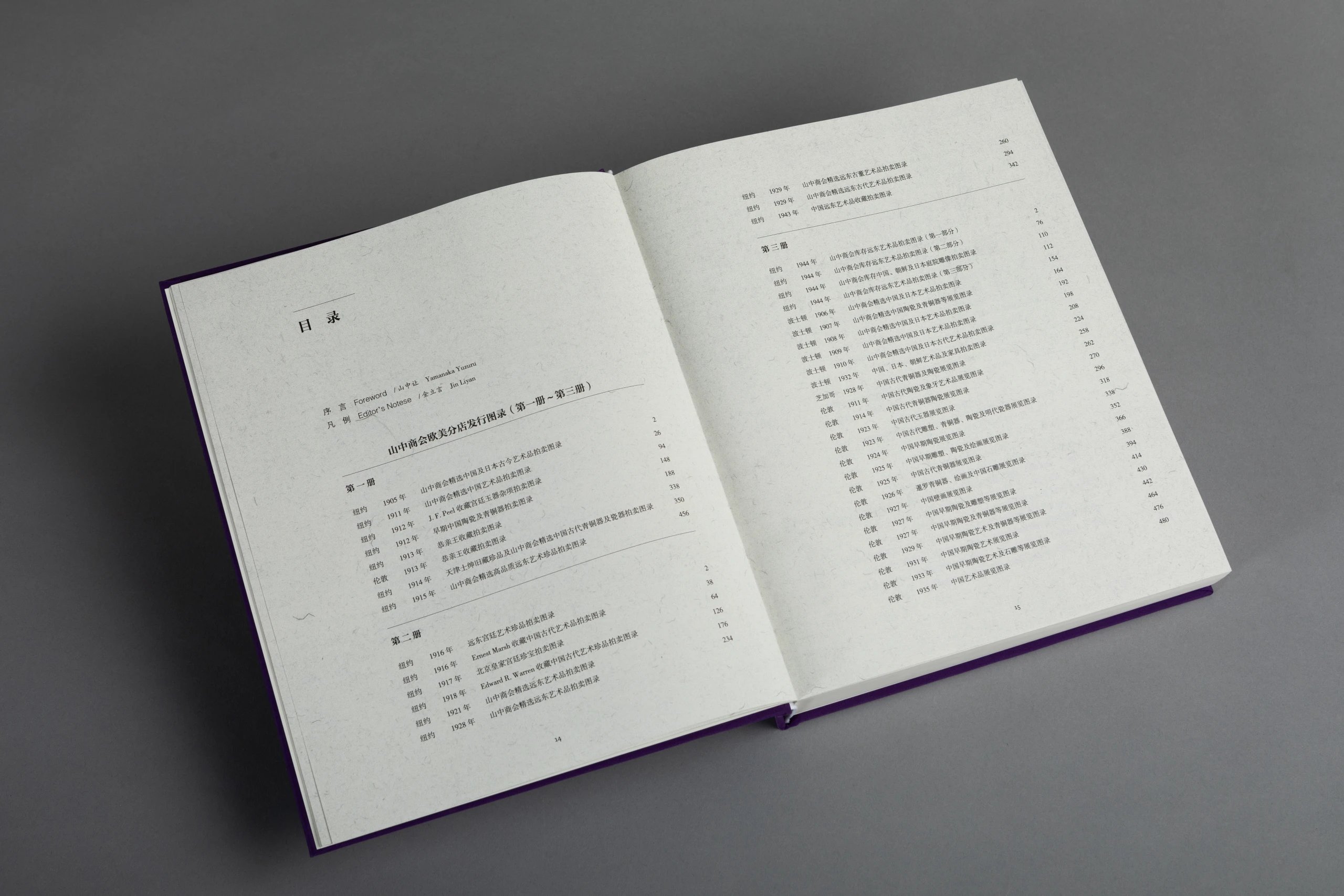 本书一套8册,由山中定次郎之嗣裔、现任山中商会社长山中让先生亲自监制,并委托中国陶瓷研究领域的杰出学者金立言博士精心编译。此书将19世纪末至20世纪上半叶山中商会欧美分店所发行的展览及拍卖图录,以及美国艺廊(American Art Association, AAA,1964 年被苏富比收购)拍卖图录中的中国艺术品进行编辑汇总,按拍卖与展览的地点及时间先后将126册图录按顺序排列,共收录青铜器、佛教造像、陶瓷、玉器、鼻烟壶、地毯、家具及多种珍稀杂项的艺术品图片约4420幅,几无遗珠之憾,且所有原图录的序言及介绍均做翻译,便于读者深入理解。