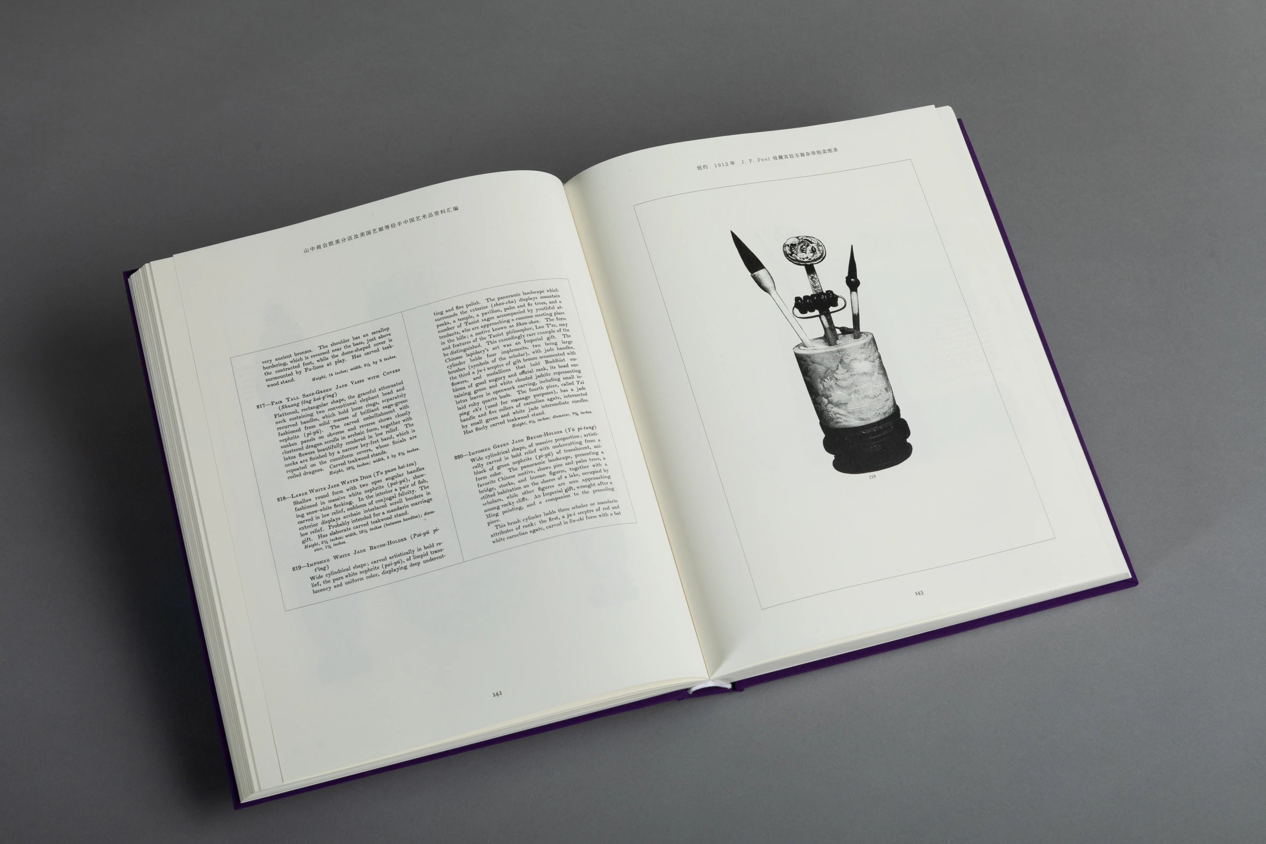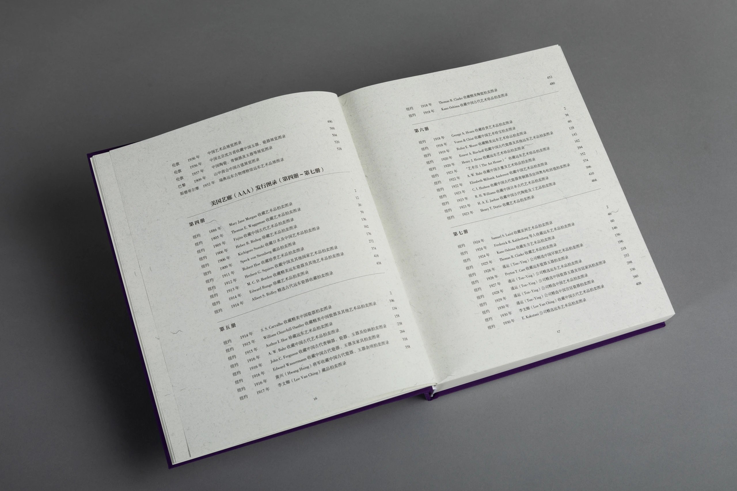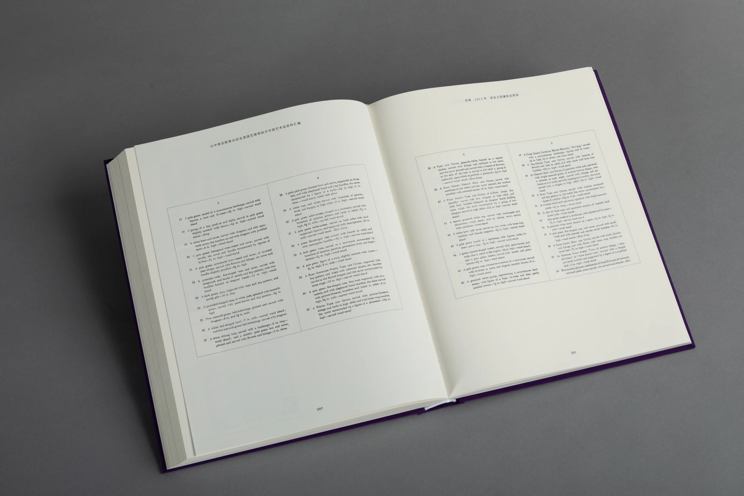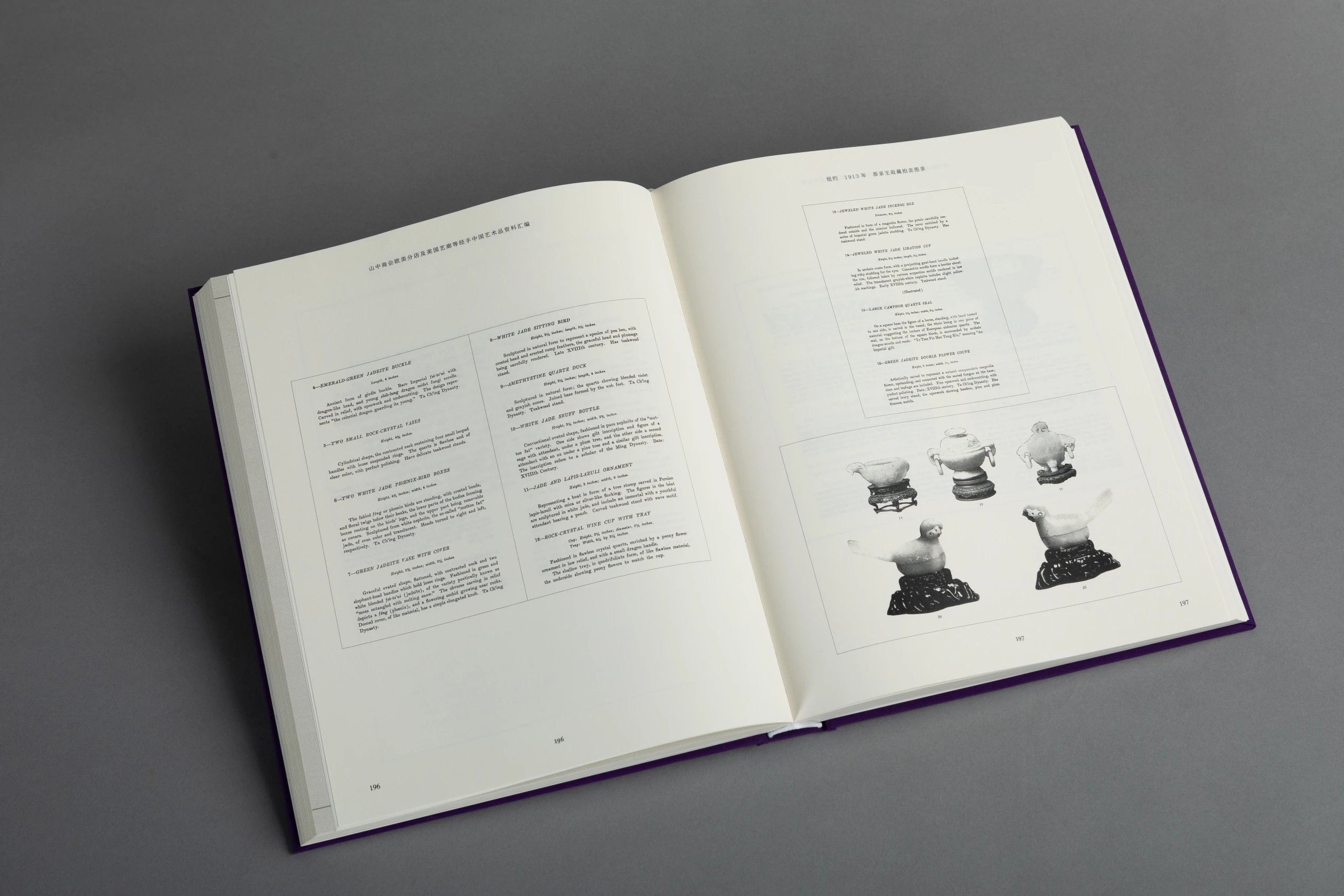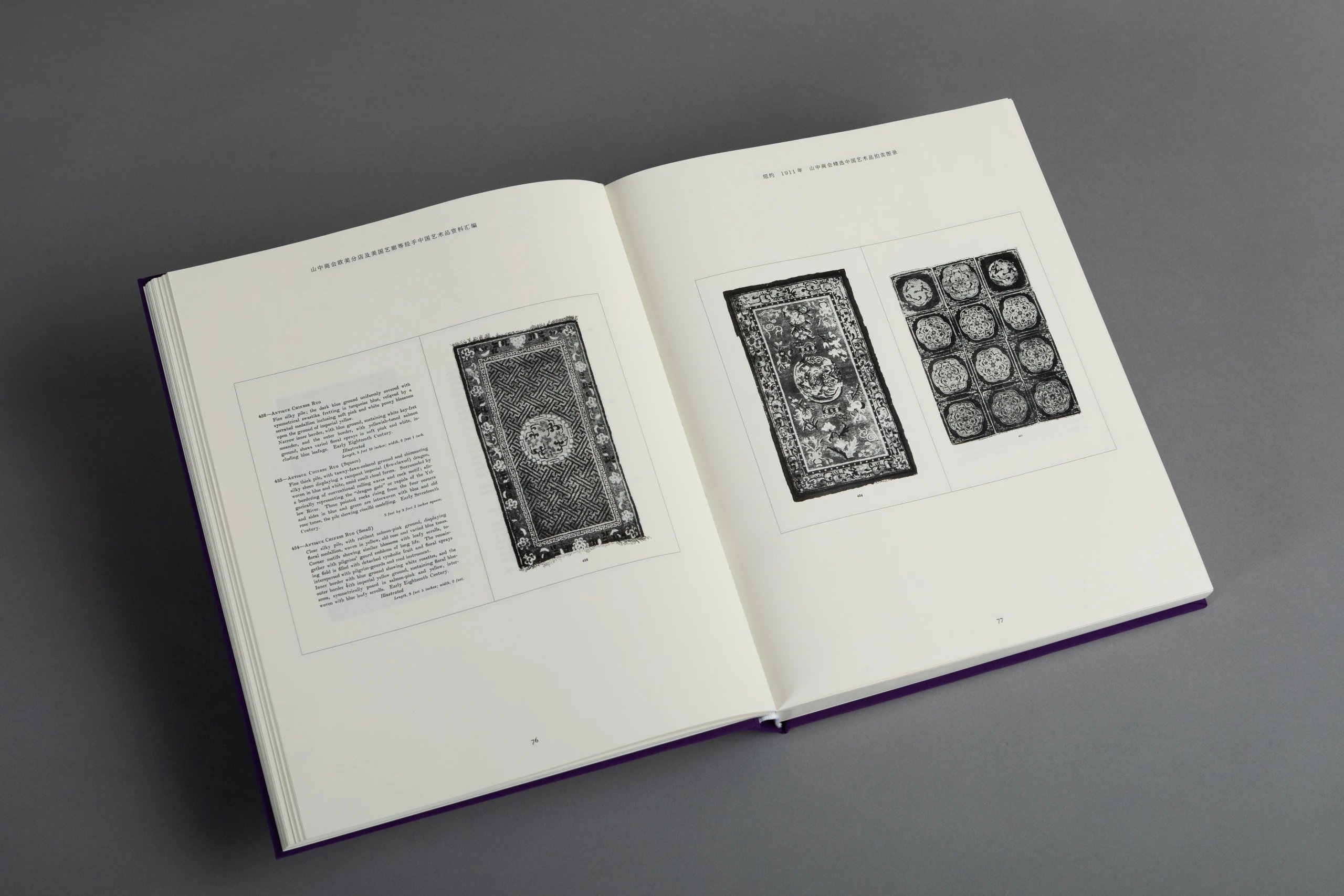 本书一套8册,由山中定次郎之嗣裔、现任山中商会社长山中让先生亲自监制,并委托中国陶瓷研究领域的杰出学者金立言博士精心编译。此书将19世纪末至20世纪上半叶山中商会欧美分店所发行的展览及拍卖图录,以及美国艺廊(American Art Association, AAA,1964 年被苏富比收购)拍卖图录中的中国艺术品进行编辑汇总,按拍卖与展览的地点及时间先后将126册图录按顺序排列,共收录青铜器、佛教造像、陶瓷、玉器、鼻烟壶、地毯、家具及多种珍稀杂项的艺术品图片约4420幅,几无遗珠之憾,且所有原图录的序言及介绍均做翻译,便于读者深入理解。