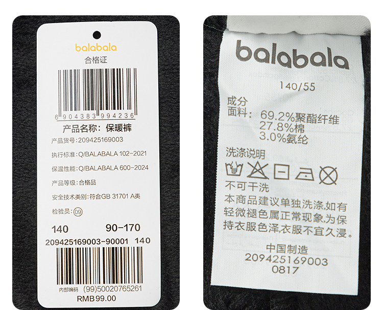巴拉巴拉balaOne男童保暖裤儿童睡裤打底裤新款童装2025秋冬加绒