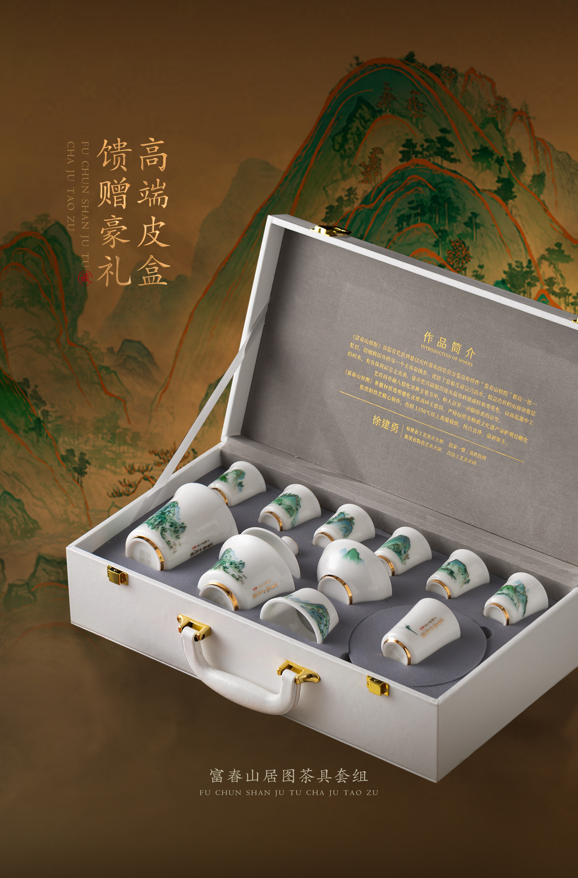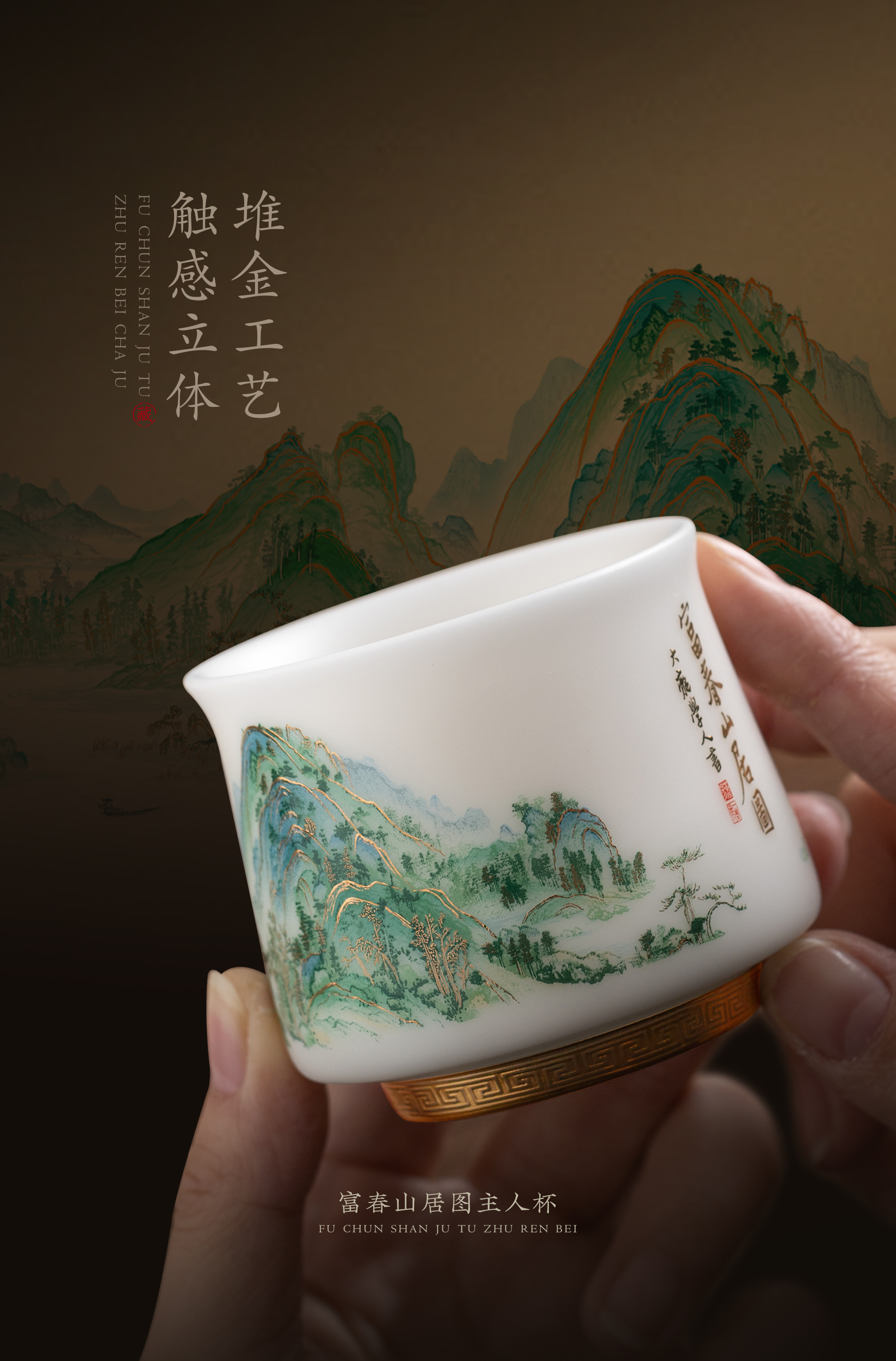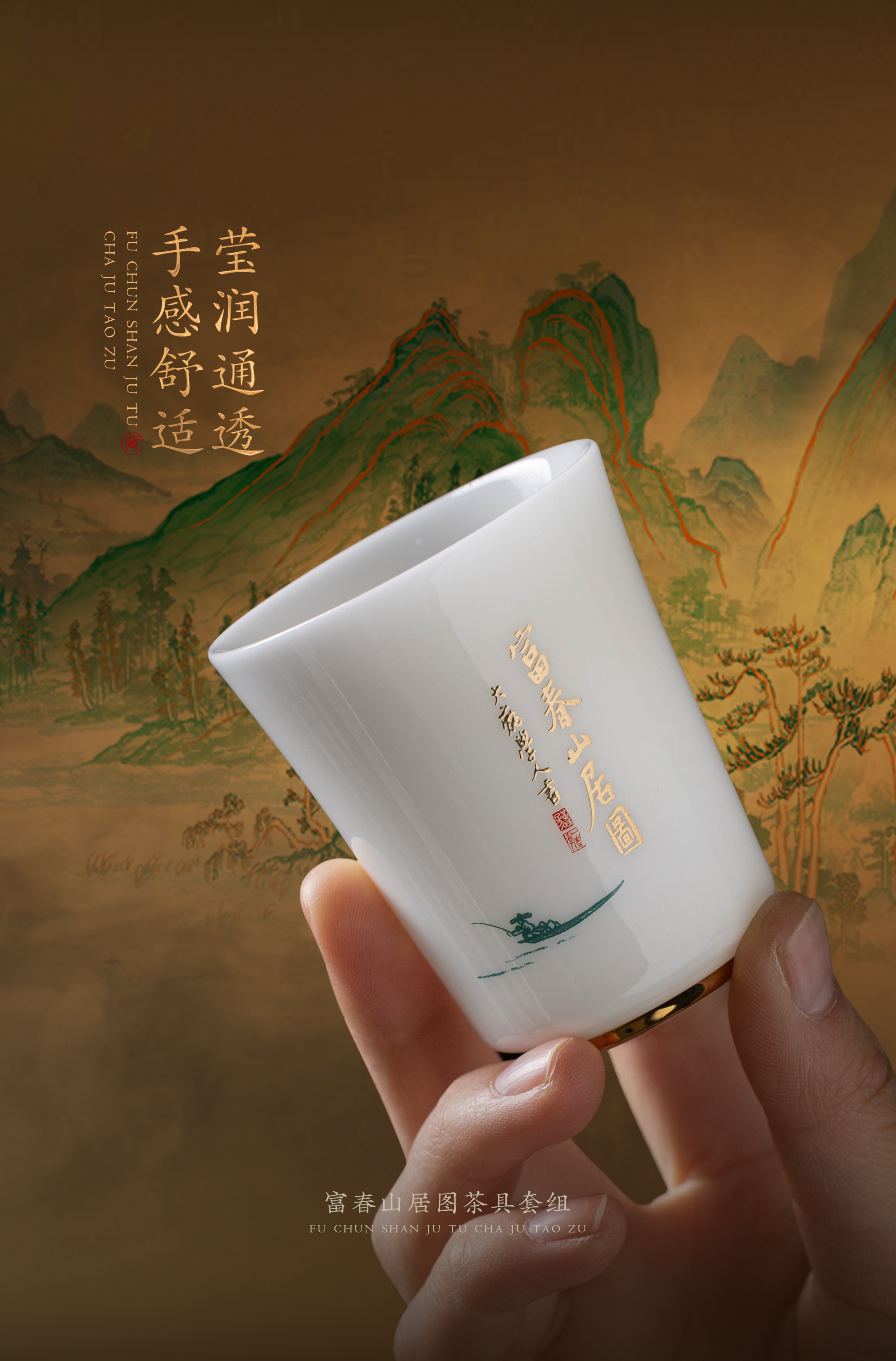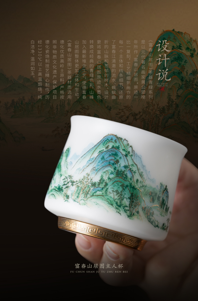 【富春山居图】冰种玉瓷/羊脂玉瓷 茶具套组、主人杯,堆金工艺 触感立体,温润通透 精工复刻,作者签章 品质保证,包装精致 高端好礼