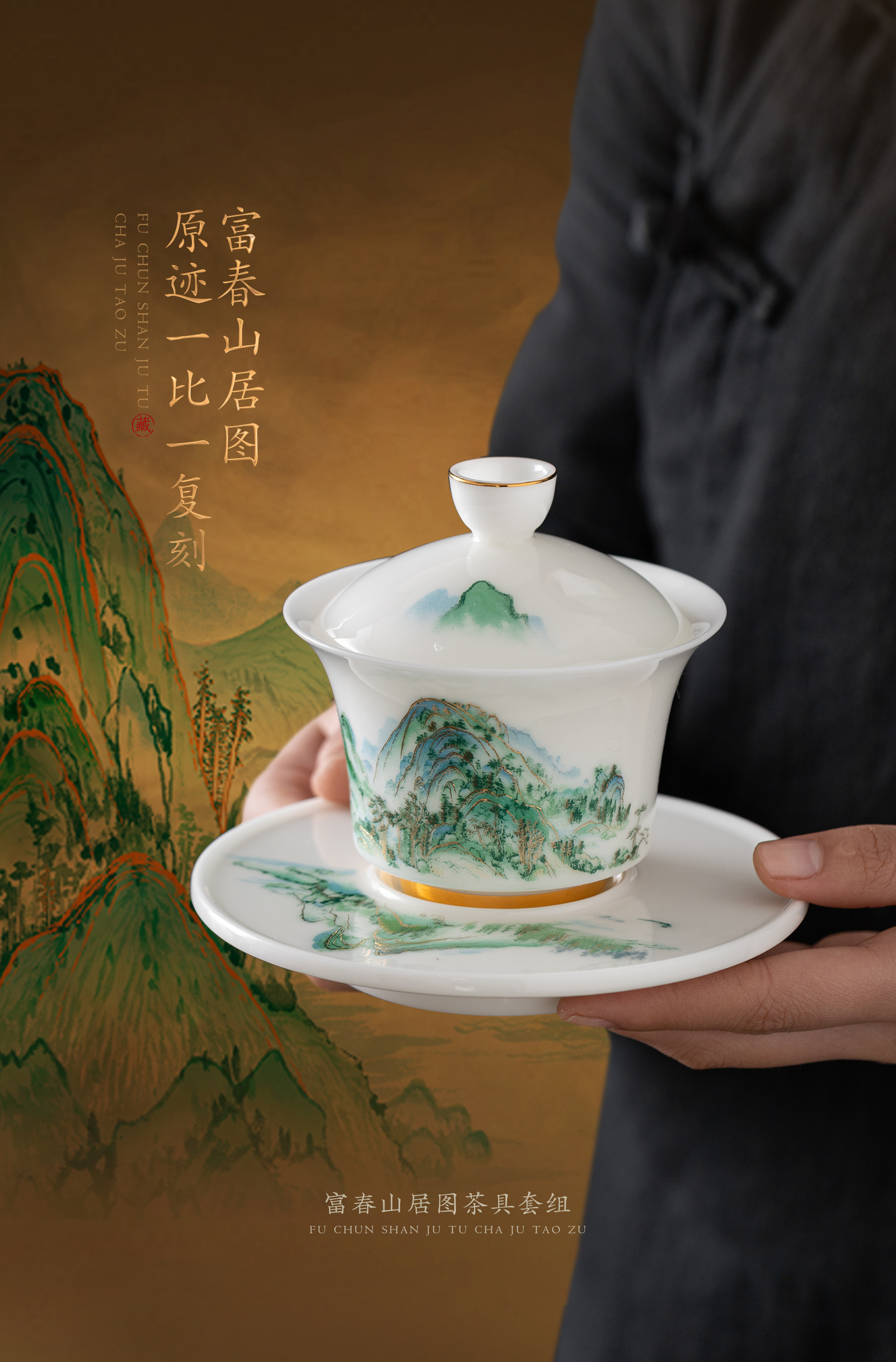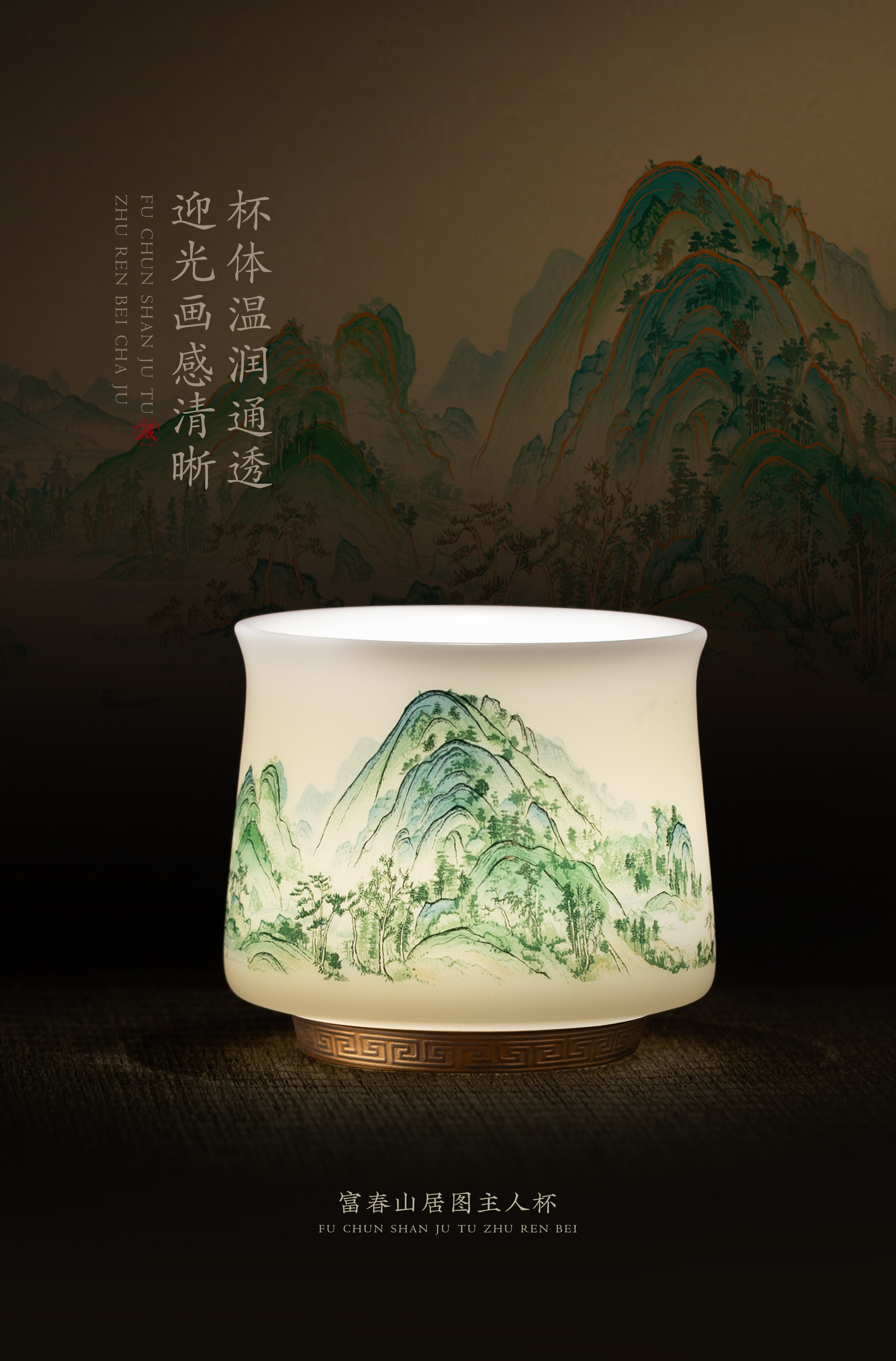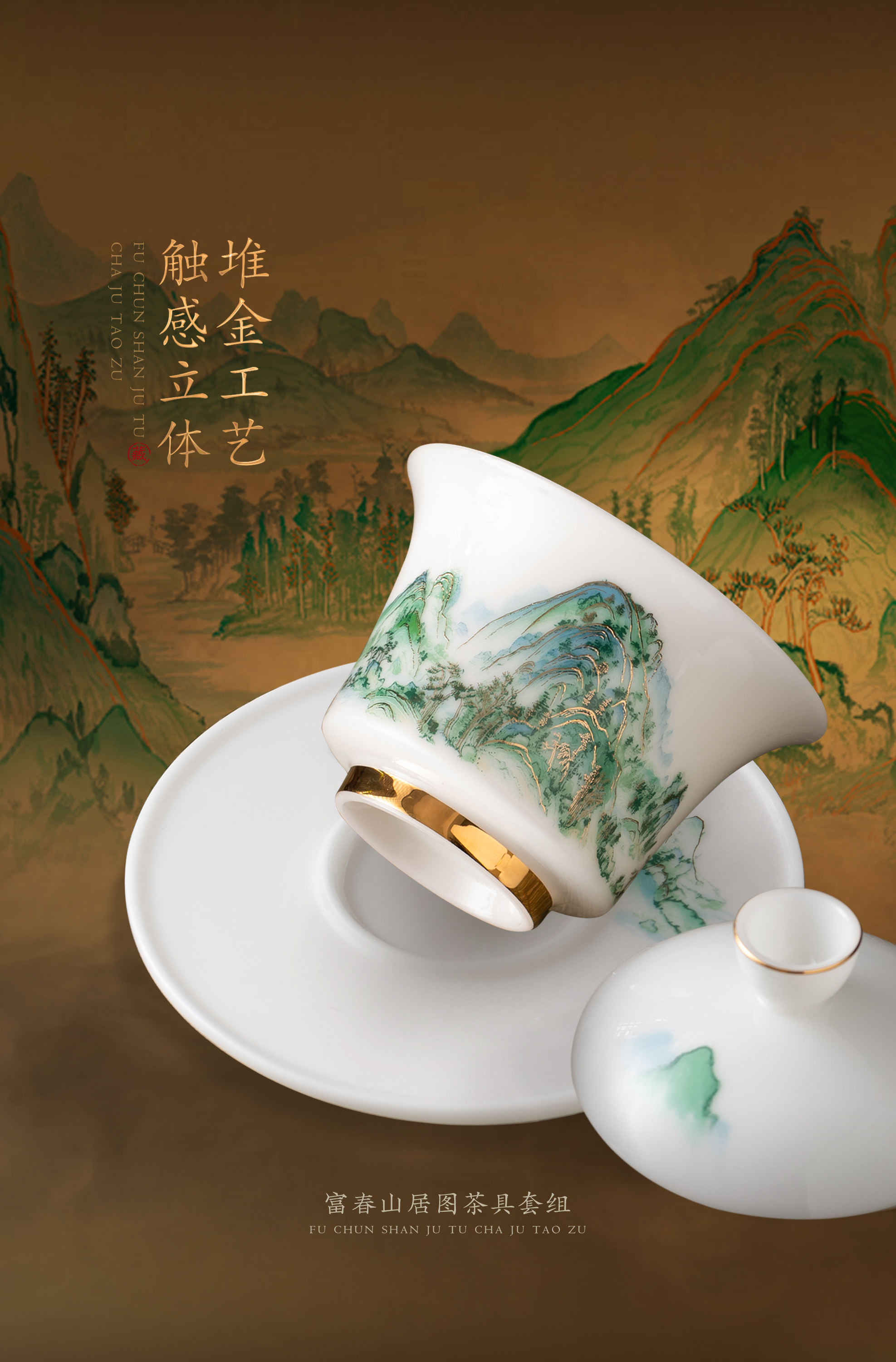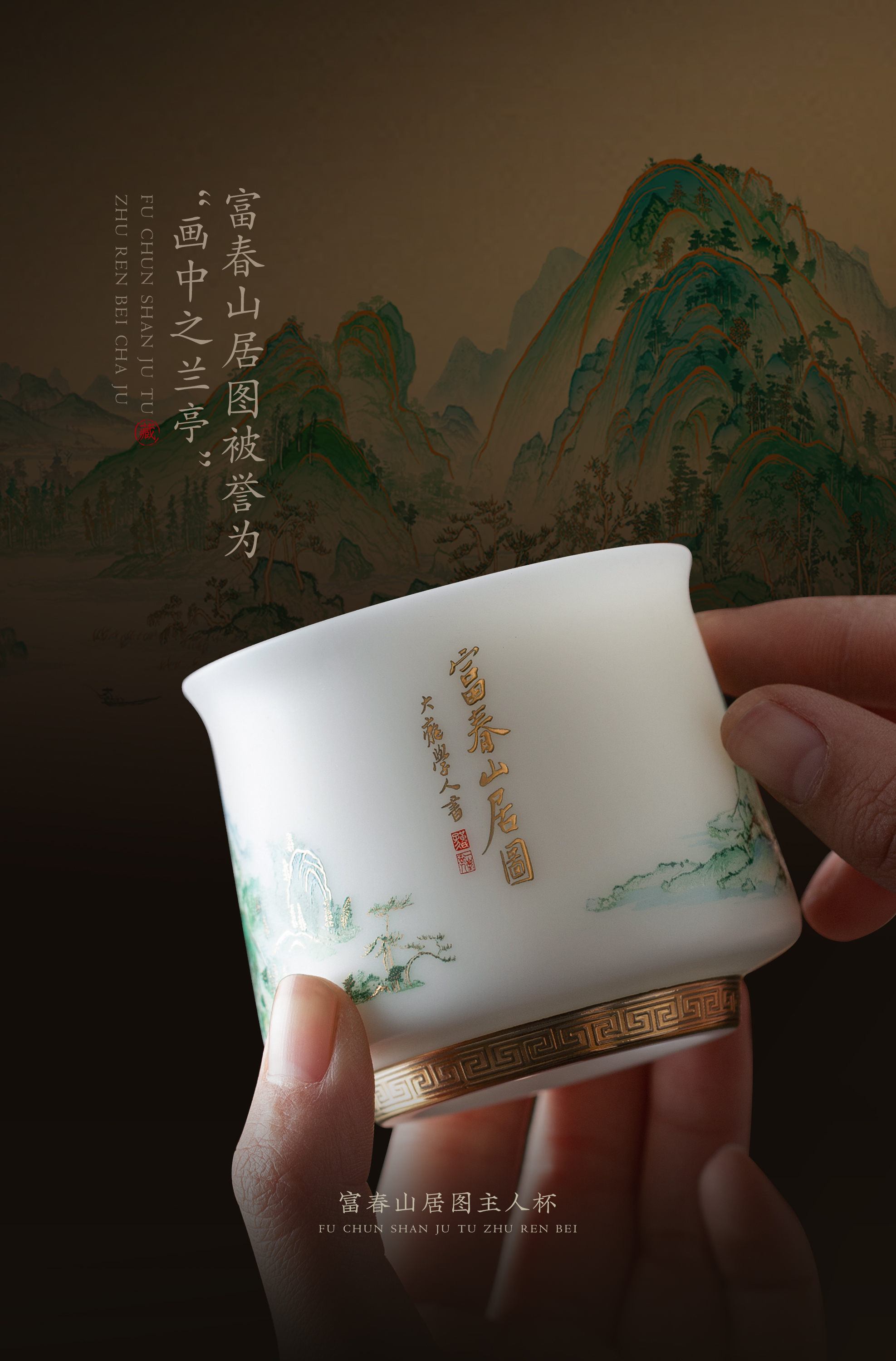 【富春山居图】冰种玉瓷/羊脂玉瓷 茶具套组、主人杯,堆金工艺 触感立体,温润通透 精工复刻,作者签章 品质保证,包装精致 高端好礼