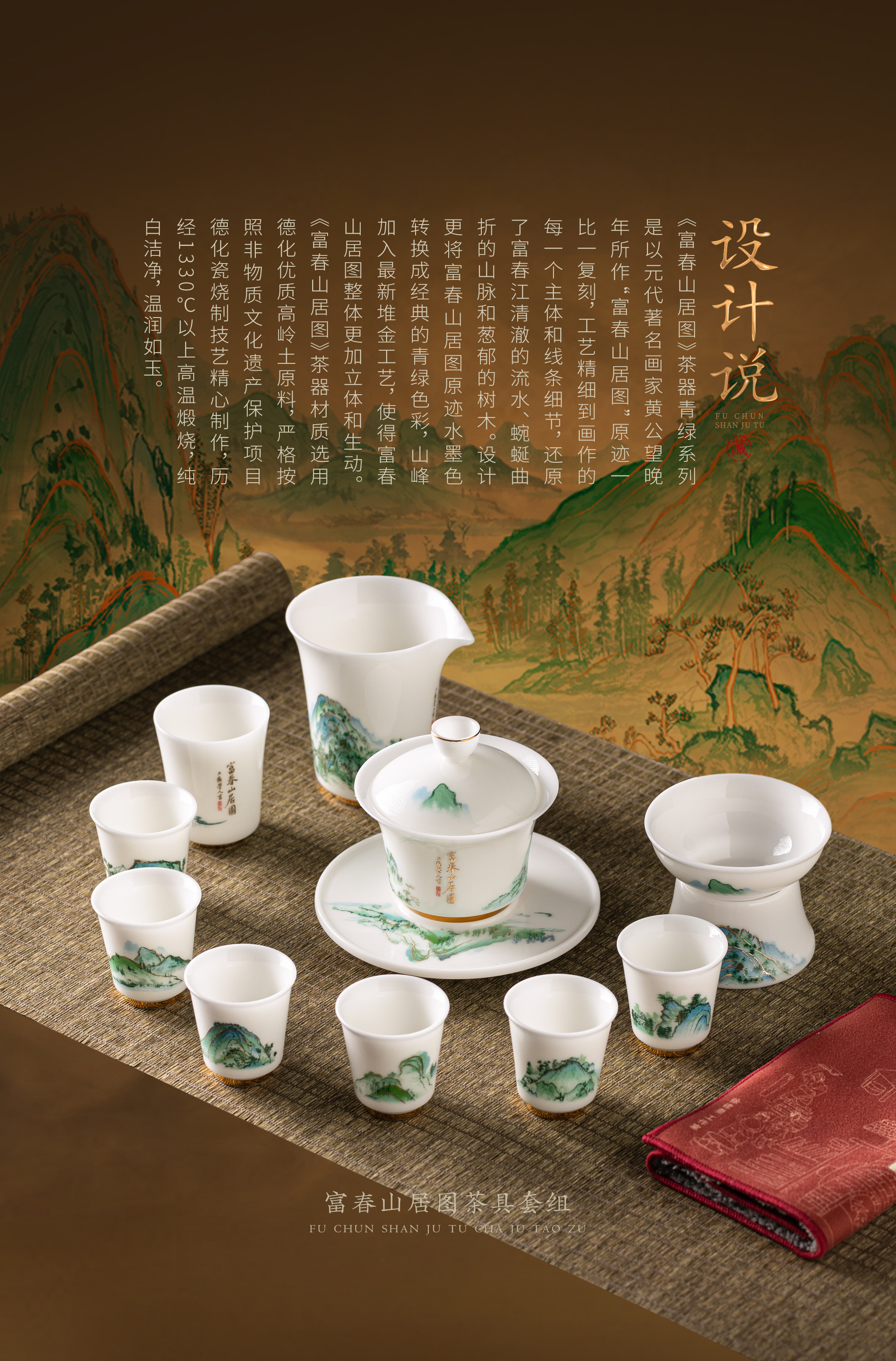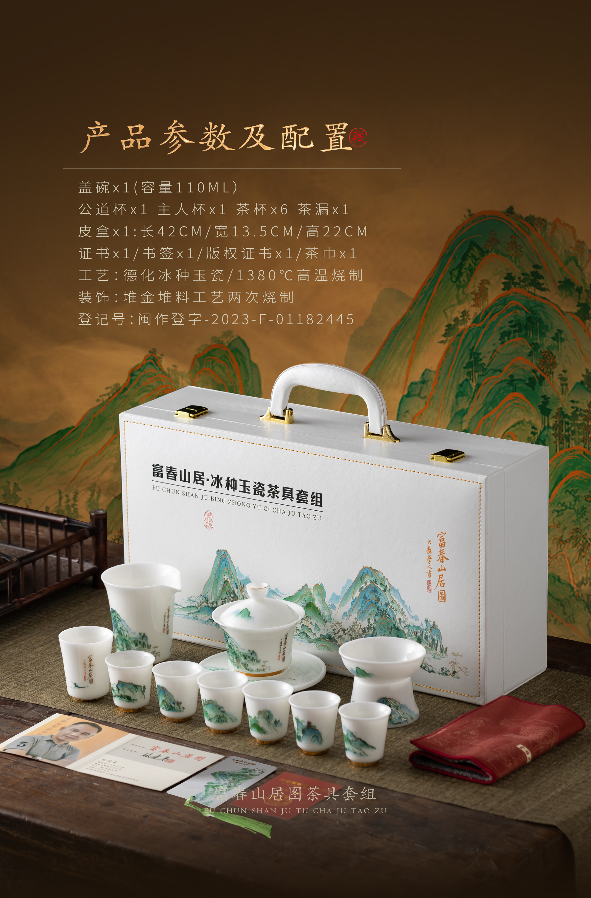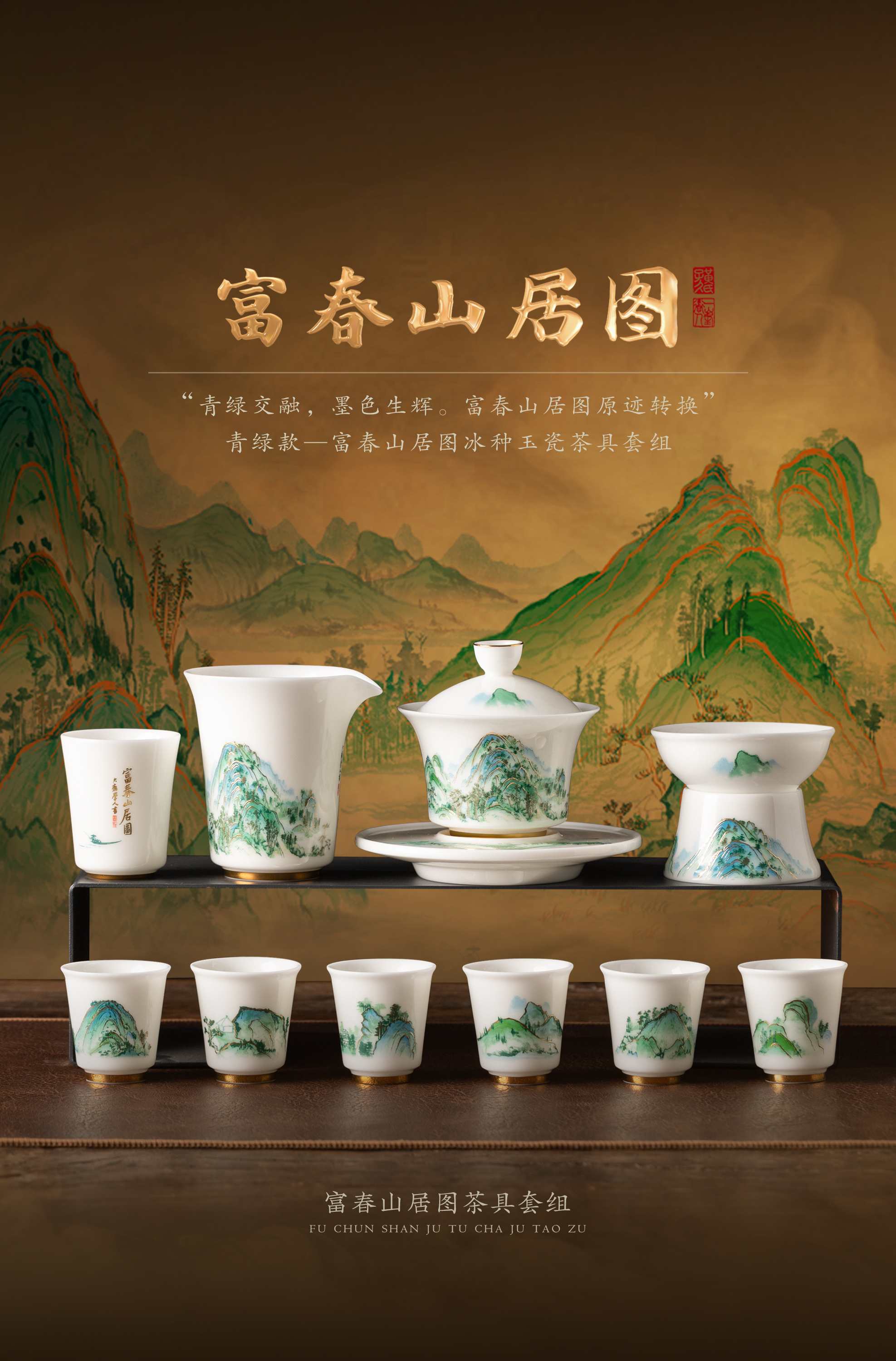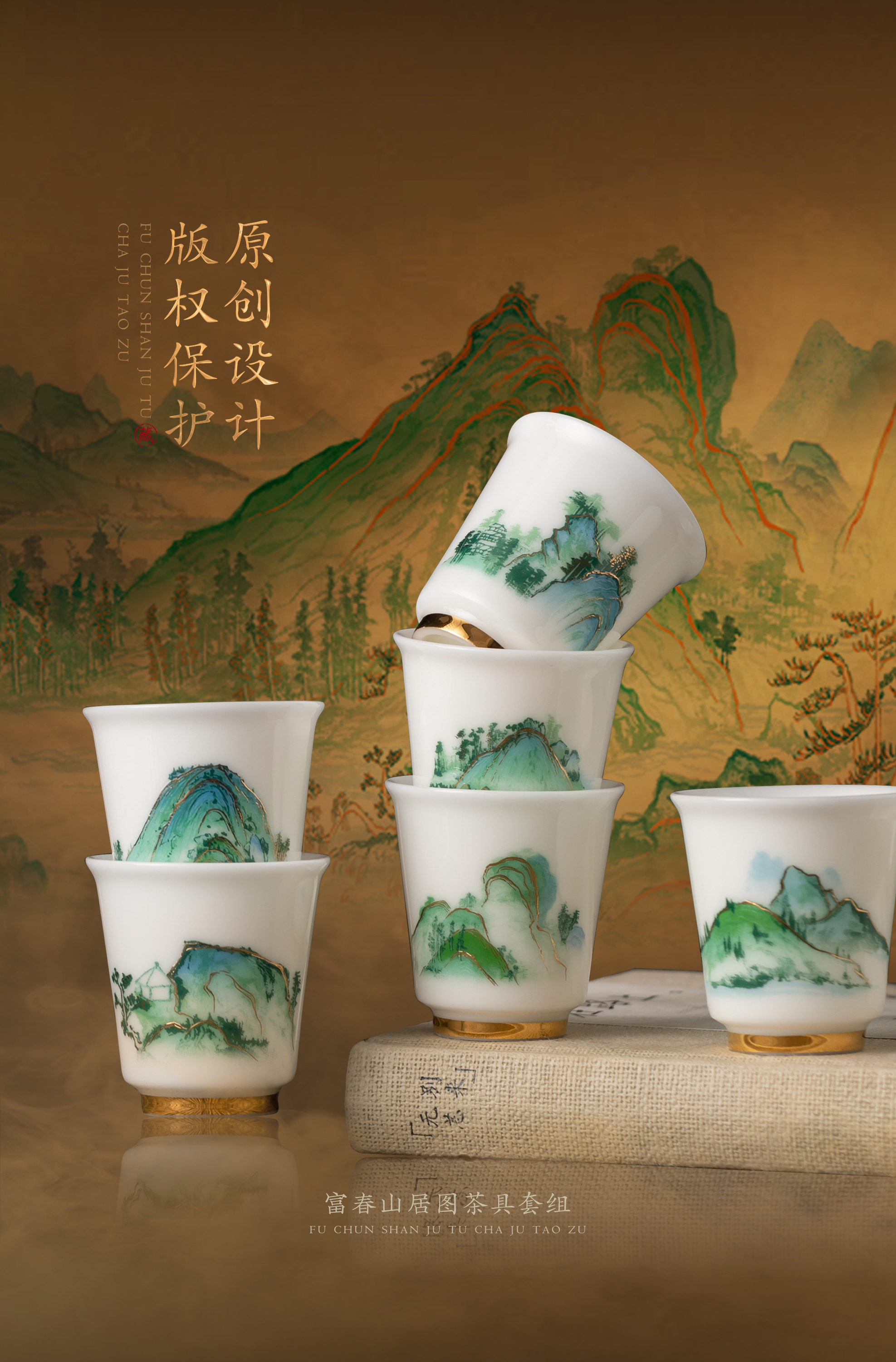 【富春山居图】冰种玉瓷/羊脂玉瓷 茶具套组、主人杯,堆金工艺 触感立体,温润通透 精工复刻,作者签章 品质保证,包装精致 高端好礼