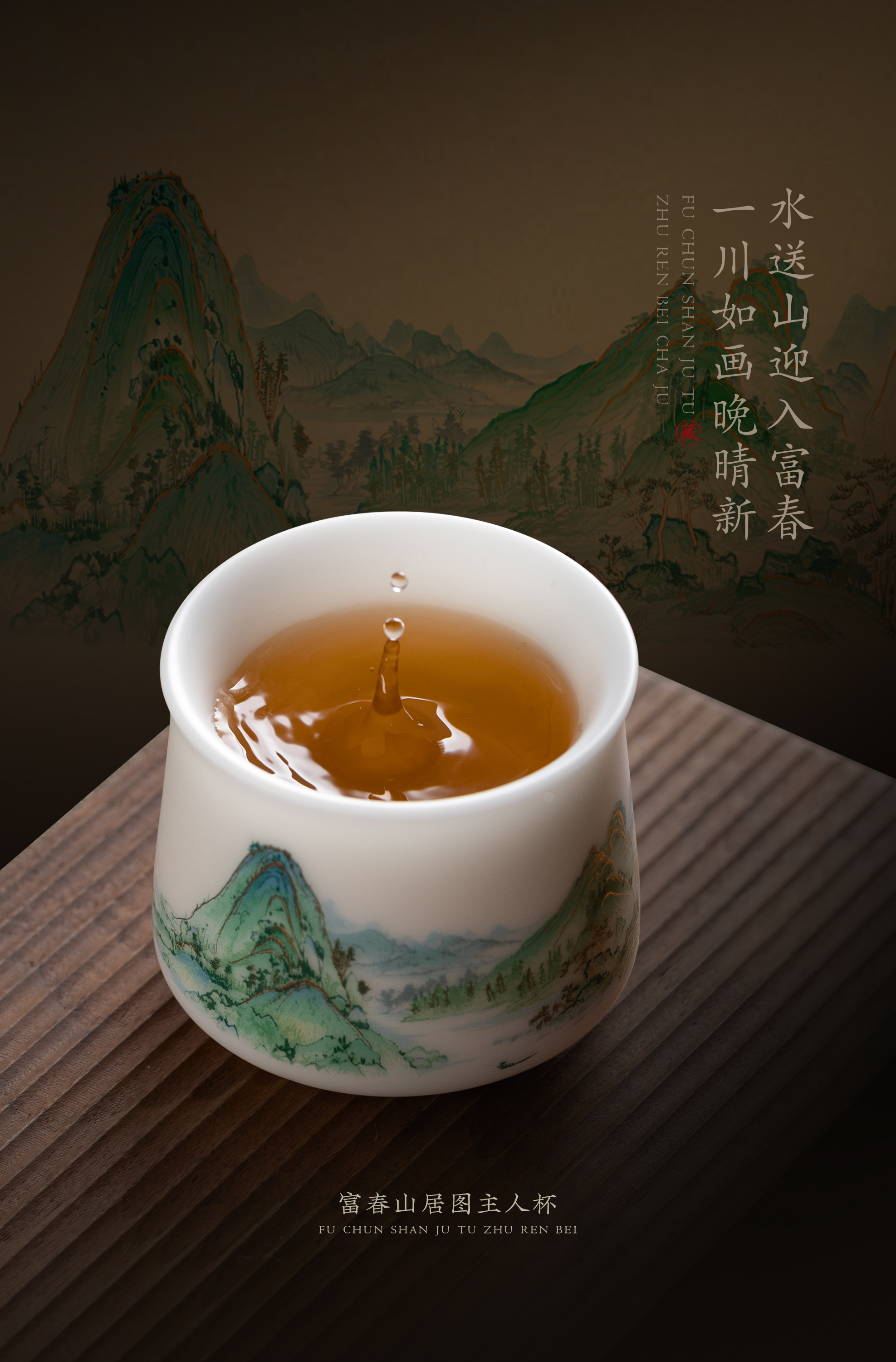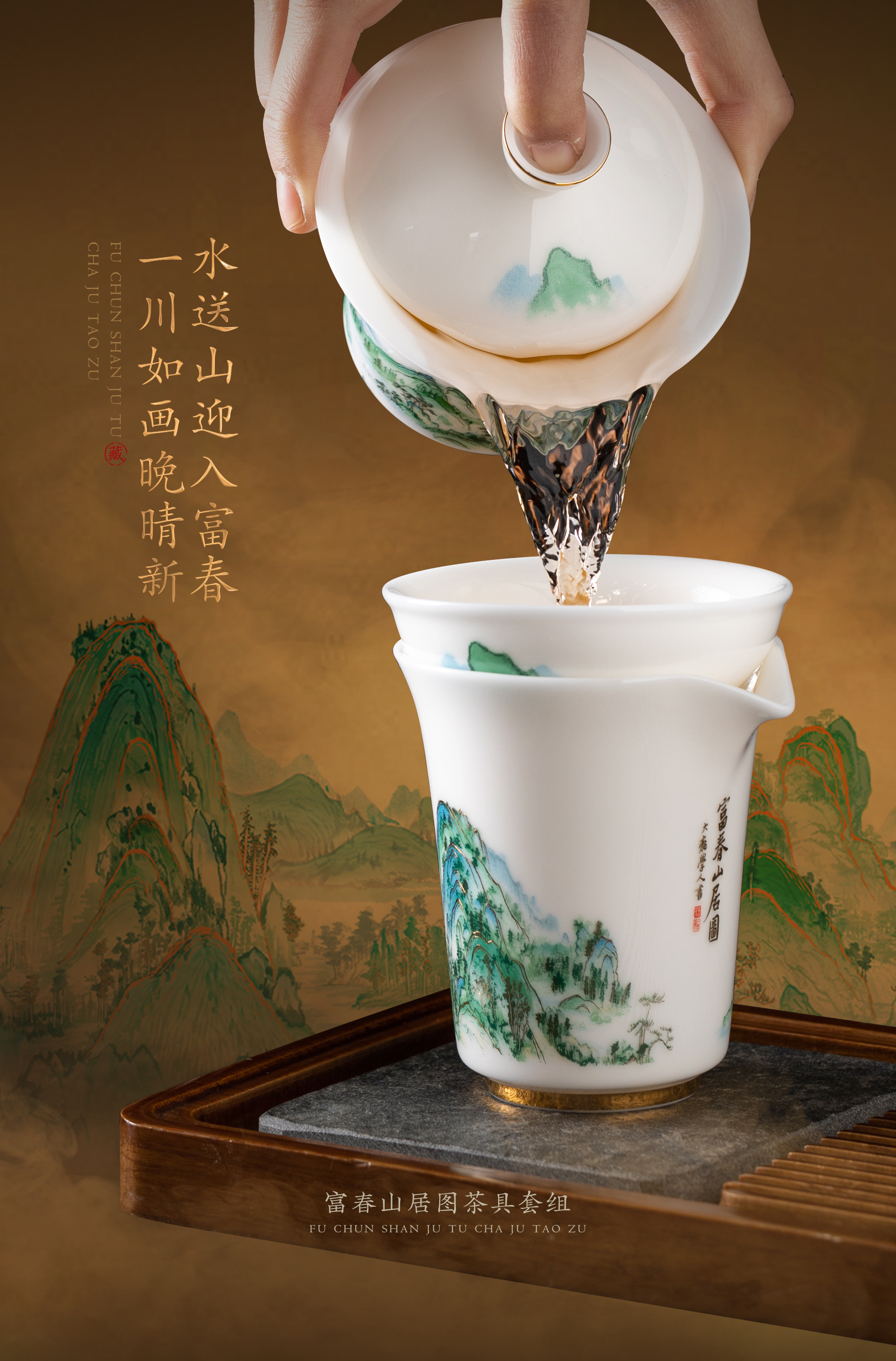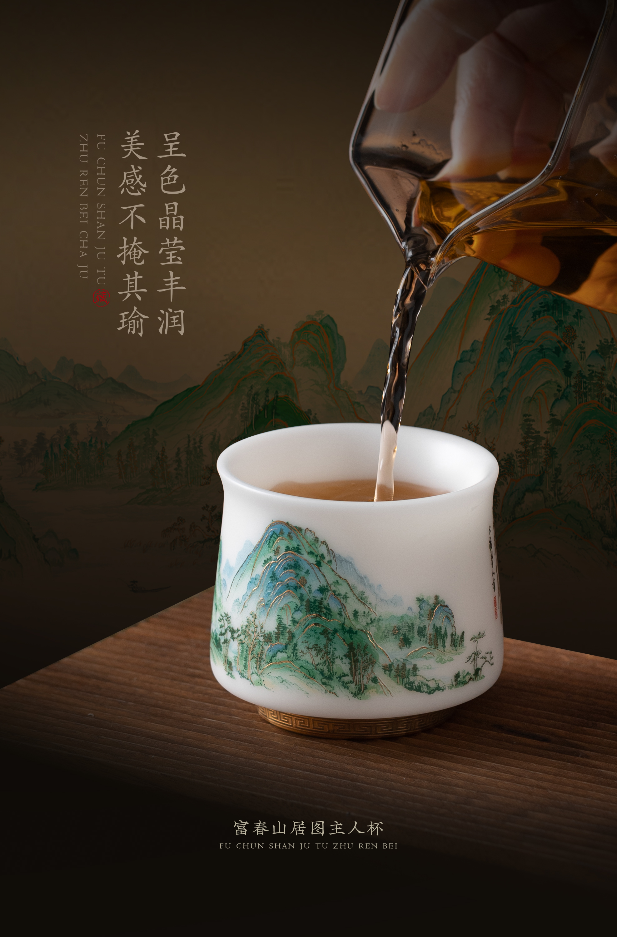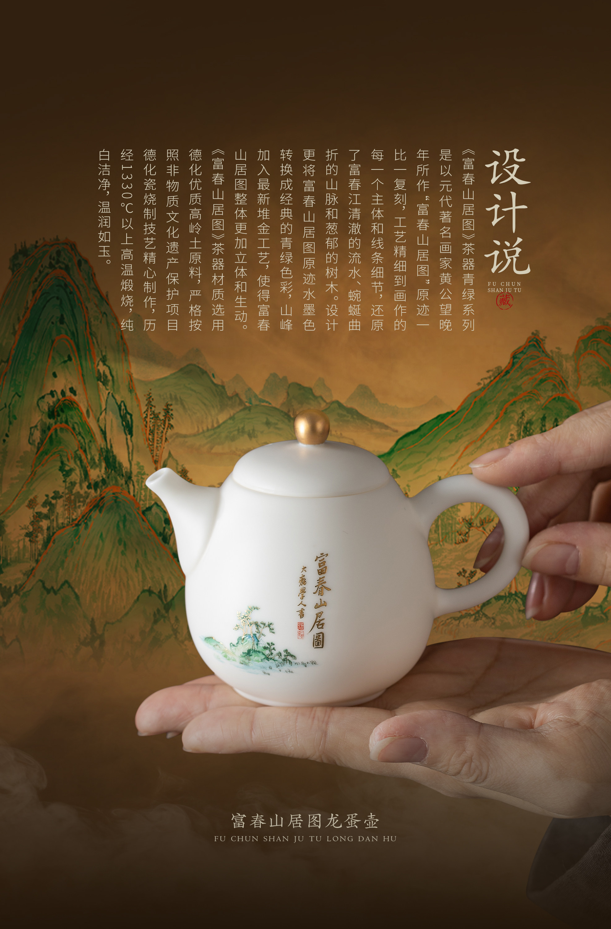 【富春山居图】冰种玉瓷/羊脂玉瓷 茶具套组、主人杯,堆金工艺 触感立体,温润通透 精工复刻,作者签章 品质保证,包装精致 高端好礼